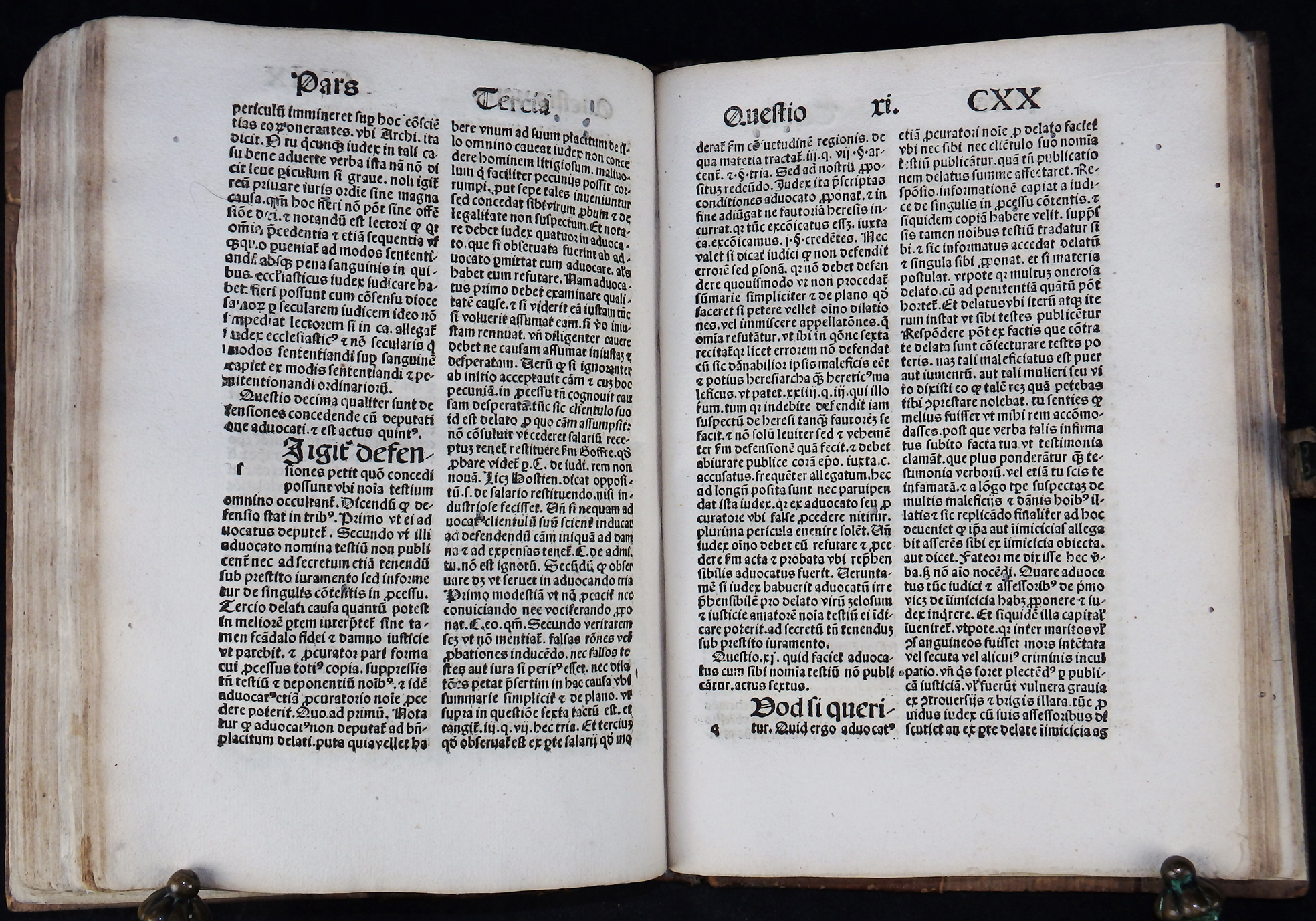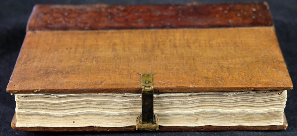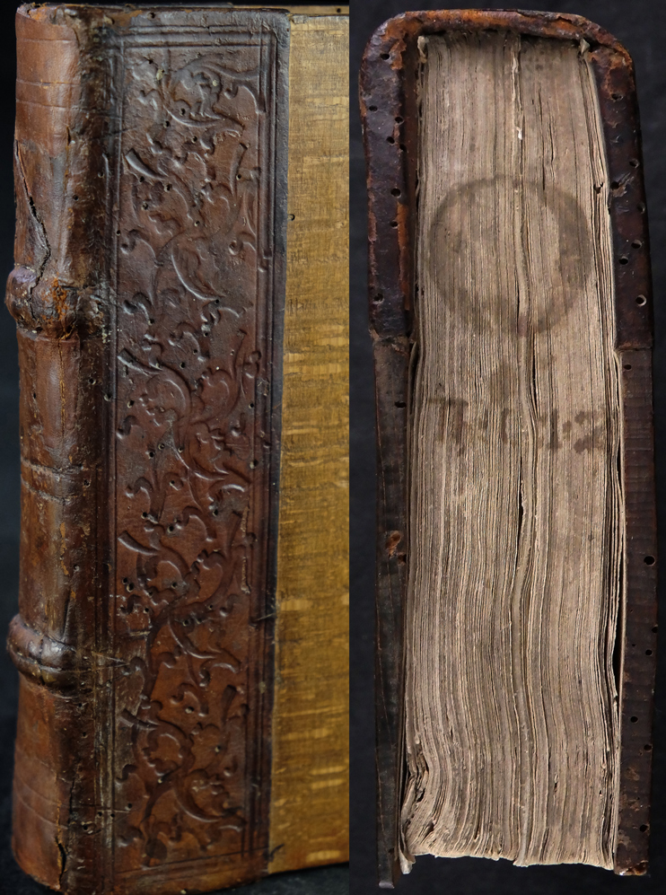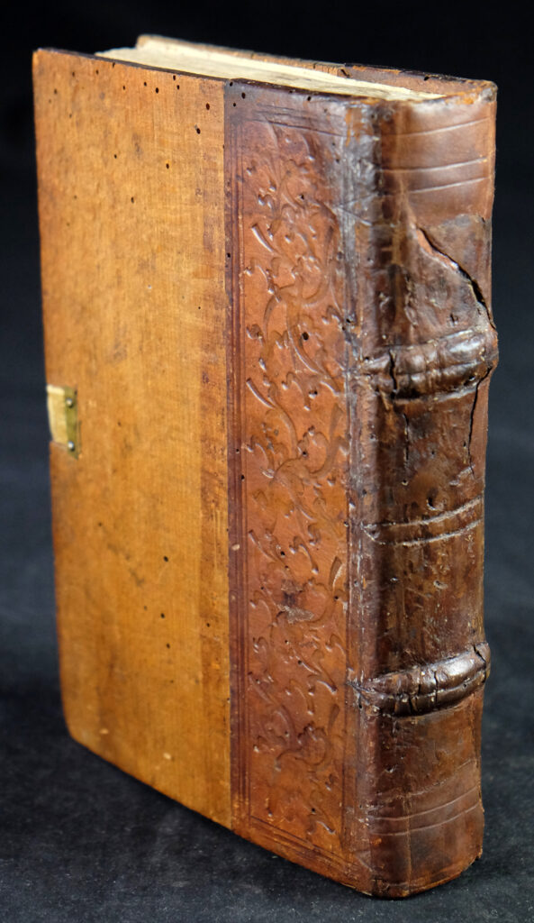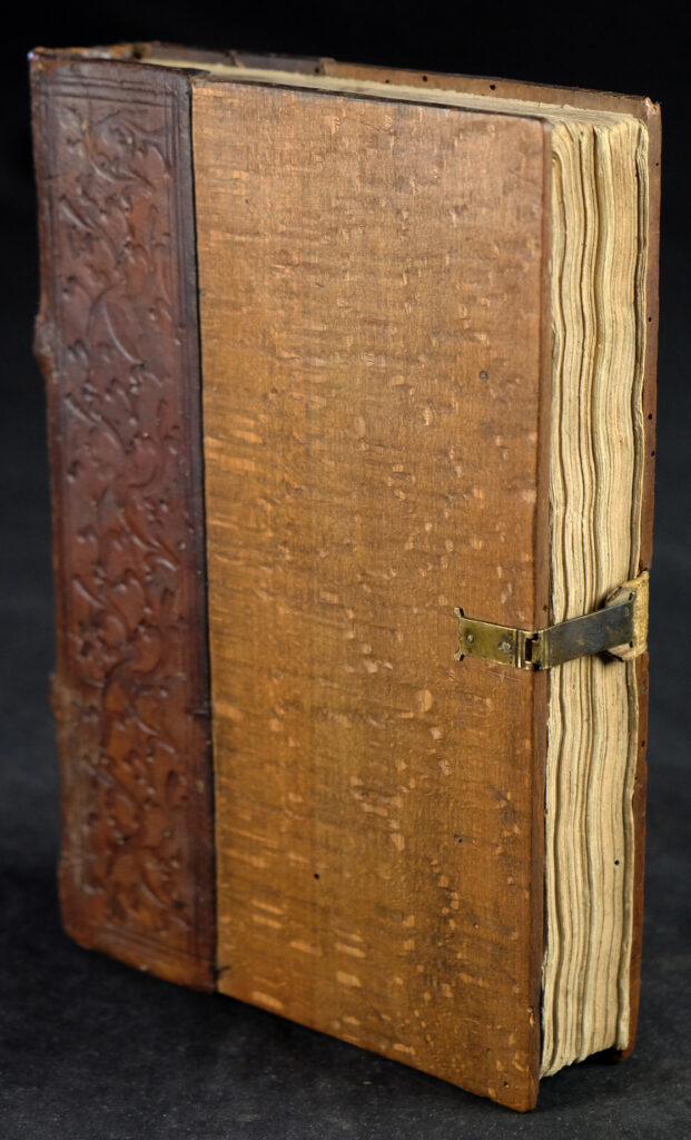 Wohl originaler, restaurierter Holzdeckelband der Zeit. Gebunden auf zwei echten Bünden. Rücken und etwa ein Drittel der Deckel mit dem originalen, blindgeprägten Kalbleder bezogen. Die Blindprägungen, einer wohl süddeutschen Werkstatt, zeigen Rautengerank. Mittig eine intakte Messingschließe. Rücken alt restauriert und mit unterlegten Lederfehlstellen. Bindung fest und stabil und etwas straff. Deckel mit einigen inaktiven Wurmlöchlein.