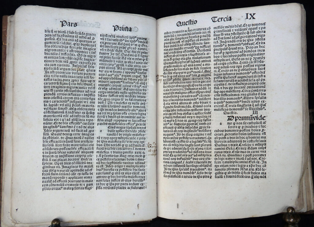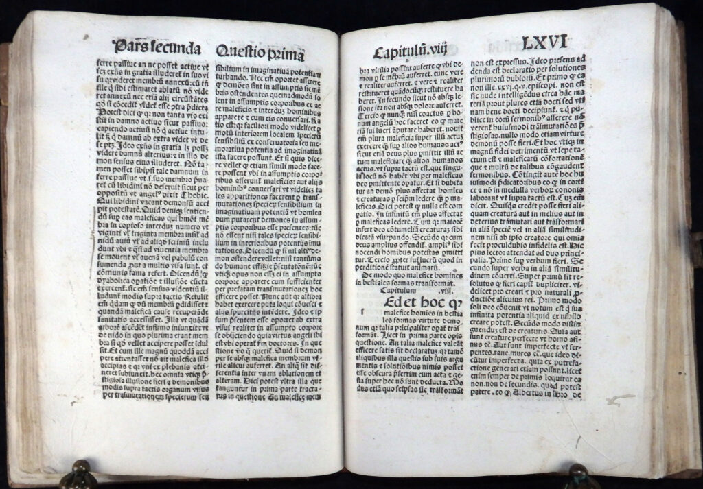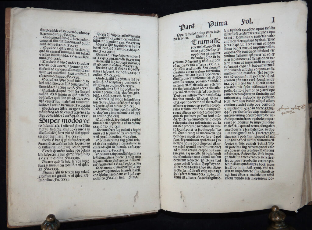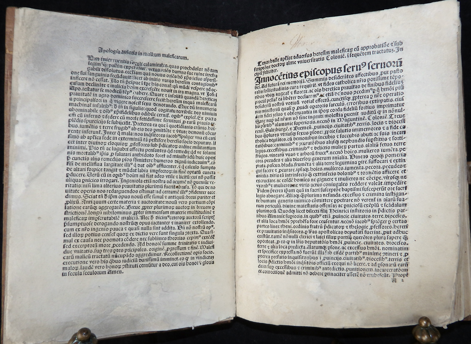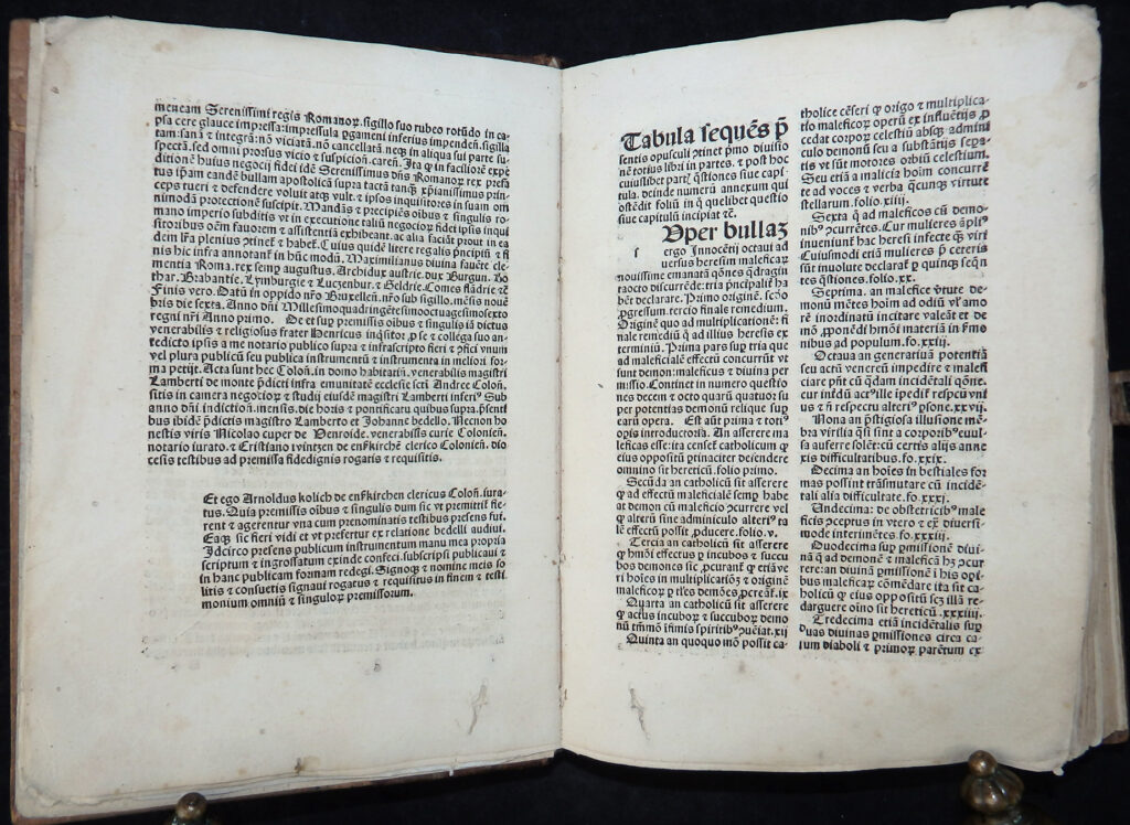 In den Vorstücken die Verteidigung des Werkes durch den Autor (Apologia auctoris), der das Hexenunwesen betreffenden Bulle von Papst Innozenz VIII. „Summis desiderantes affectibus“ (Rom, 5. Dezember 1484) sowie der Approbation durch Professoren der Kölner theologischen Fakultät vom 19. Mai 1487.