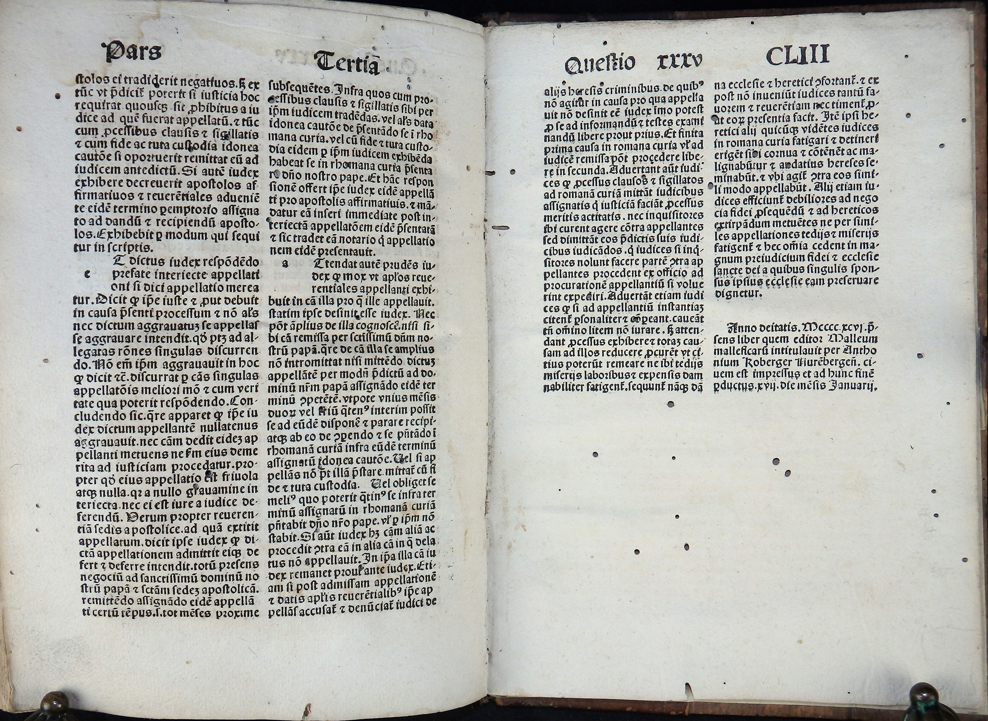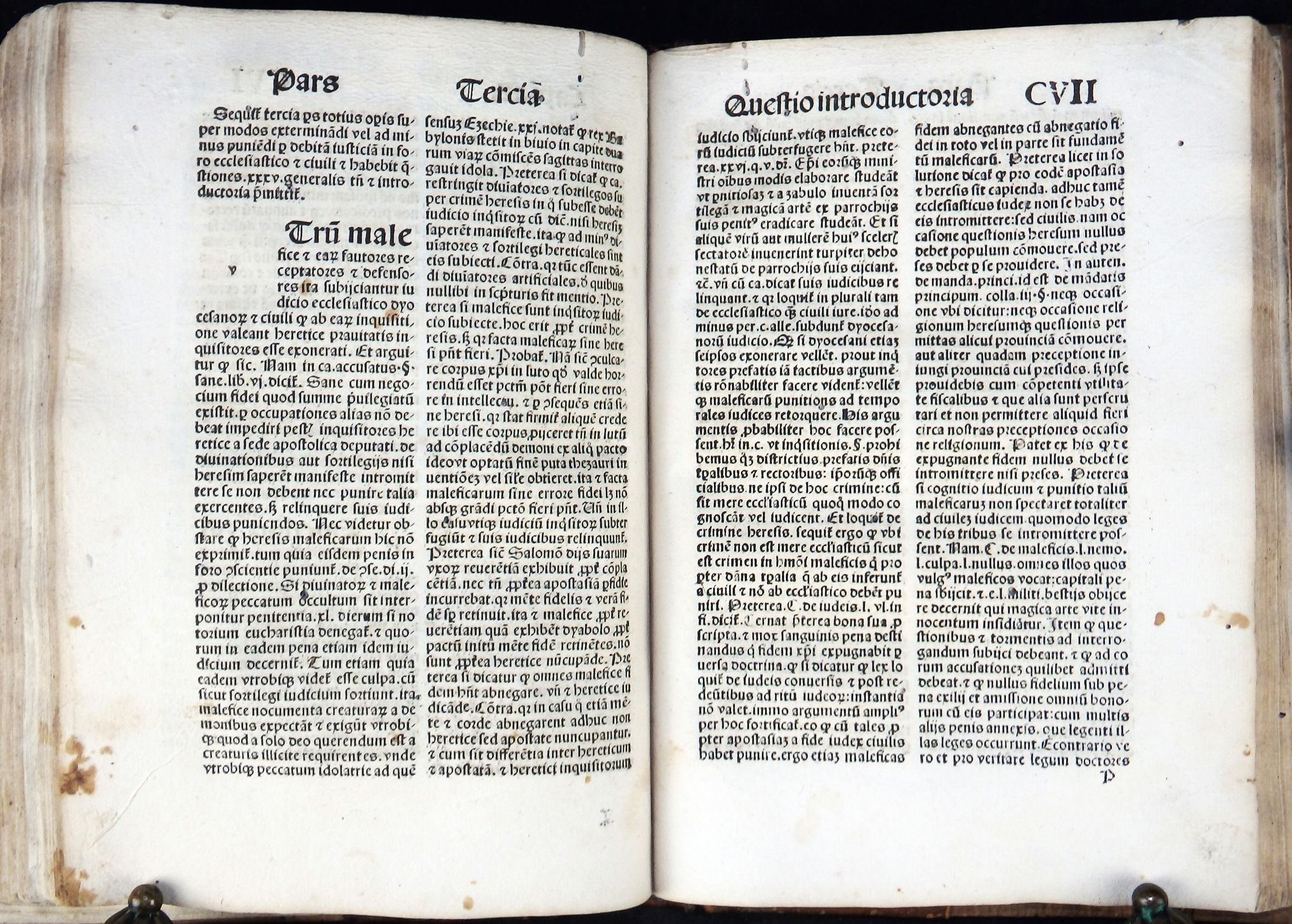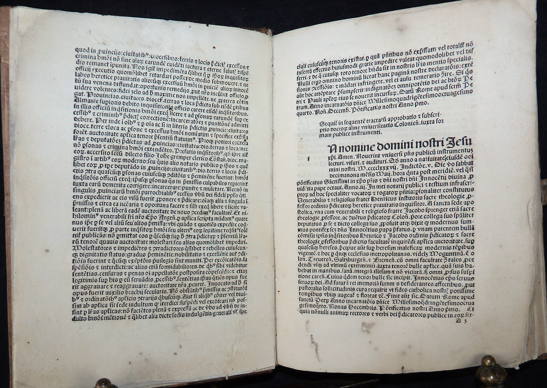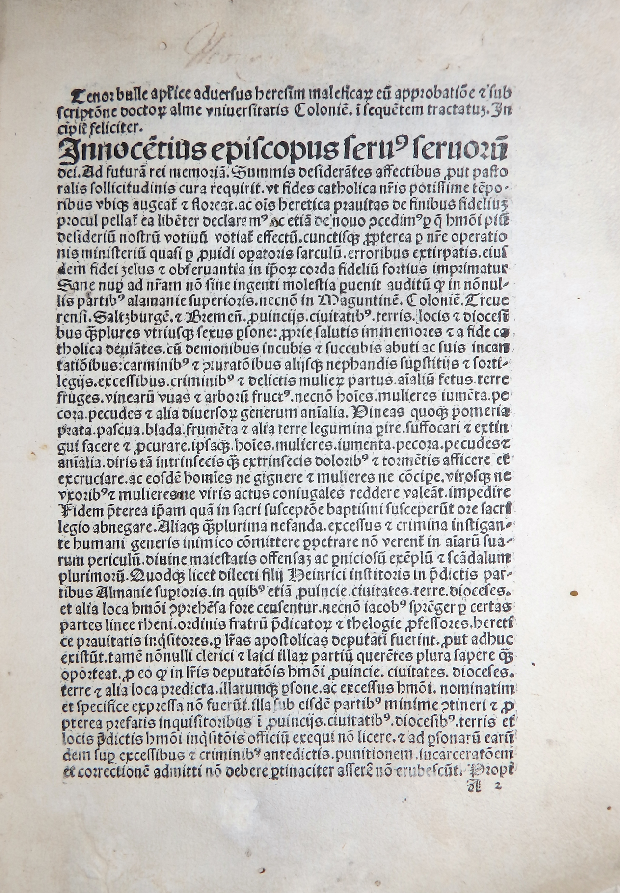 In den Vorstücken die Verteidigung des Werkes durch den Autor (Apologia auctoris), der das Hexenunwesen betreffenden Bulle von Papst Innozenz VIII. „Summis desiderantes affectibus“ (Rom, 5. Dezember 1484) sowie der Approbation durch Professoren der Kölner theologischen Fakultät vom 19. Mai 1487.