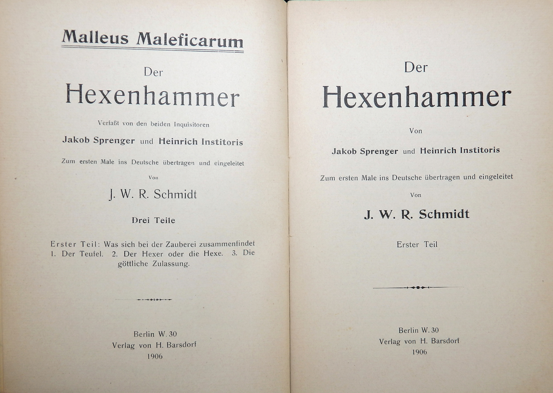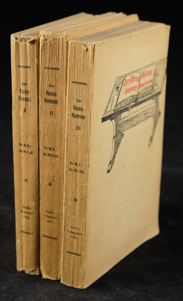 Die erste deutsche Ausgabe des „Malleus Maleficarum“ erfolgte erstaunlicherweise erst im Jahr 1906 (Herausgeber J.W.R. Schmidt, Barsdorf-Verlag Berlin) in drei Bänden, welche wir der hier angebotenen lateinischen Originalausgabe beilegen. Somit erschließt sich auch dem nicht lateinisch beherrschenden Leser die Skurrilität eines der verhängnisvollsten Bücher der Weltliteratur.