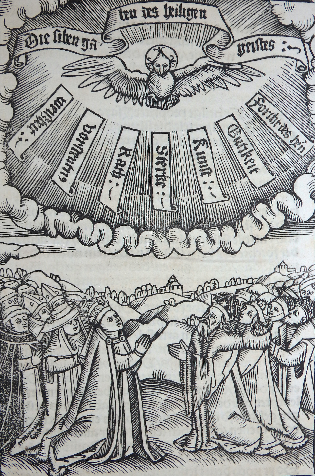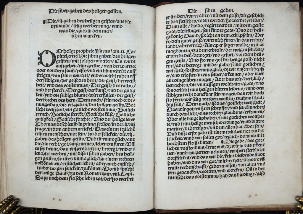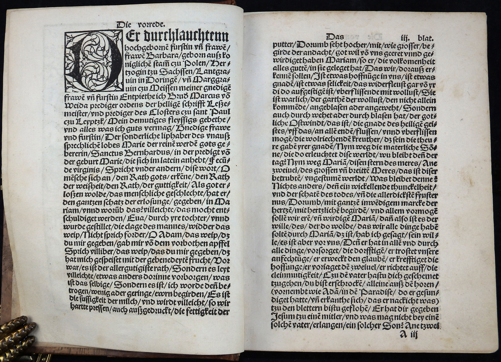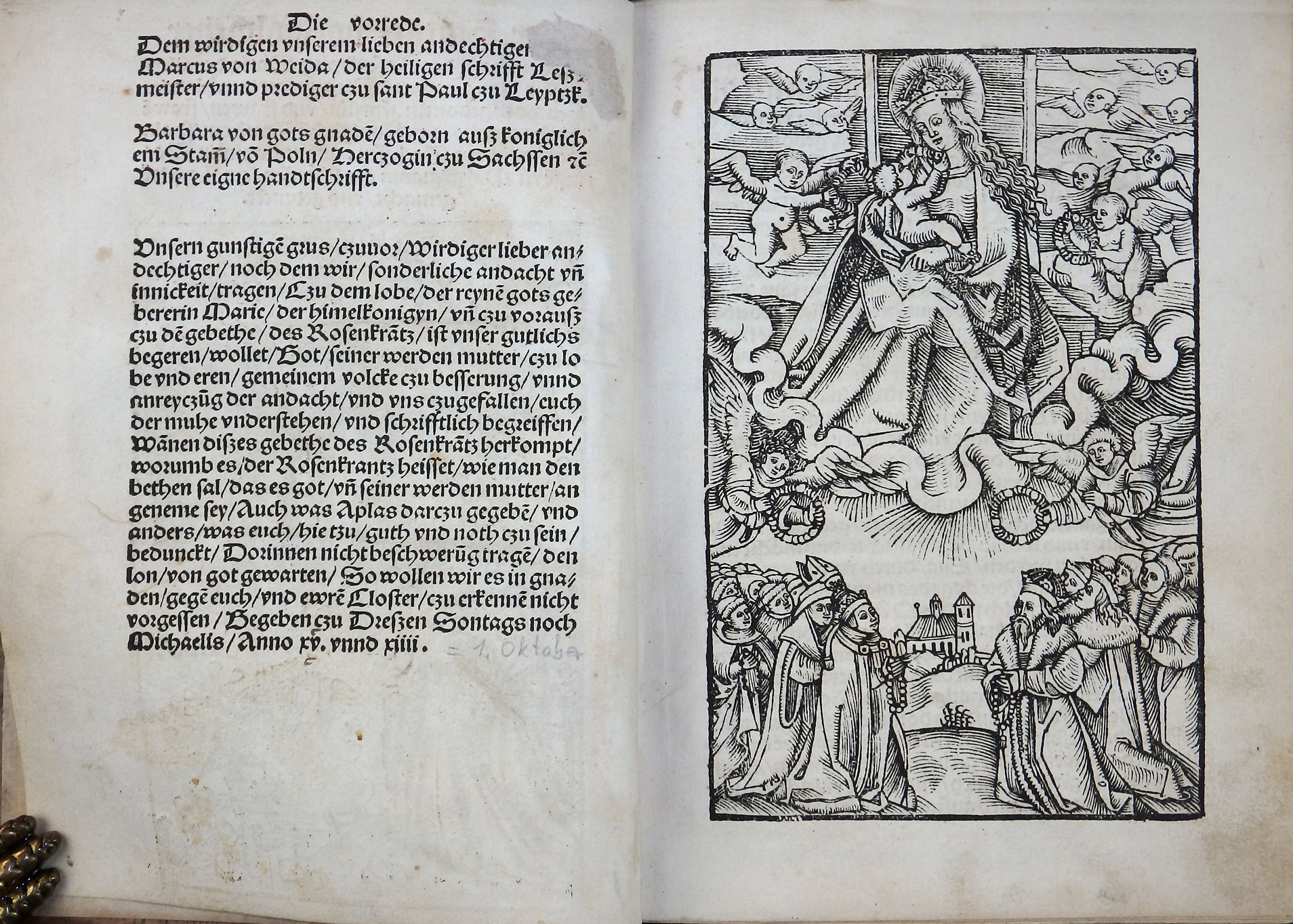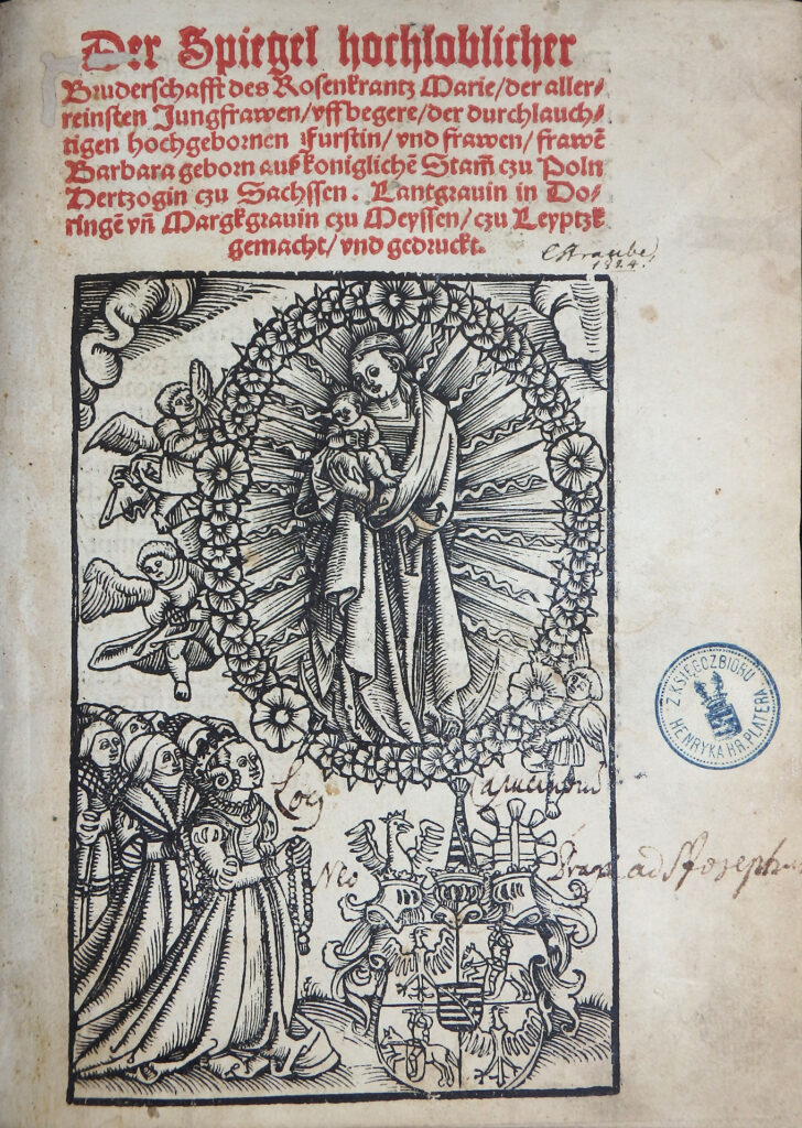 Der Spiegel hochloblicher Bruderschafft des Rosenkrantz Marie der allerreinsten Jungfrawen vff begert der durchlauchtigen hochgebornen Furstin vnd frawen frawe Barbara geborn auß koniglichẽ Stam̃ czu Poln Hertzogin czu Sachssen. Lantgrauin in Doringẽ vñ Margkgrauin czu Meyssen, czu Leyptzk gemacht vnd gedruckt.