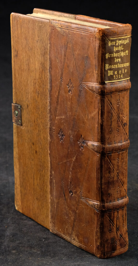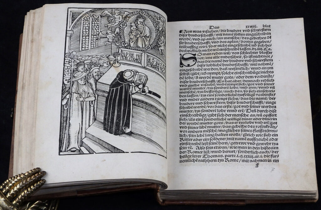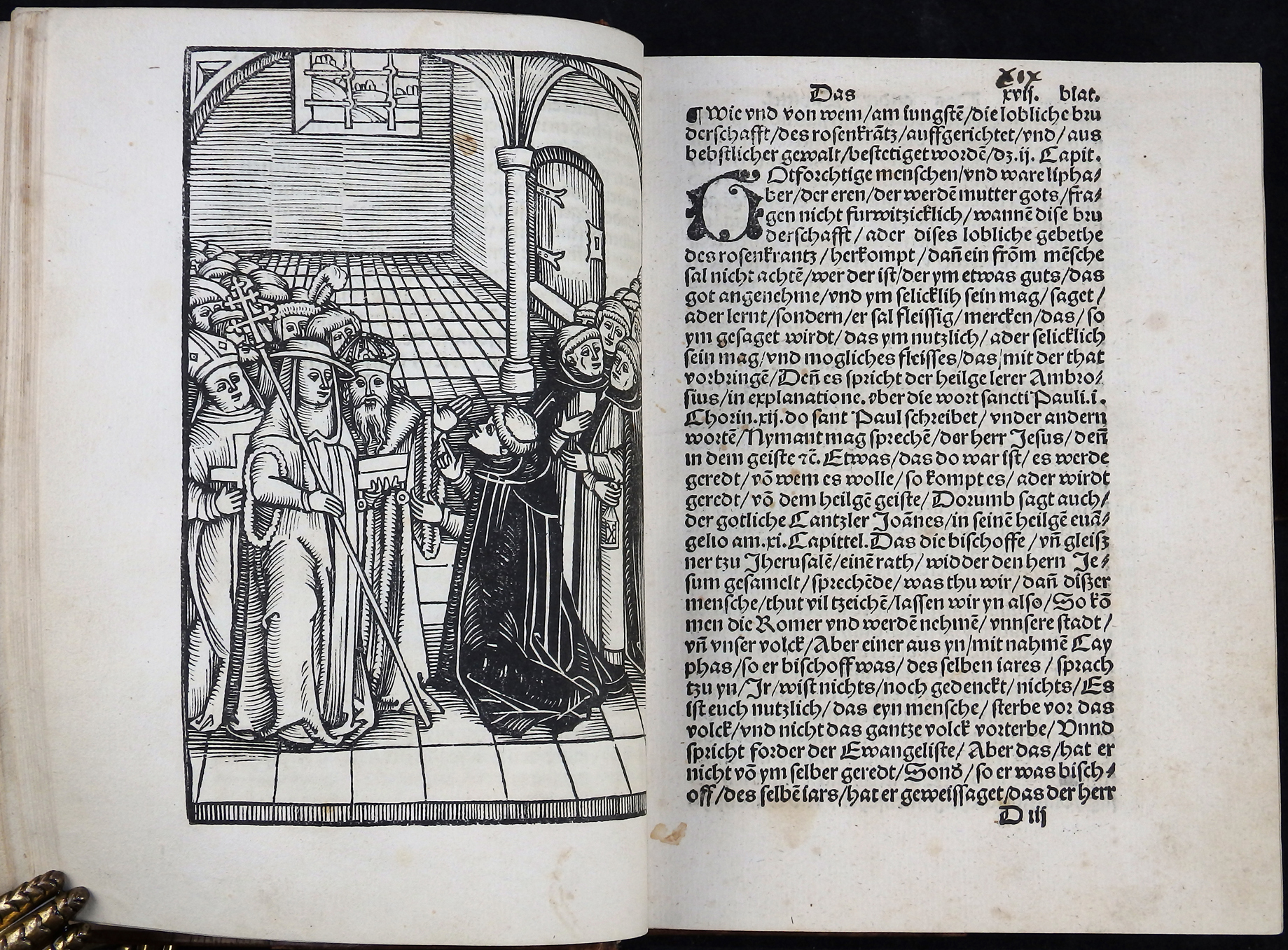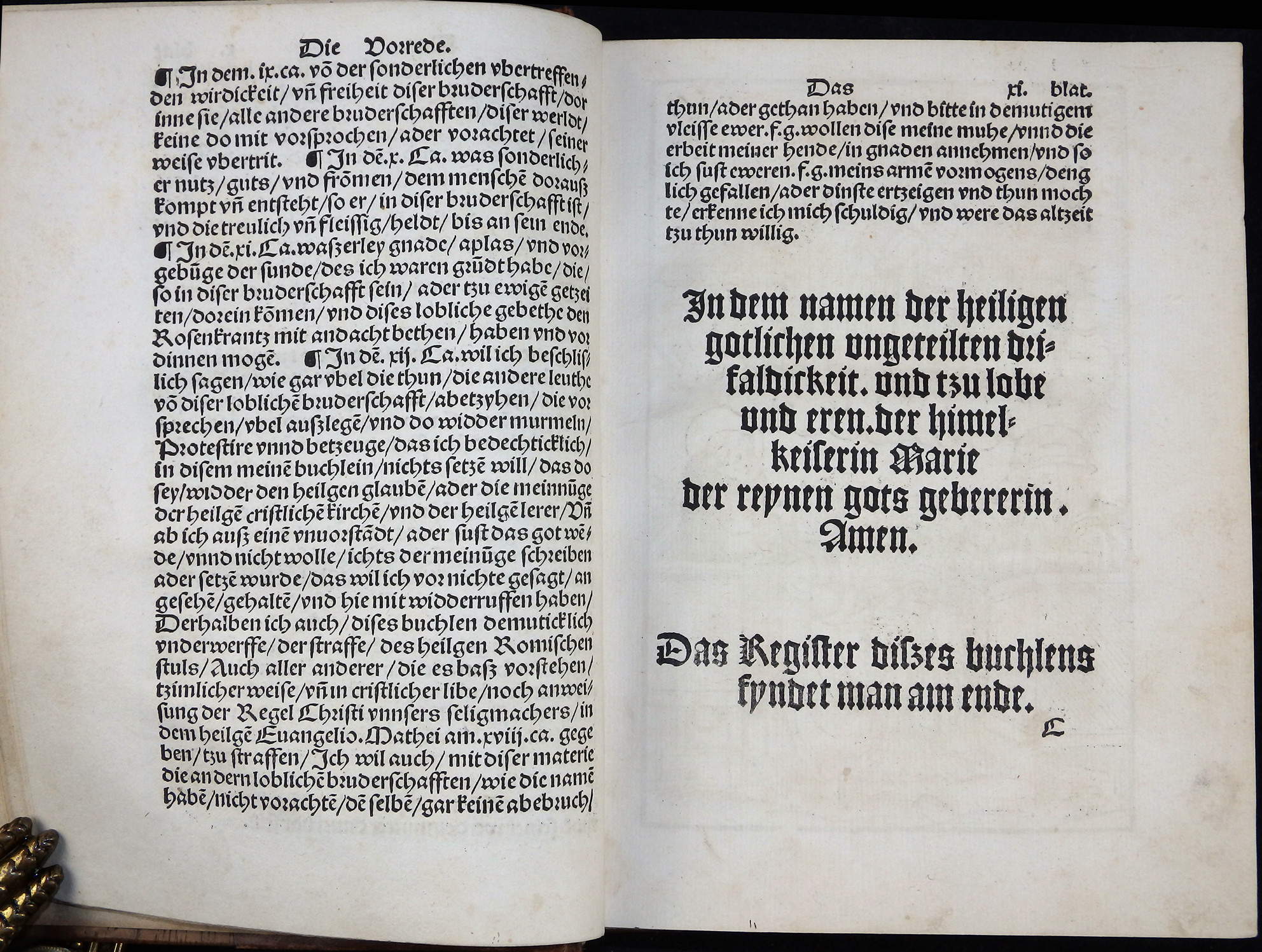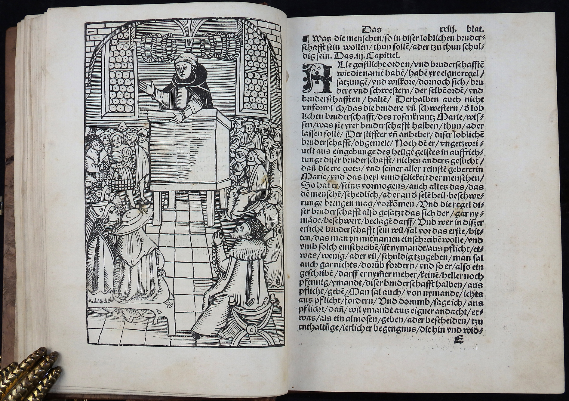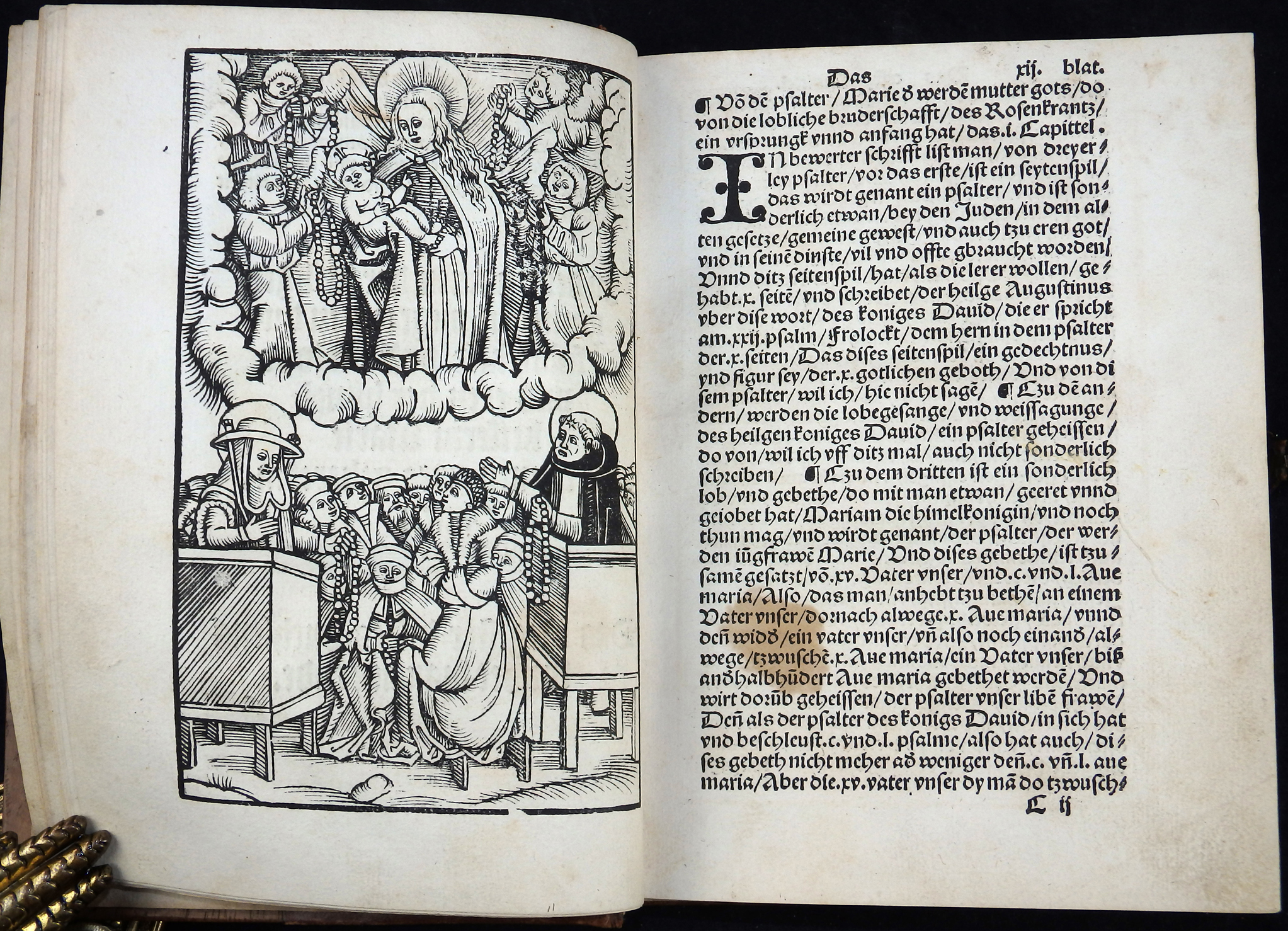 Erste und einzige Ausgabe dieses prachtvoll gestalteten Holzschnittbuches aus der Frühzeit der Marienverehrung mit dem Rosenkranz und der sich dabei bildenden Bruderschaften, die (entsprechend den Rosenkranzgesetzen) mindestens aus 15 Personen bestanden. Vorliegendes Werk ist ein enzyklopädisches Handbuch zur Rosenkranz-Frömmigkeit und speziell zur Organisation, Praxis und Zielsetzung der Rosenkranz-Bruderschaften. Es enthält Anleitungen und Begründung des Rosenkranzgebets sowie eine systematische Darstellung der Rosenkranz-Bruderschaft (Aufnahme, Pflichten, Gebetsweise, geistliche Vorteile). Der Ton ist katechetisch-praktisch. Marcus von Weida bündelt Quellenwissen zu Geschichte und Praxis des Rosenkranzes und führt in die confraternitas als fromme Laienbewegung ein.
