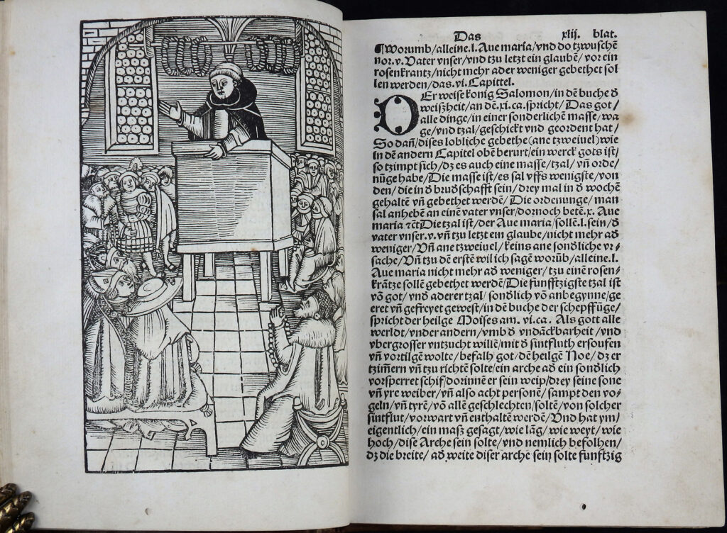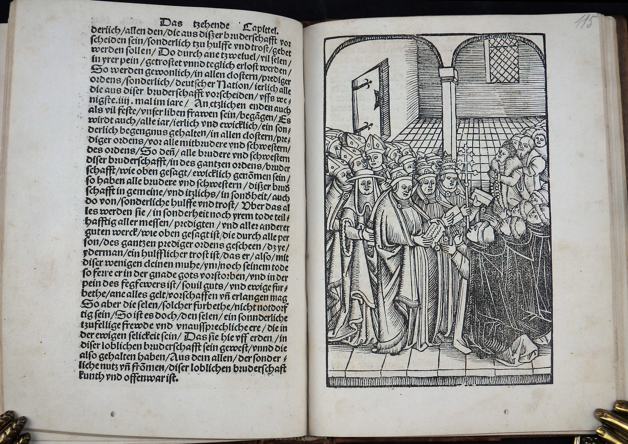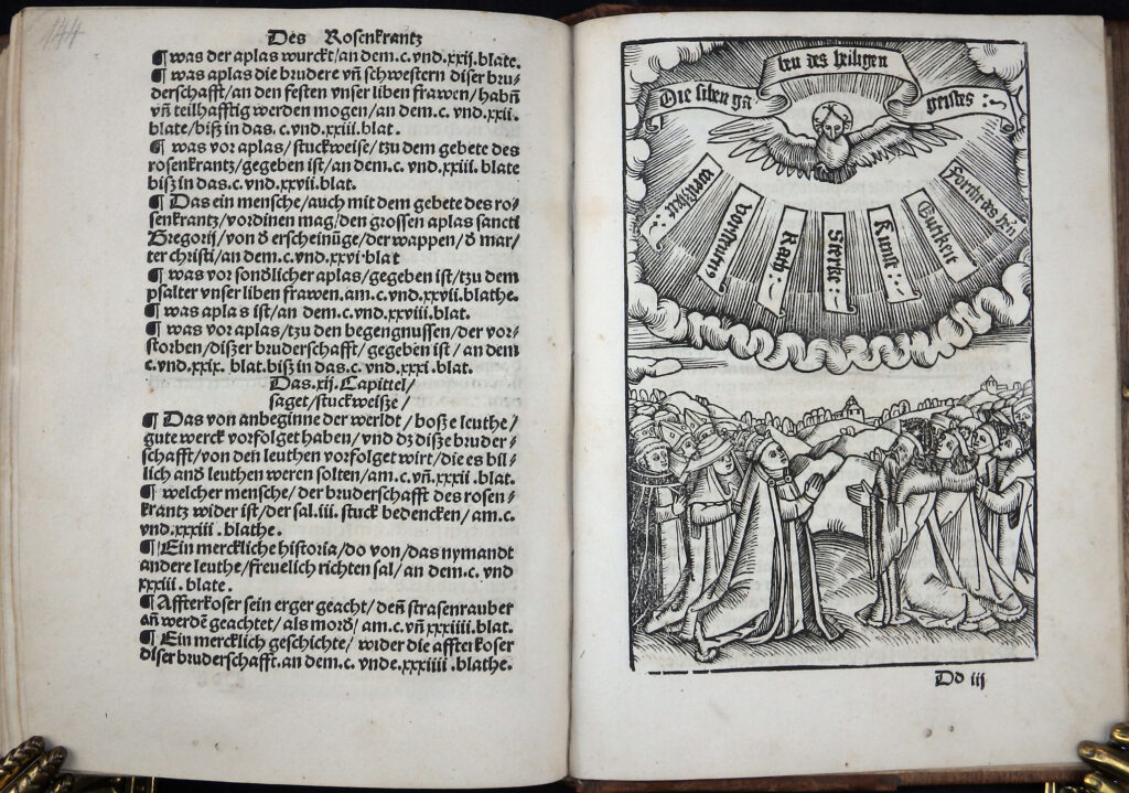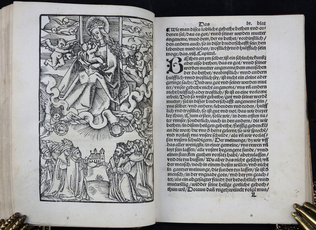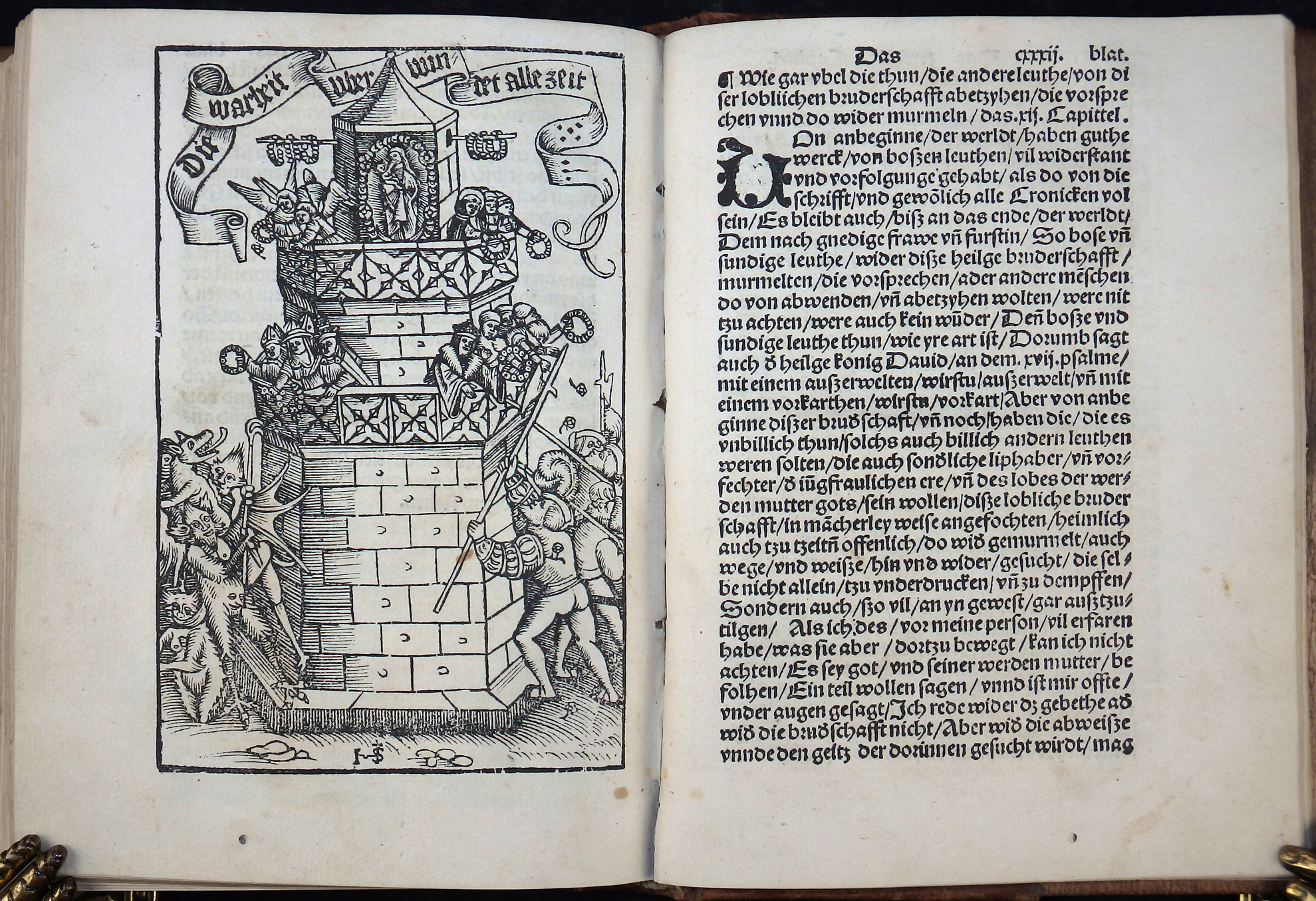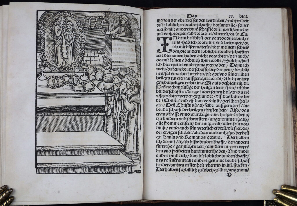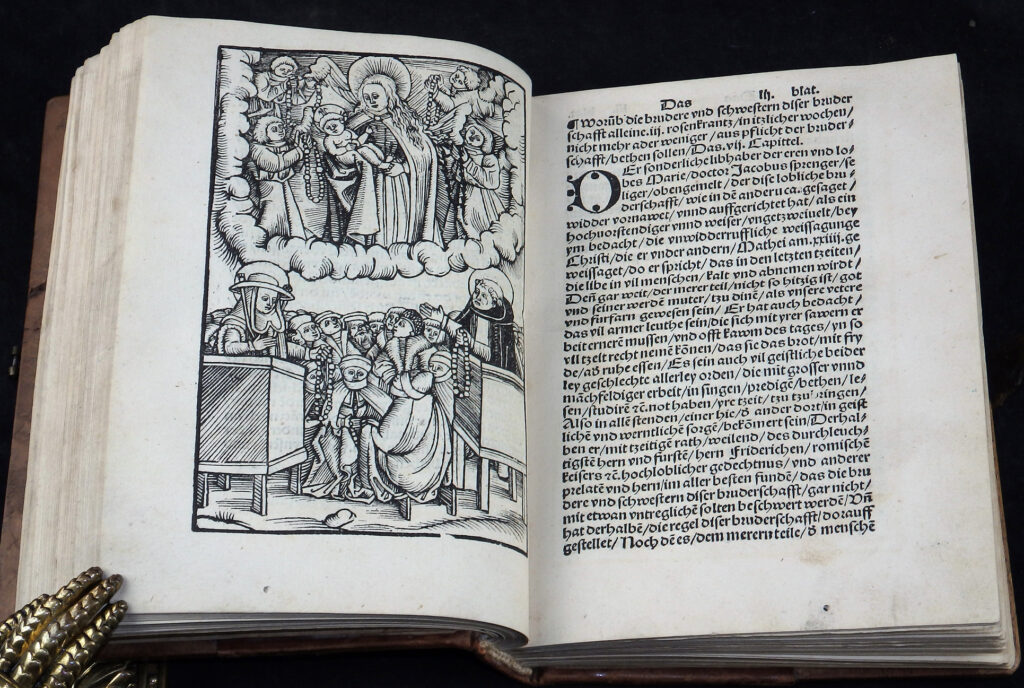 Erste und einzige Ausgabe dieses prachtvoll gestalteten Holzschnittbuches aus der Frühzeit der Marienverehrung mit dem Rosenkranz und der sich dabei bildenden Bruderschaften, die (entsprechend den Rosenkranzgesetzen) mindestens aus 15 Personen bestanden. Vorliegendes Werk ist ein enzyklopädisches Handbuch zur Rosenkranz-Frömmigkeit und speziell zur Organisation, Praxis und Zielsetzung der Rosenkranz-Bruderschaften. Es enthält Anleitungen und Begründung des Rosenkranzgebets sowie eine systematische Darstellung der Rosenkranz-Bruderschaft (Aufnahme, Pflichten, Gebetsweise, geistliche Vorteile). Der Ton ist katechetisch-praktisch. Marcus von Weida bündelt Quellenwissen zu Geschichte und Praxis des Rosenkranzes und führt in die confraternitas als fromme Laienbewegung ein.