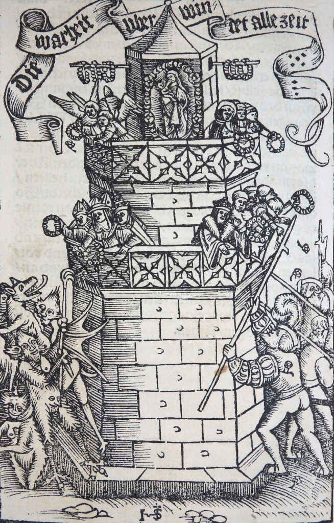 Die Holzschnitte mit dem Monogramm werden von F.T. Schulz (in Thieme-Bd. XXXIV, 504) dem Augsburger Drucker Heinrich Steiner als Formschneider zugewiesen, was wir in Frage stellen. Vielmehr schließen wir uns der These von Nagler (Monogramme III, 1449, Nr.5) und Geisberg (Buch & Schrift I/4927, S. 96 ff.) an, welche das Monogramm „HS mit Kreuz“ Heinrich Vogtherr dem Älteren (auch Heinrich Satrapitanus) zuschreiben.
