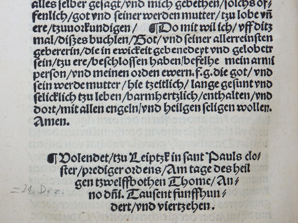 Druckervermerk „Gedruckt tzu Leiptzk durch Melchior Lotter in der Hawstrassze. Anno dñi Tausent funffhũ|dert funfftzen in d ́Fasten am Sonabendt nach dem Sontage Reminiscere.“ auf Blatt Bb5.