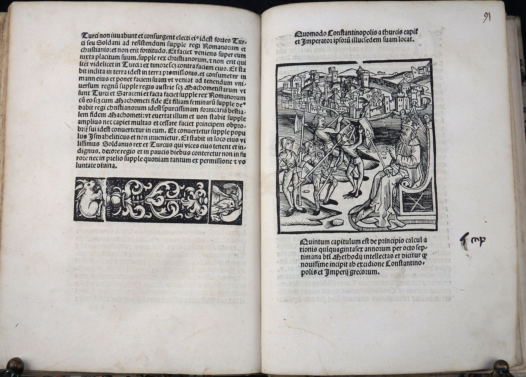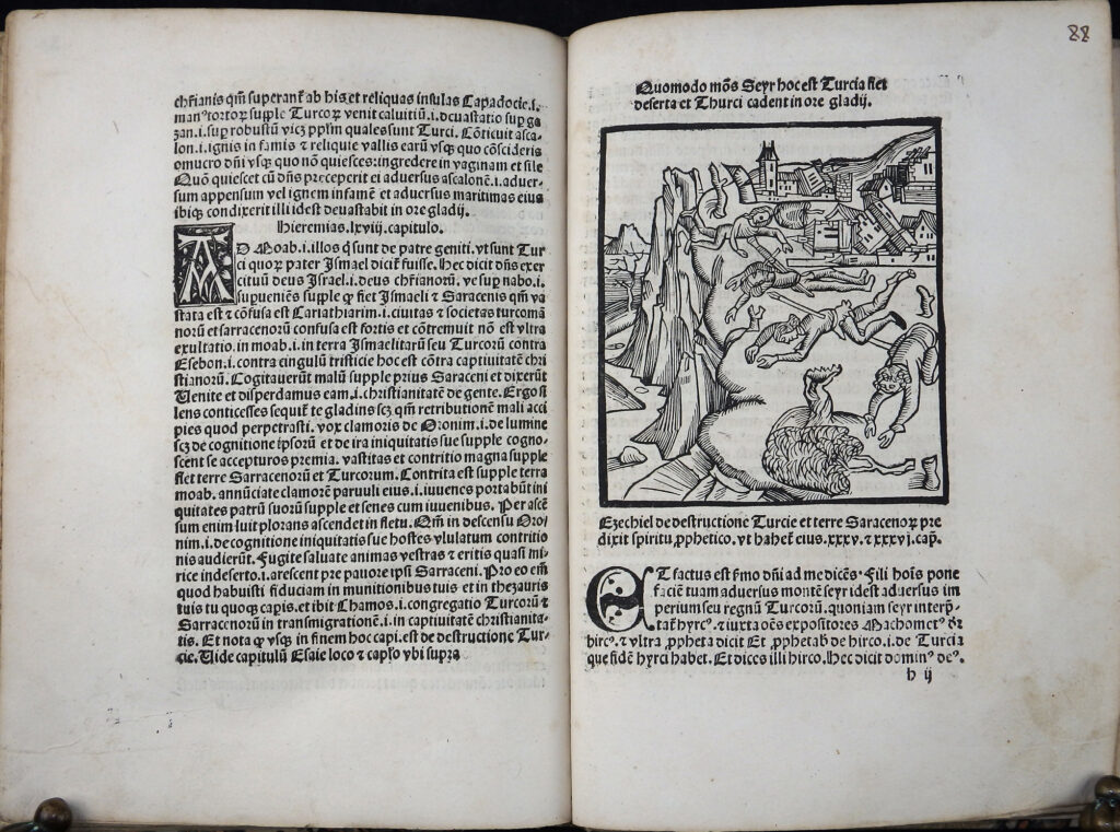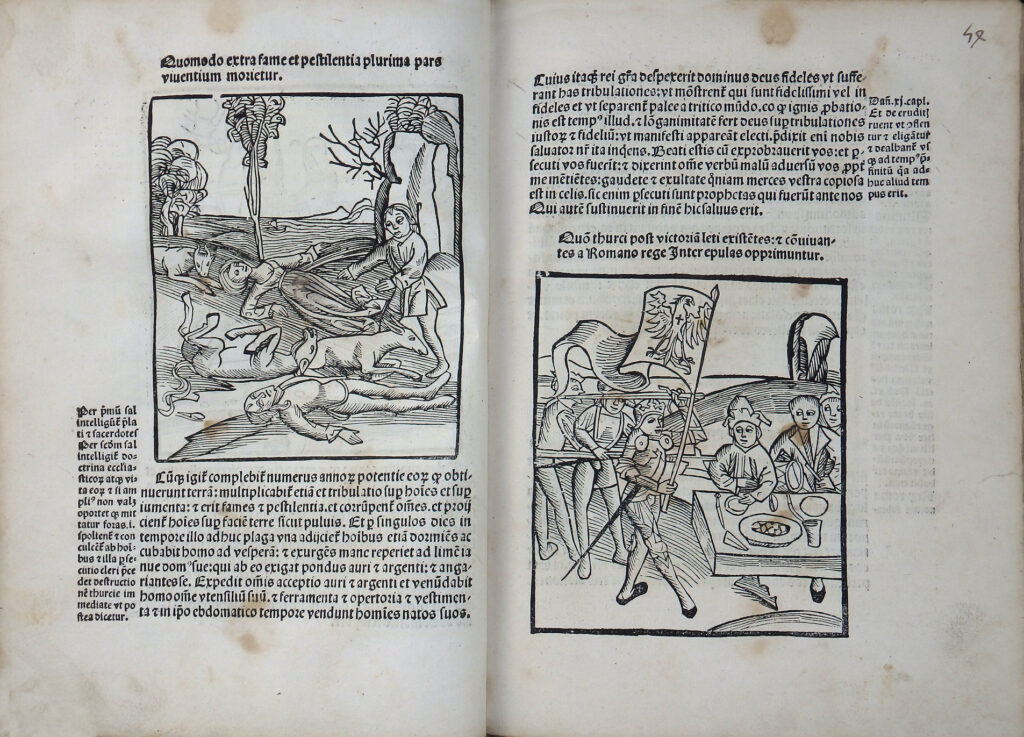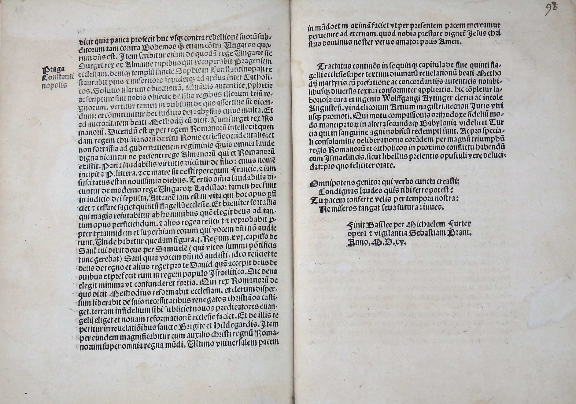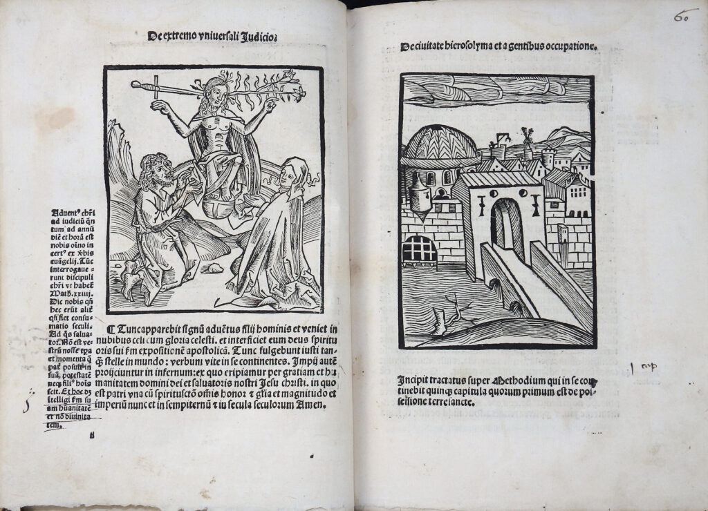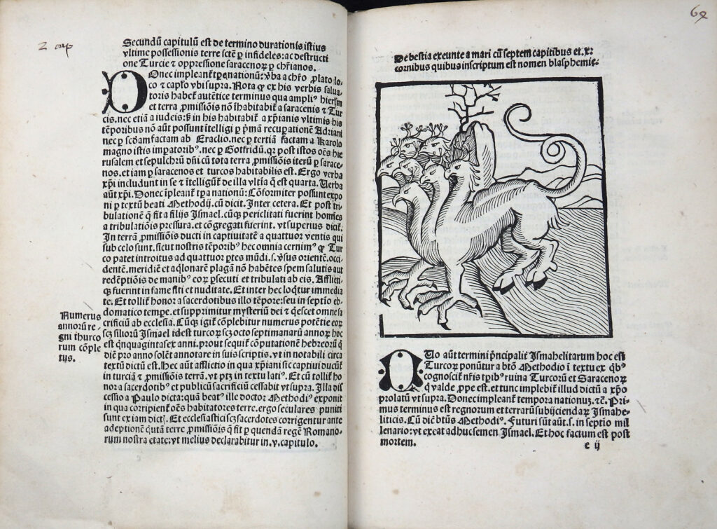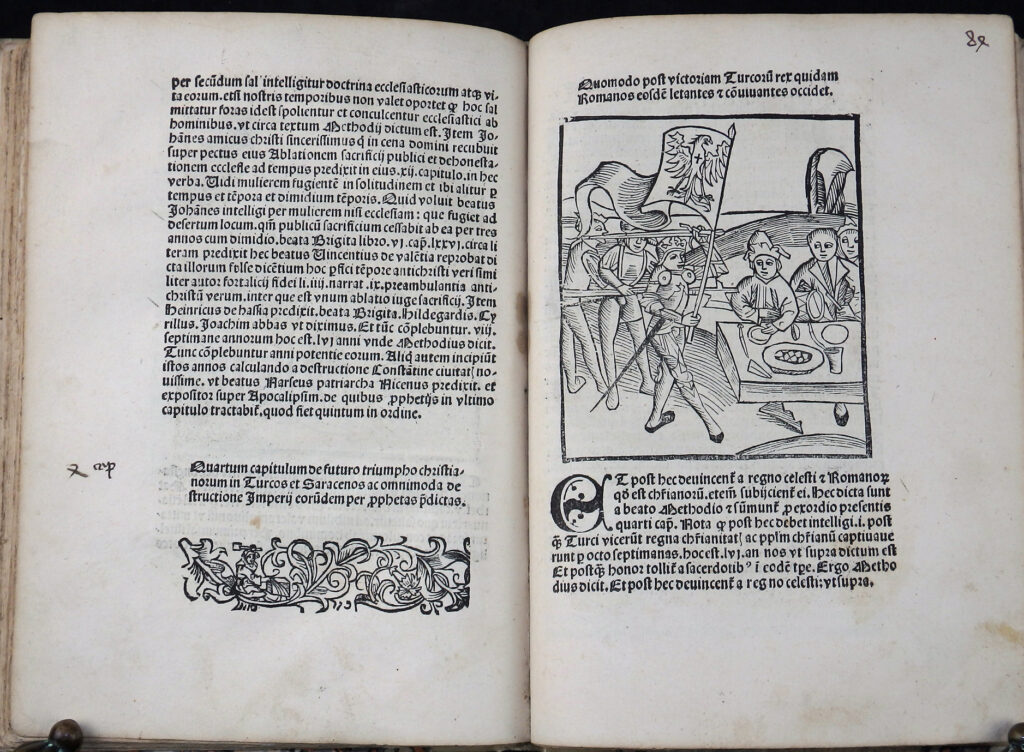 Sehr seltene, prachtvoll illustrierte Ausgabe mit den für die heutige Zeit sehr aktuellen Offenbarungen des Pseudo-Methodius. Vierte illustrierte Auflage mit den Holzschnitten der Erstausgabe von 1498. Diese wurde auf Bestreben Sebastian Brants mit zahlreichen Holzschnitten illustriert. Brant sah die Zeit nach den italienischen und türkischen Kriegen, päpstlichen Spaltungen etc. als Vorzeichen der Endzeit. Er wollte mit dem Druck Methodius als moralisch-politische Warnschrift verbreiten. Brant sah 1515 als ein apokalyptisches Jahr und betont, dass der Text zur Mahnung und Buße dienen soll. Der Text betont den Verfall der Sitten und die Zunahme der Ungerechtigkeit. Es bietet einen Überblick über die Geschichte der Weltreiche (Paradigma: Assyrer, Perser, Griechen, Römer), mit der Konsequenz, dass Gott jedes Reich nur für begrenzte Zeit gewährt, bis es abfällt.