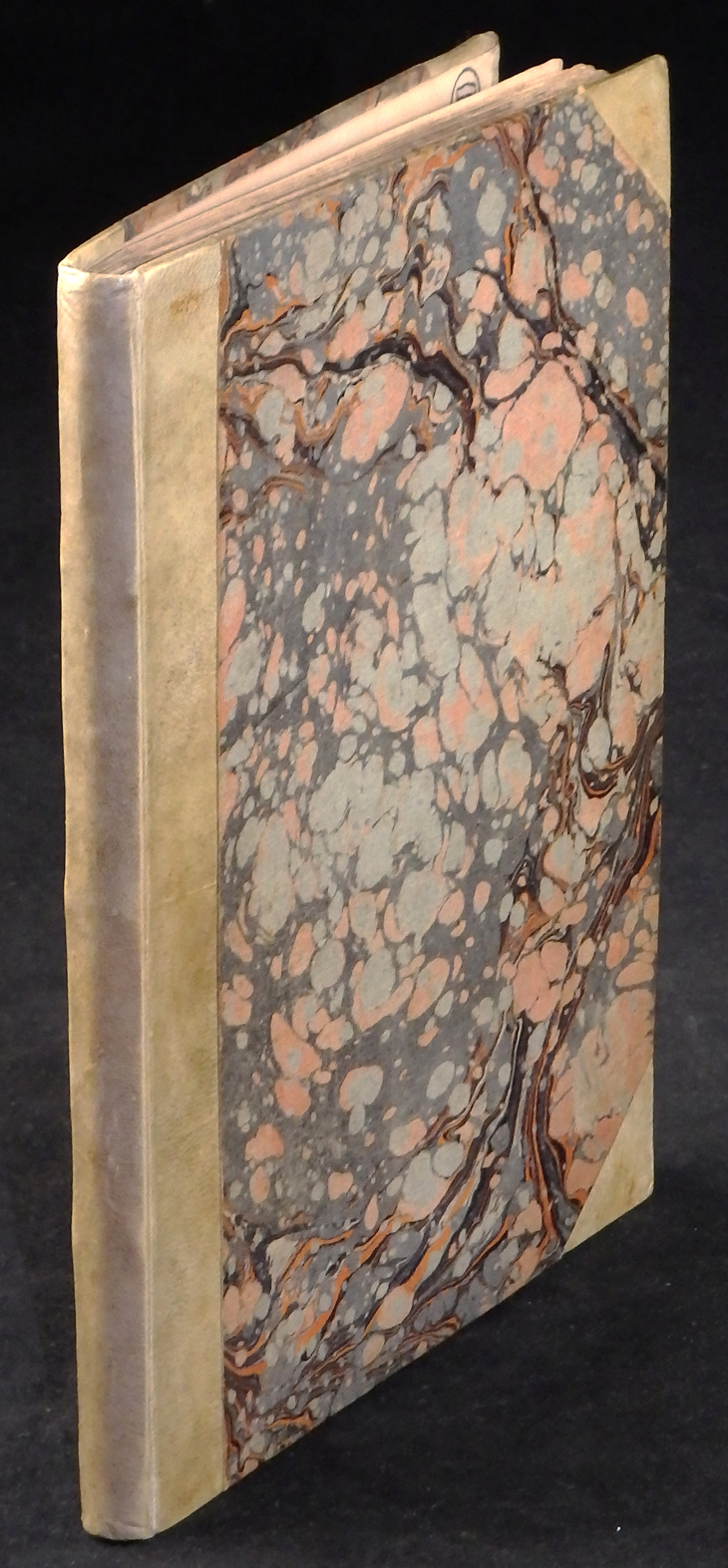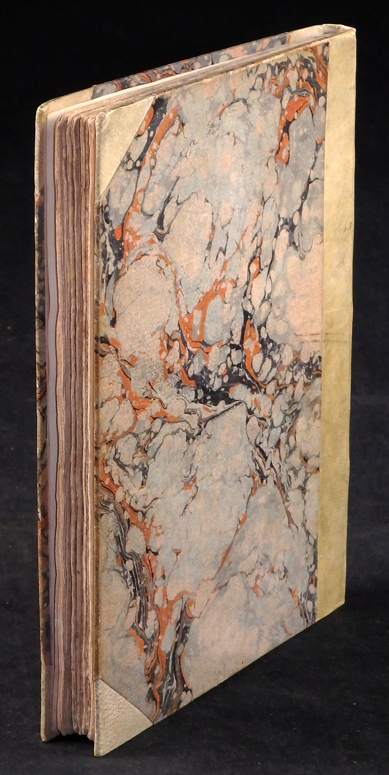 Halbpergamenteinband des 19. Jahrhunderts. Pergemntrücken und –ecken, die Deckel mit Marmorpapier bezogen. Guter Zustand.