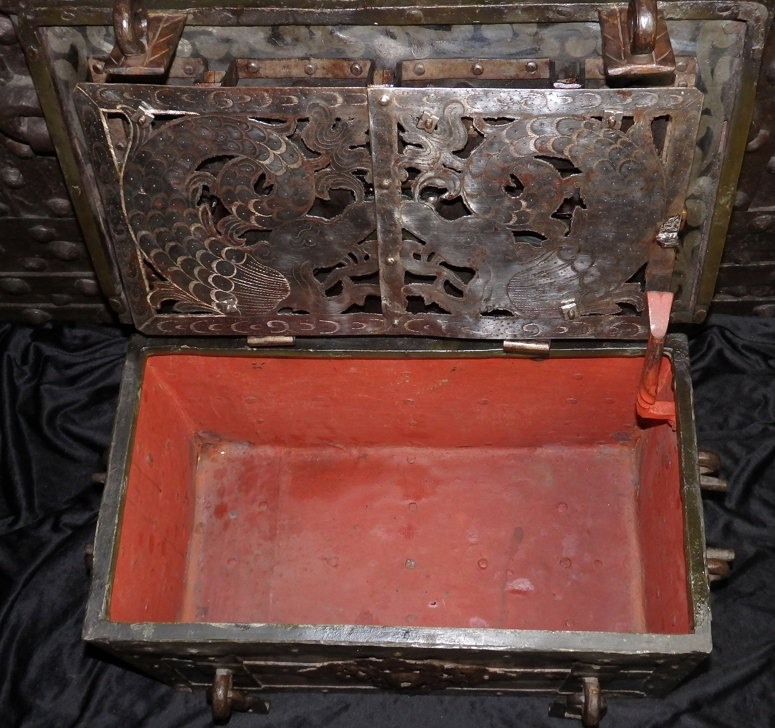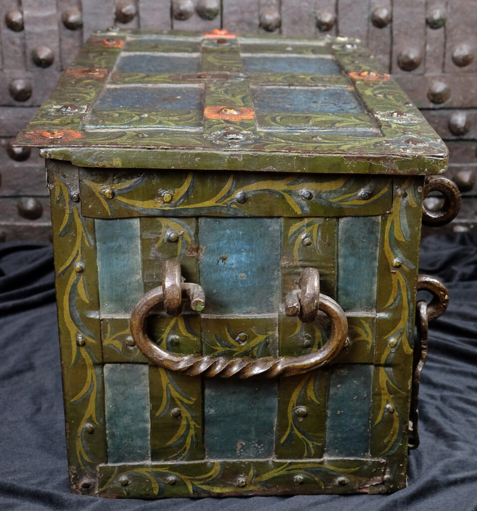 Barocke bemalte Eisentruhe mit zwei Hangschlössern.
