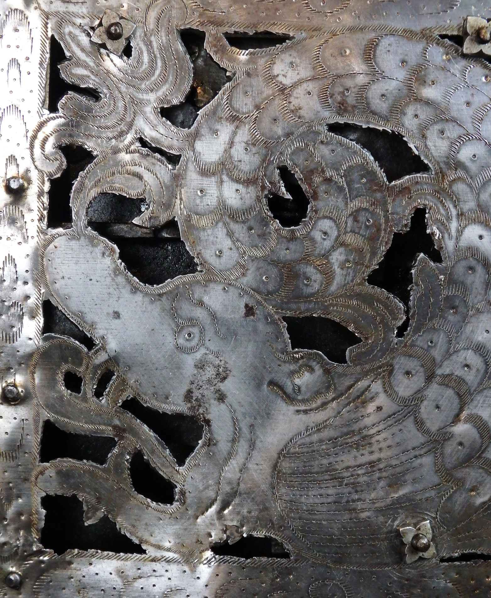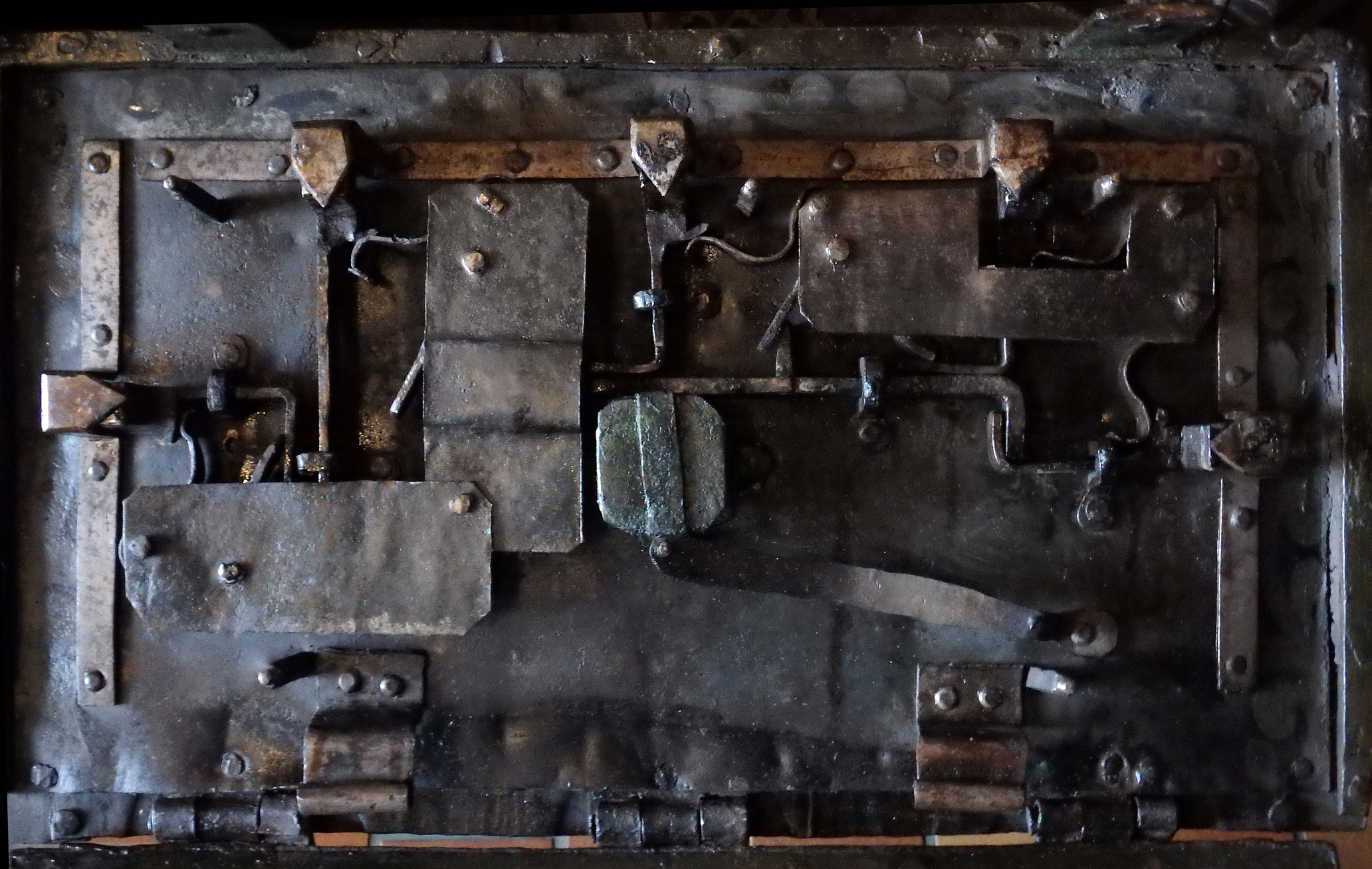 Die beiden aus dem 17. Jahrhundert stammenden Kleeblattschlösser passen sich hervorragend in die Optik der Truhe ein. Gern kann die Truhe auch ohne diese oder mit anderen Schlössern erworben werden.
