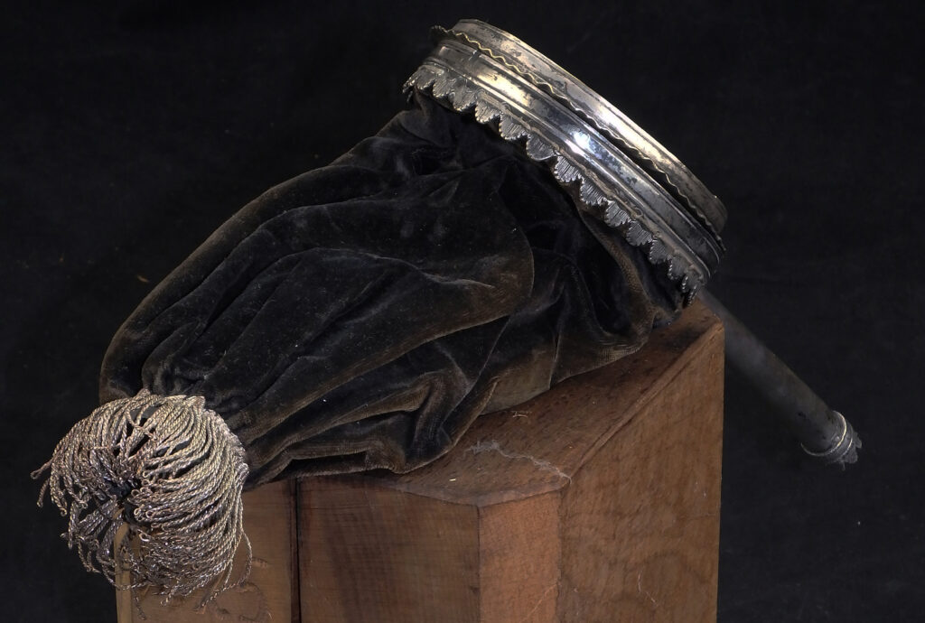 Das Sammeln der Kollekte fand in Kirchgemeinden meist über einen solchen Klingelbeutel statt, der an einem langen Holzstab sogar durch die Bankreihen gereicht werden konnte. Dieses Exemplar ist in seiner Gestaltung aufwändig und unterstreicht damit eine größere Bedeutung des Stückes.