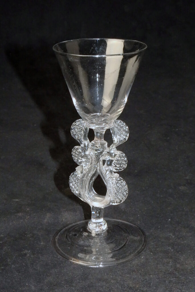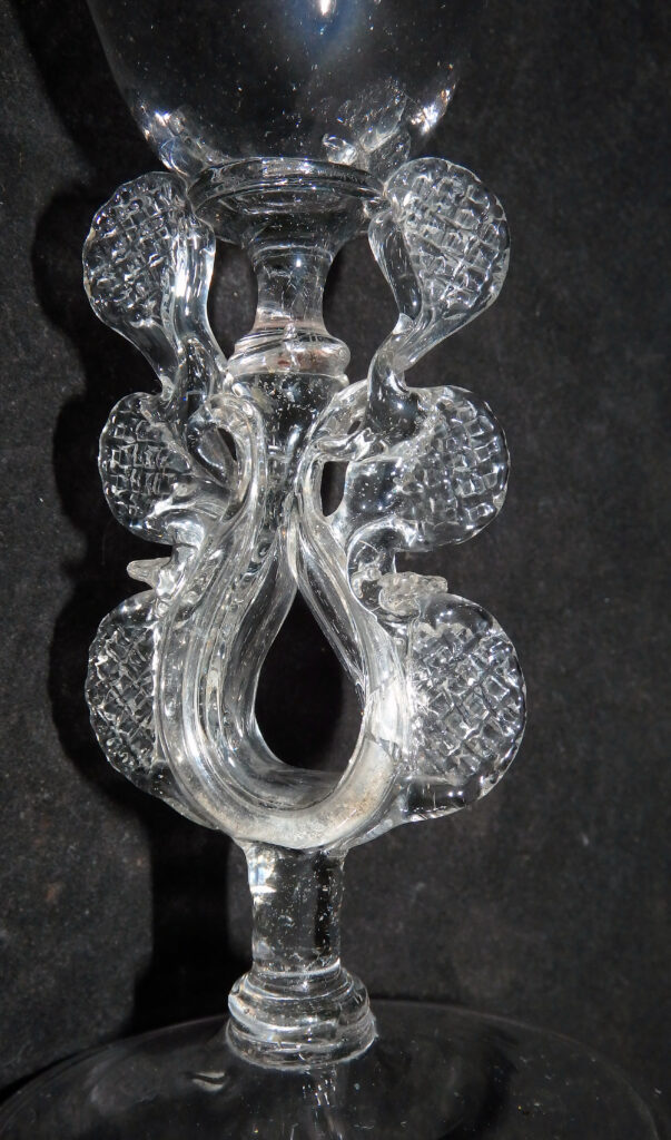 Prachtvoll geformtes Flügelglas (Façon de Venise) nach Vorbild des Muraneser Glases. Dünnwandiges, blasiges, farbloses Glas. Der leicht gewölbte Scheibenfuß mit nach unten umgeschlagenem Rand. An lyraförmigem Hohlschaft applizierte, waffelartig gekniffene Fadenauflagen mit abgeflachten Blatt- und Muschelmotiven. Glockenförmige, geweitete Kuppa.