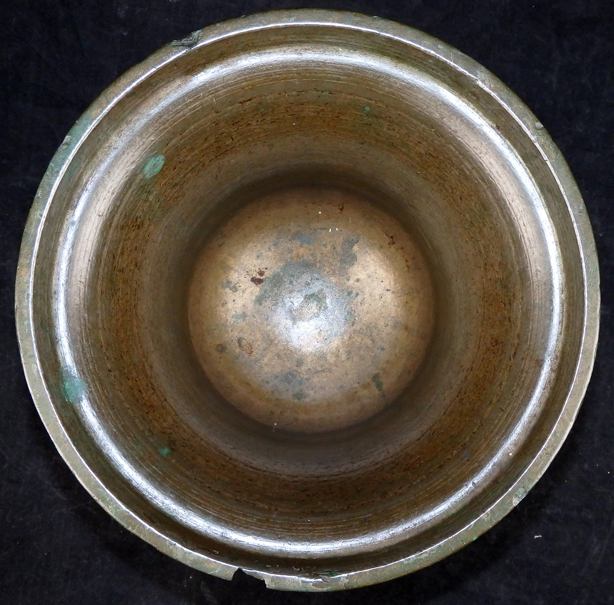Sehr gute, genuine Erhaltung mit nur wenigen altersbedingten Gebrauchsspuren. Wunderschöne braungrüne Patina. Die Lippe am mit größerem Ausbruch.