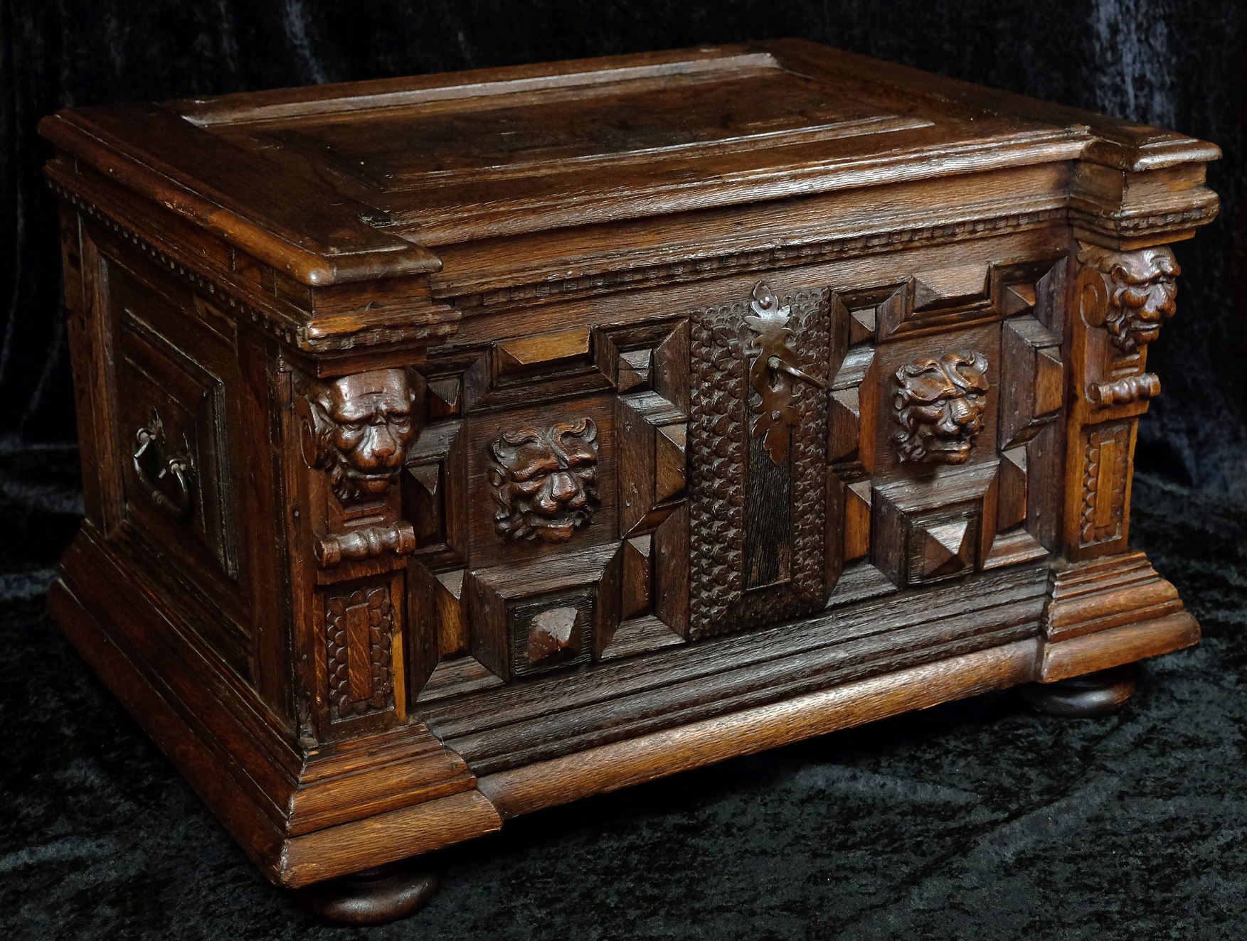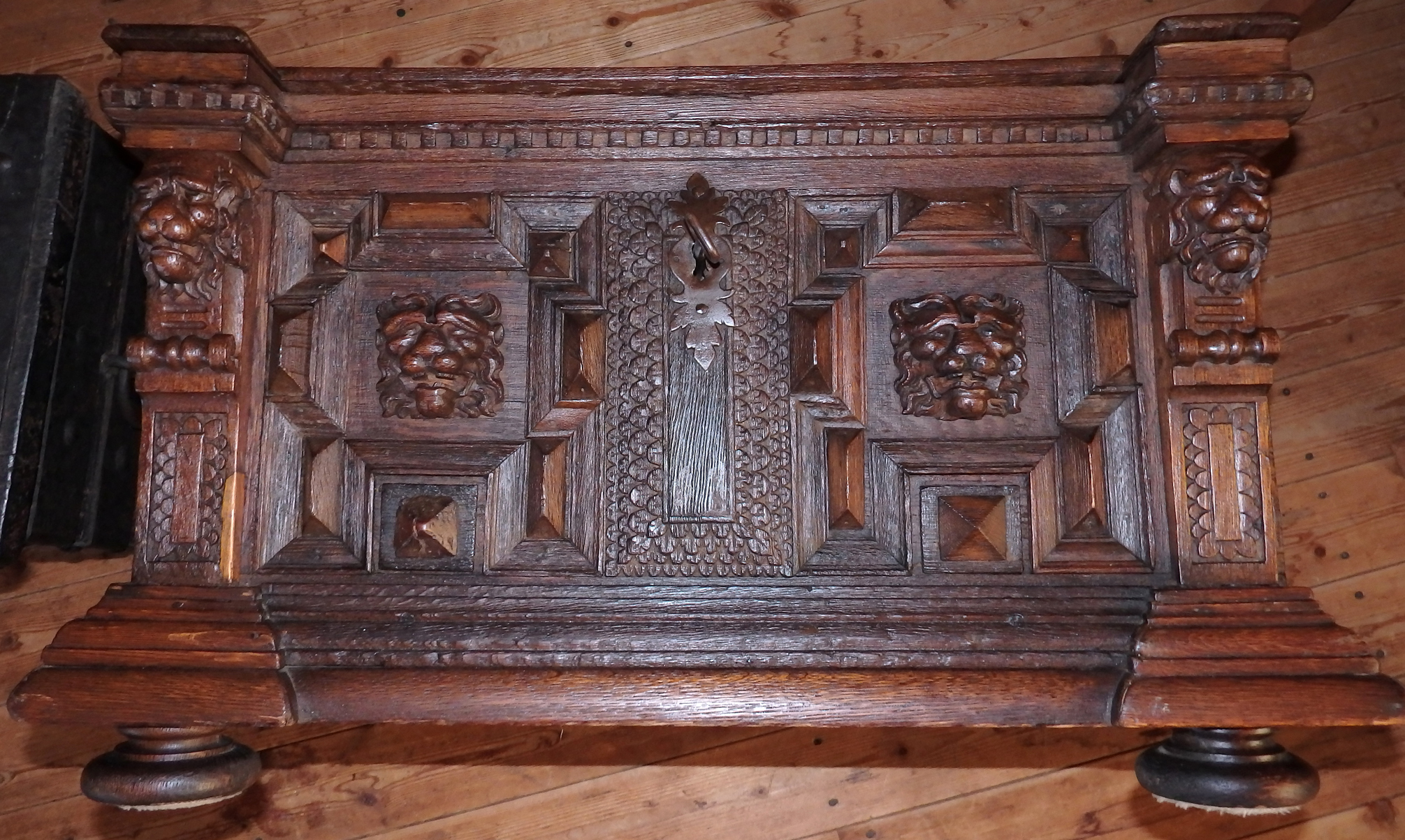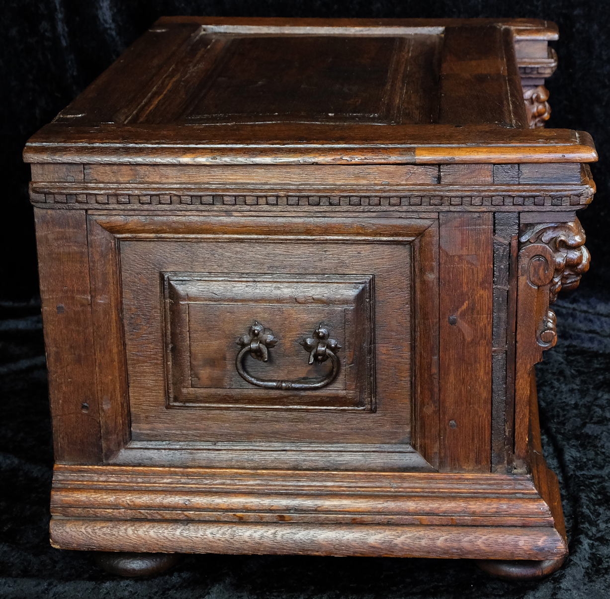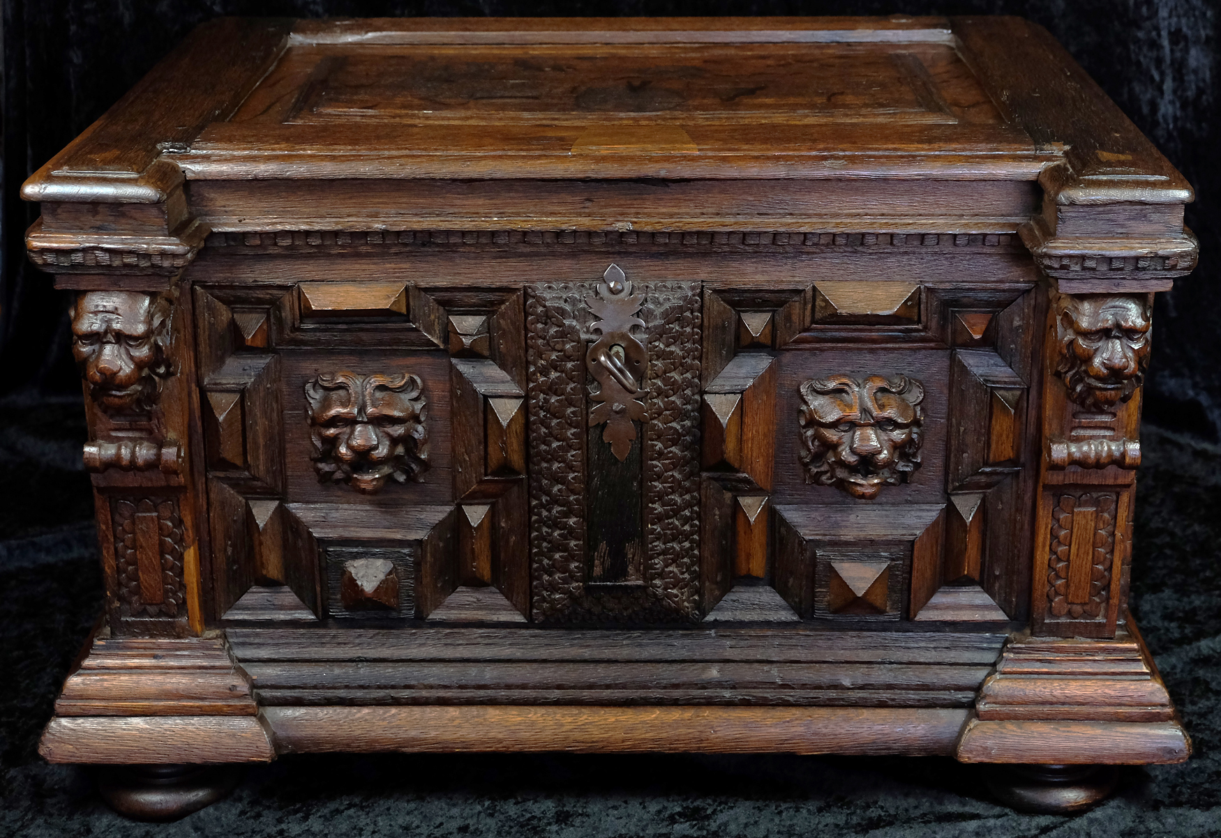 Kleine Fassadentruhe der Spätrenaissance. Fassadenartig strukturierte Front mittig zurückgesetzt mit vier geschnitzten Löwenhäuptern. Wohl originales Zangenschloss, schmiedeeiserne Scharnierbänder sowie seitliche Brandgriffe.