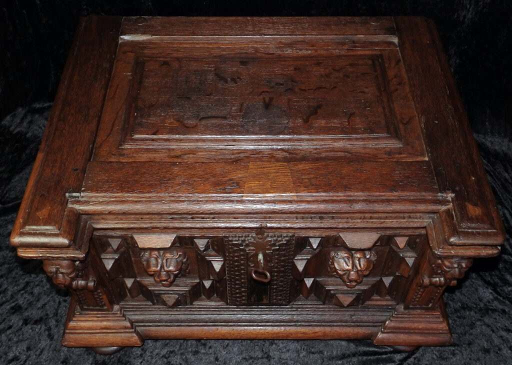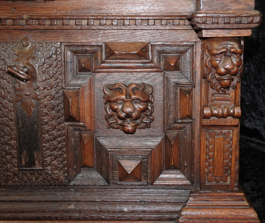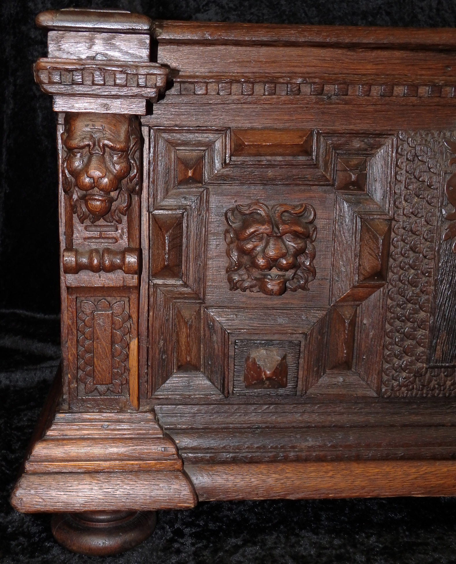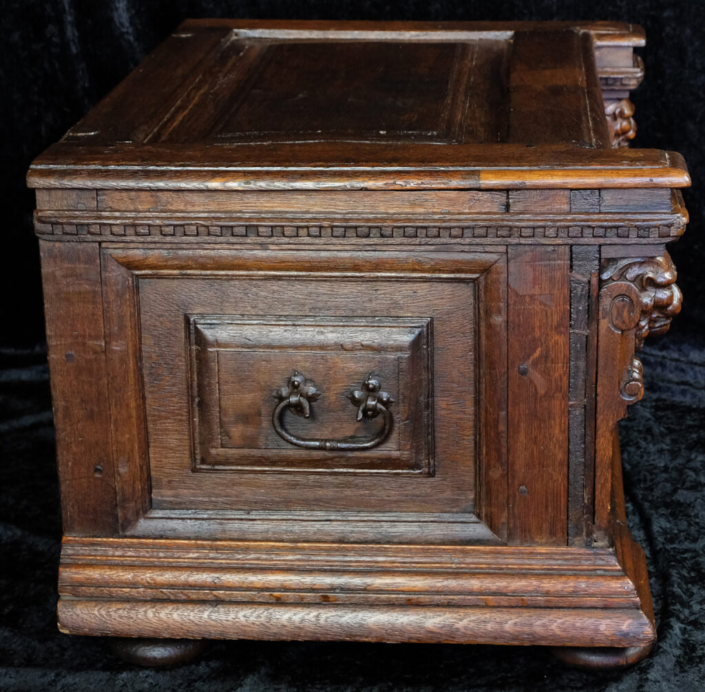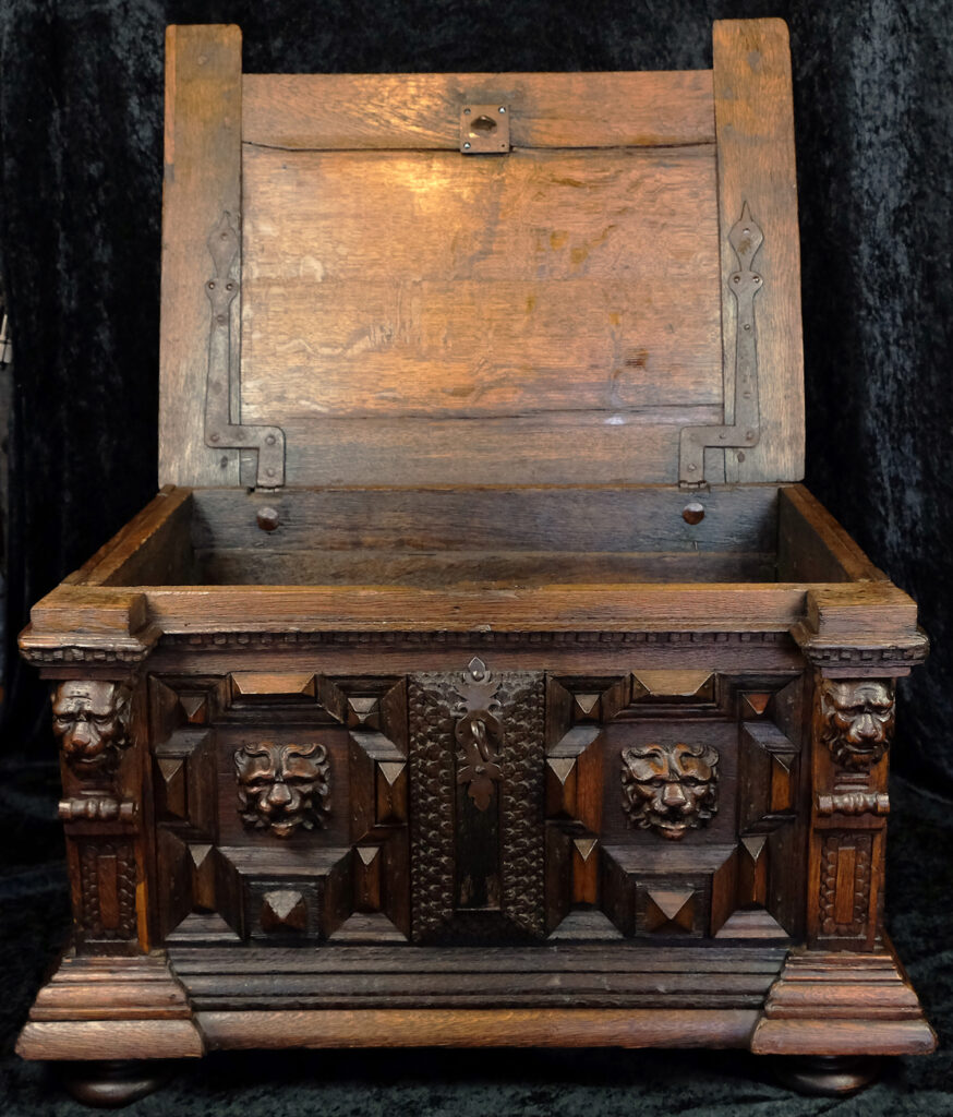 Kleine Fassadentruhe der Spätrenaissance. Fassadenartig strukturierte Front mittig zurückgesetzt mit vier geschnitzten Löwenhäuptern. Wohl originales Zangenschloss, schmiedeeiserne Scharnierbänder sowie seitliche Brandgriffe.
