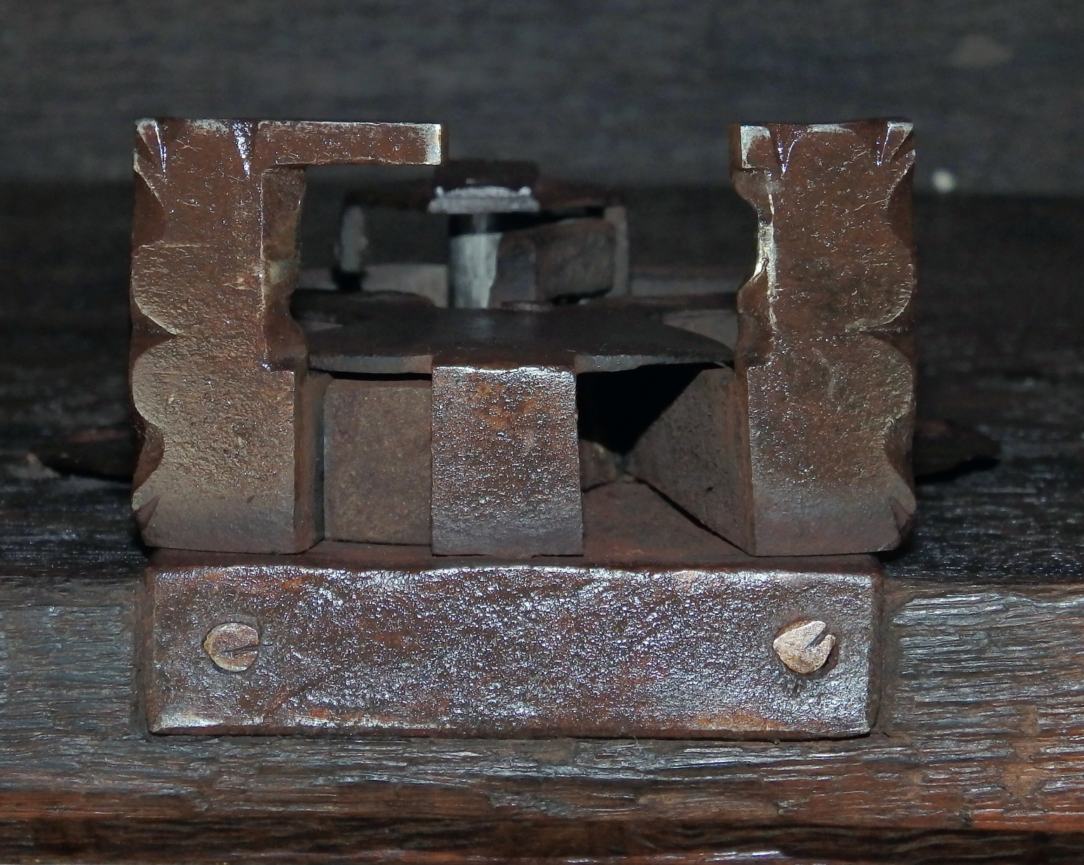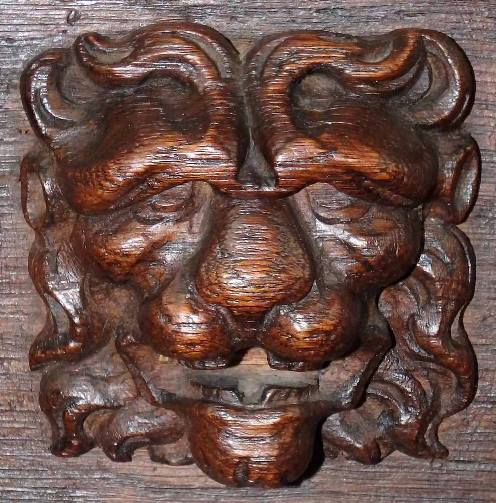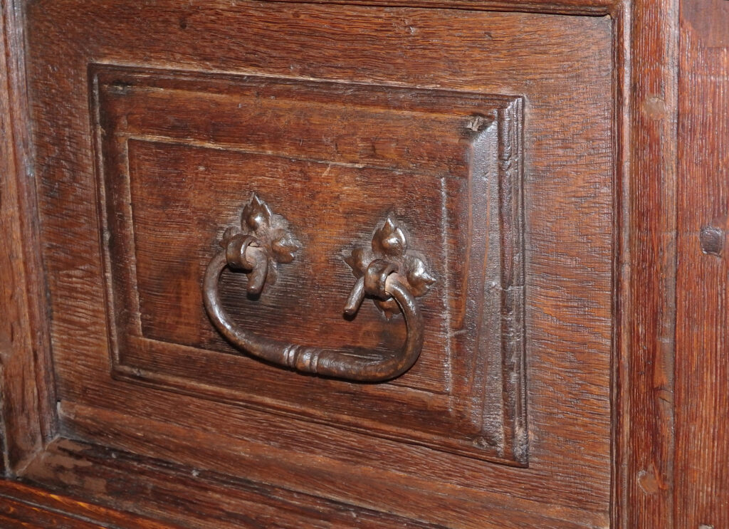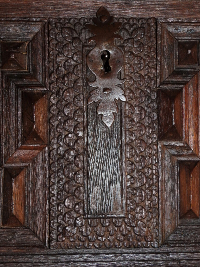 Fassadenartig strukturierte Front mittig zurückgesetzt mit vier geschnitzten Löwenhäuptern. Wohl originales Zangenschloss, schmiedeeiserne Scharnierbänder sowie seitliche Brandgriffe.