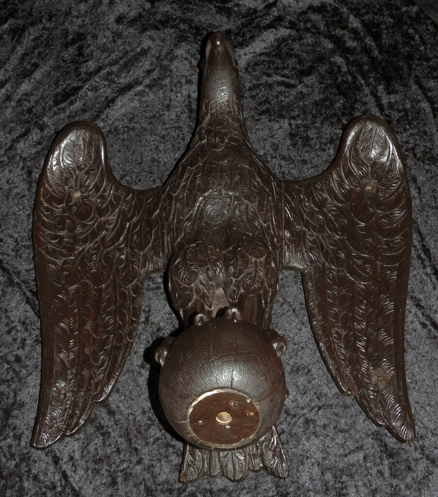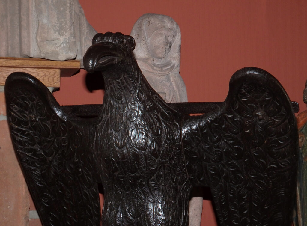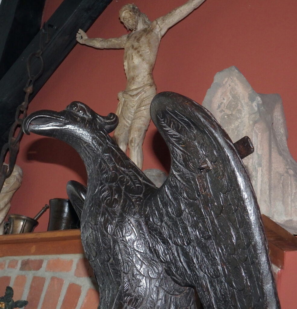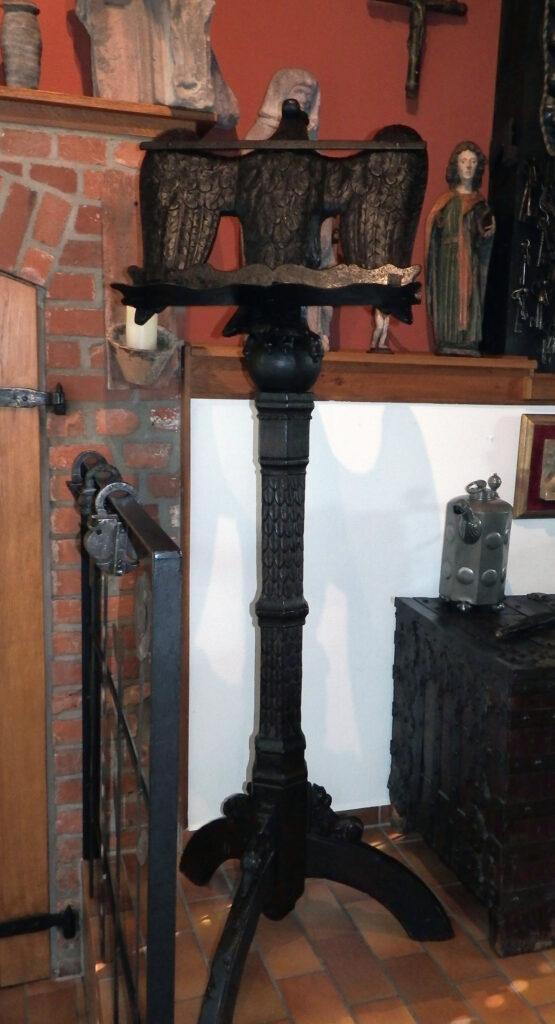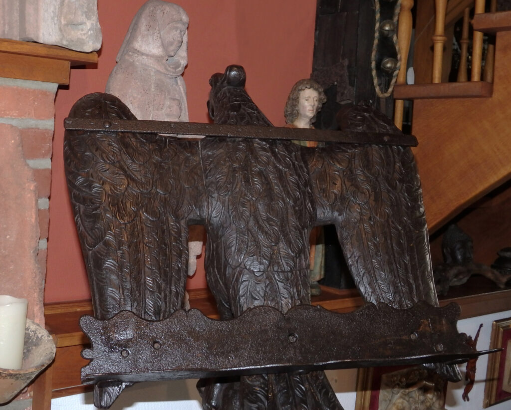Für diese Zeit klassischen Adlerpult. Der Adler ist sorgfältig aus Eichenholz Holz geschnitzt, mit ausgebreiteten Flügeln, die die Auflagefläche für das aufgeschlagene liturgische Buch bilden. Symbolisch steht der Adler für den Evangelisten Johannes und ist gleichzeitig ein Sinnbild für die Erhebung des göttlichen Wortes. Der Adler steht mit seinen Klauen sinnbildlich auf dem Globus als Symbol für die Weltherrschaft Christi.