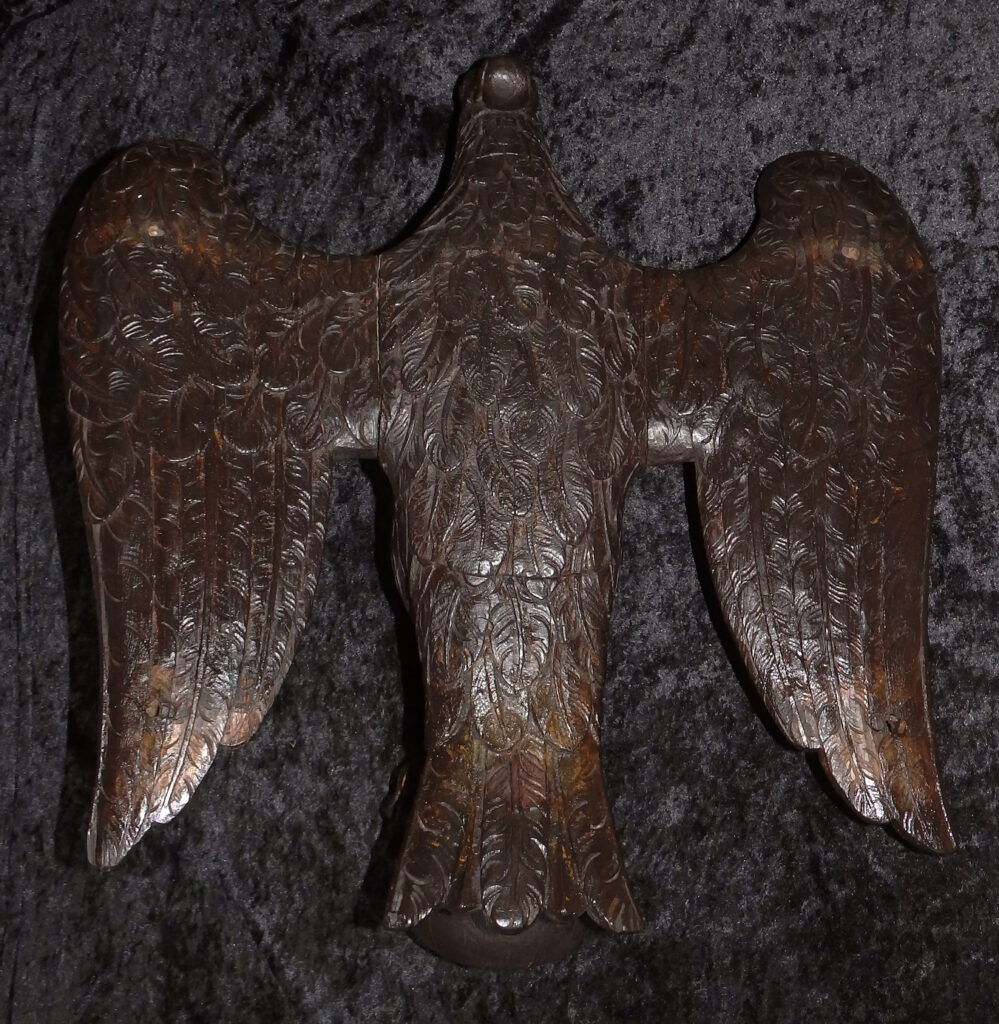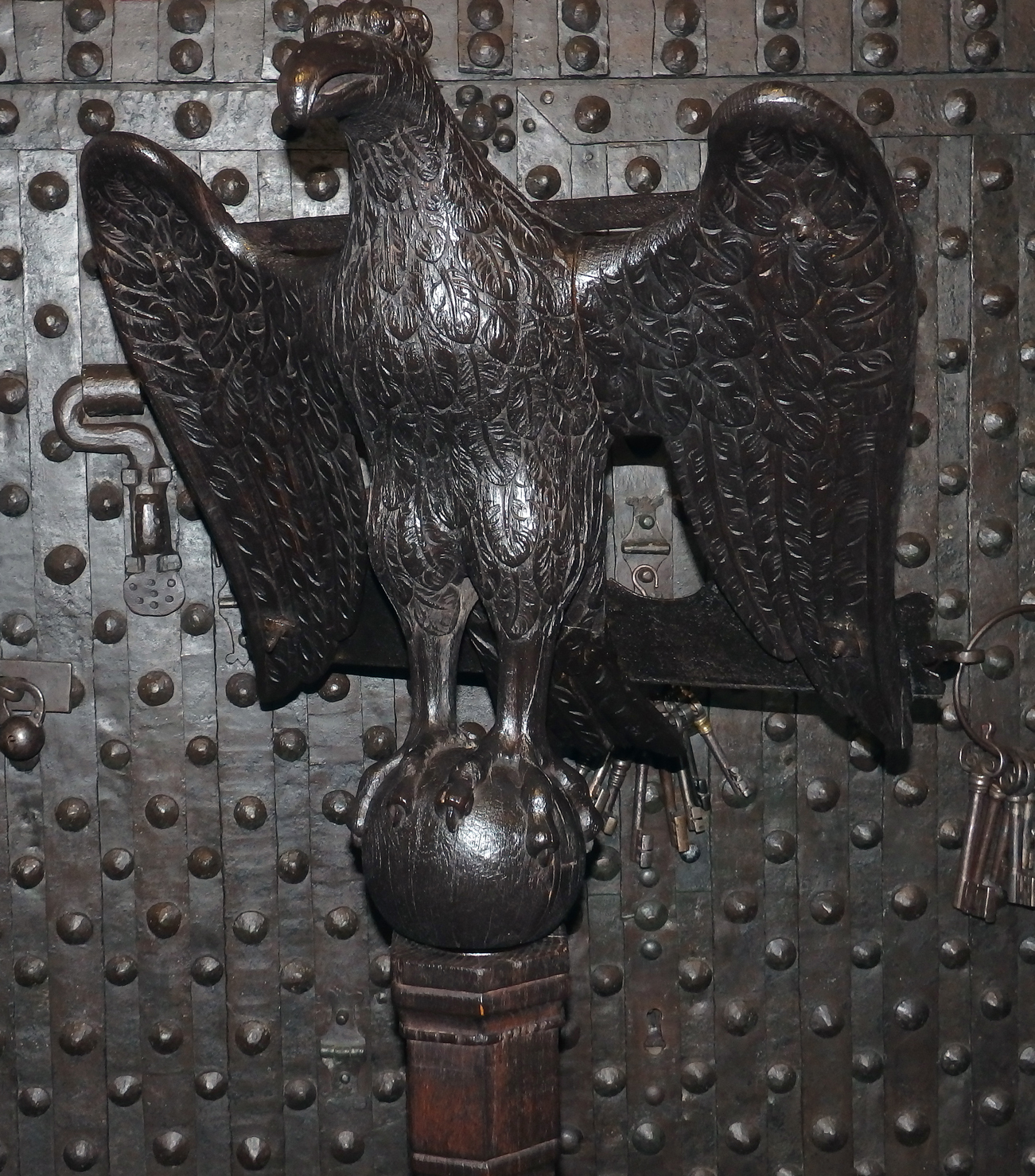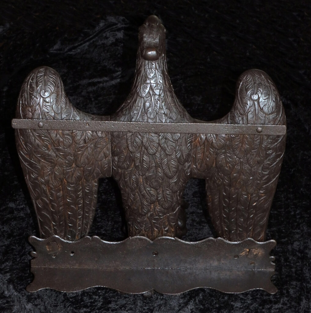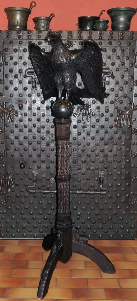 Für diese Zeit klassischen Adlerpult. Der Adler ist sorgfältig aus Eichenholz Holz geschnitzt, mit ausgebreiteten Flügeln, die die Auflagefläche für das aufgeschlagene liturgische Buch bilden. Symbolisch steht der Adler für den Evangelisten Johannes und ist gleichzeitig ein Sinnbild für die Erhebung des göttlichen Wortes. Der Adler steht mit seinen Klauen sinnbildlich auf dem Globus als Symbol für die Weltherrschaft Christi.