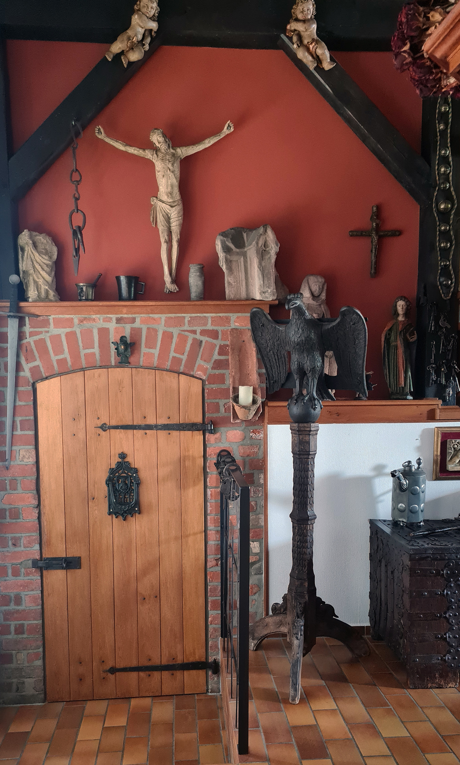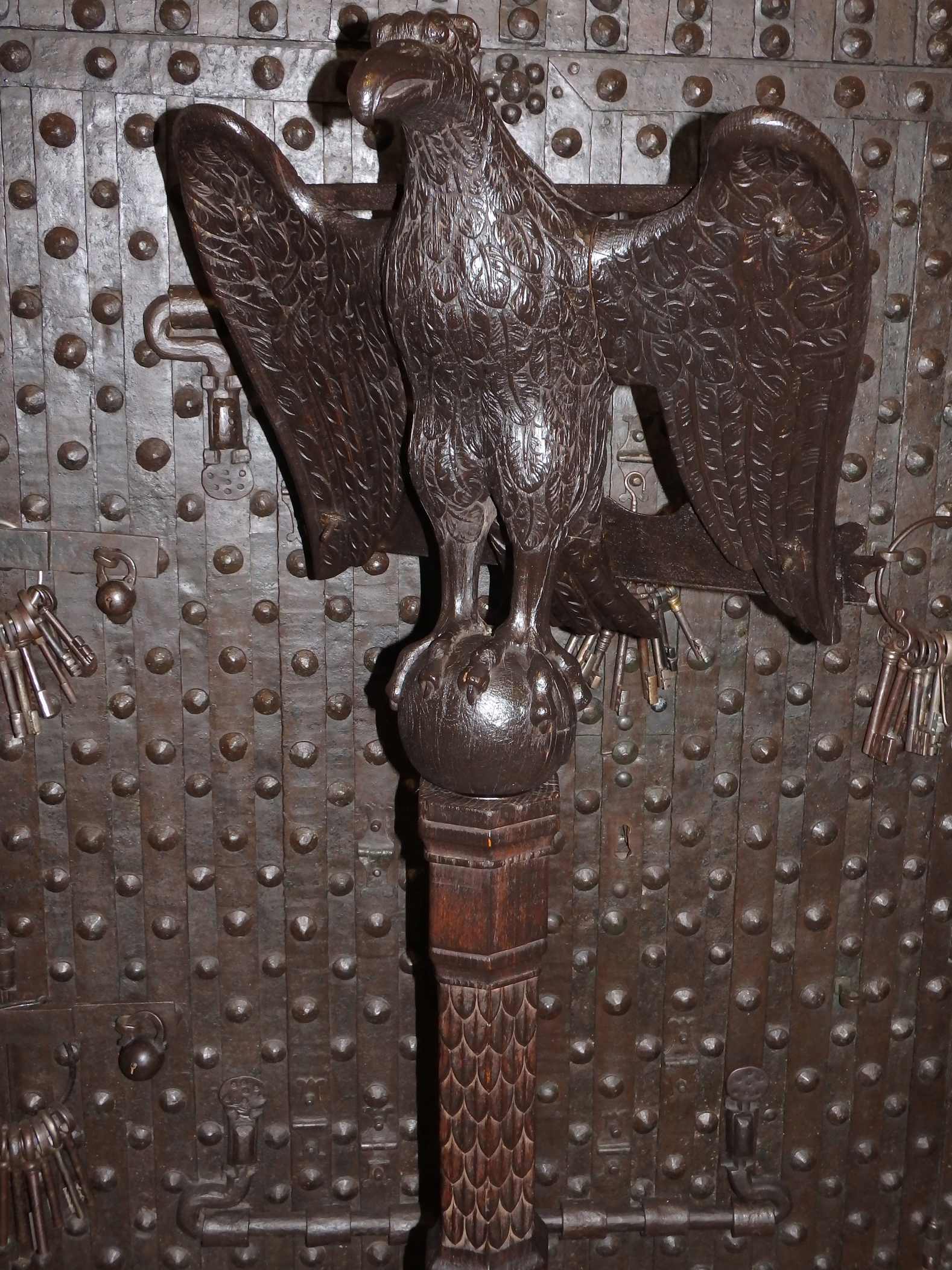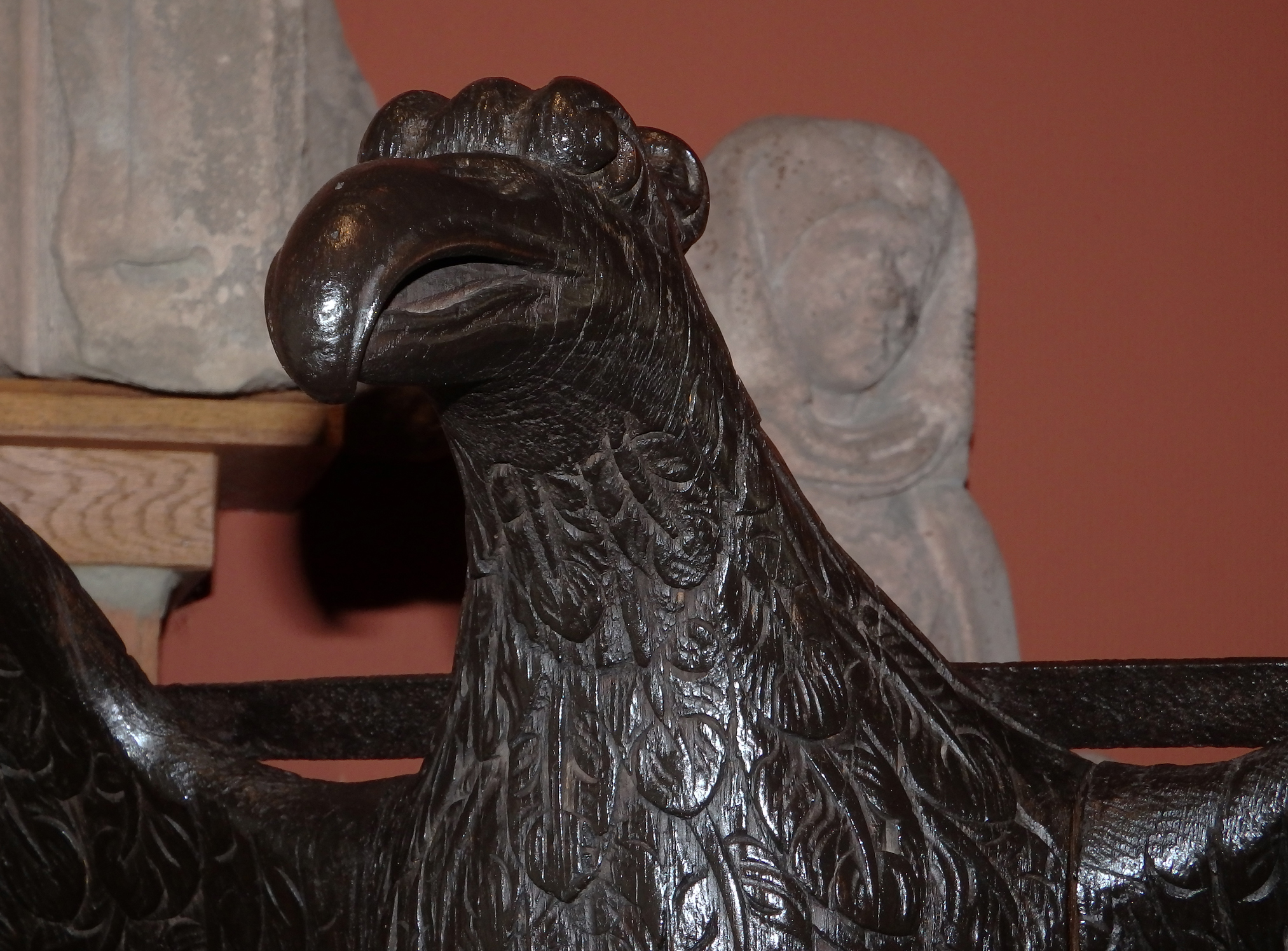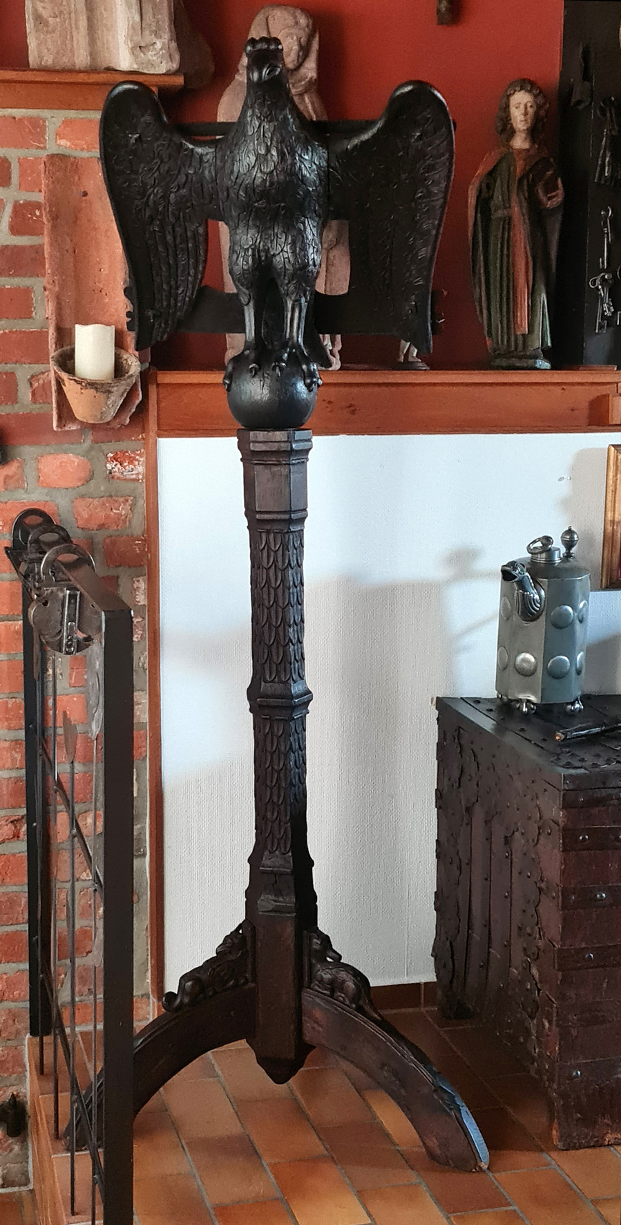 Für diese Zeit klassischen Adlerpult. Der Adler ist sorgfältig aus Eichenholz Holz geschnitzt, mit ausgebreiteten Flügeln, die die Auflagefläche für das aufgeschlagene liturgische Buch bilden. Symbolisch steht der Adler für den Evangelisten Johannes und ist gleichzeitig ein Sinnbild für die Erhebung des göttlichen Wortes. Der Adler steht mit seinen Klauen sinnbildlich auf dem Globus als Symbol für die Weltherrschaft Christi.