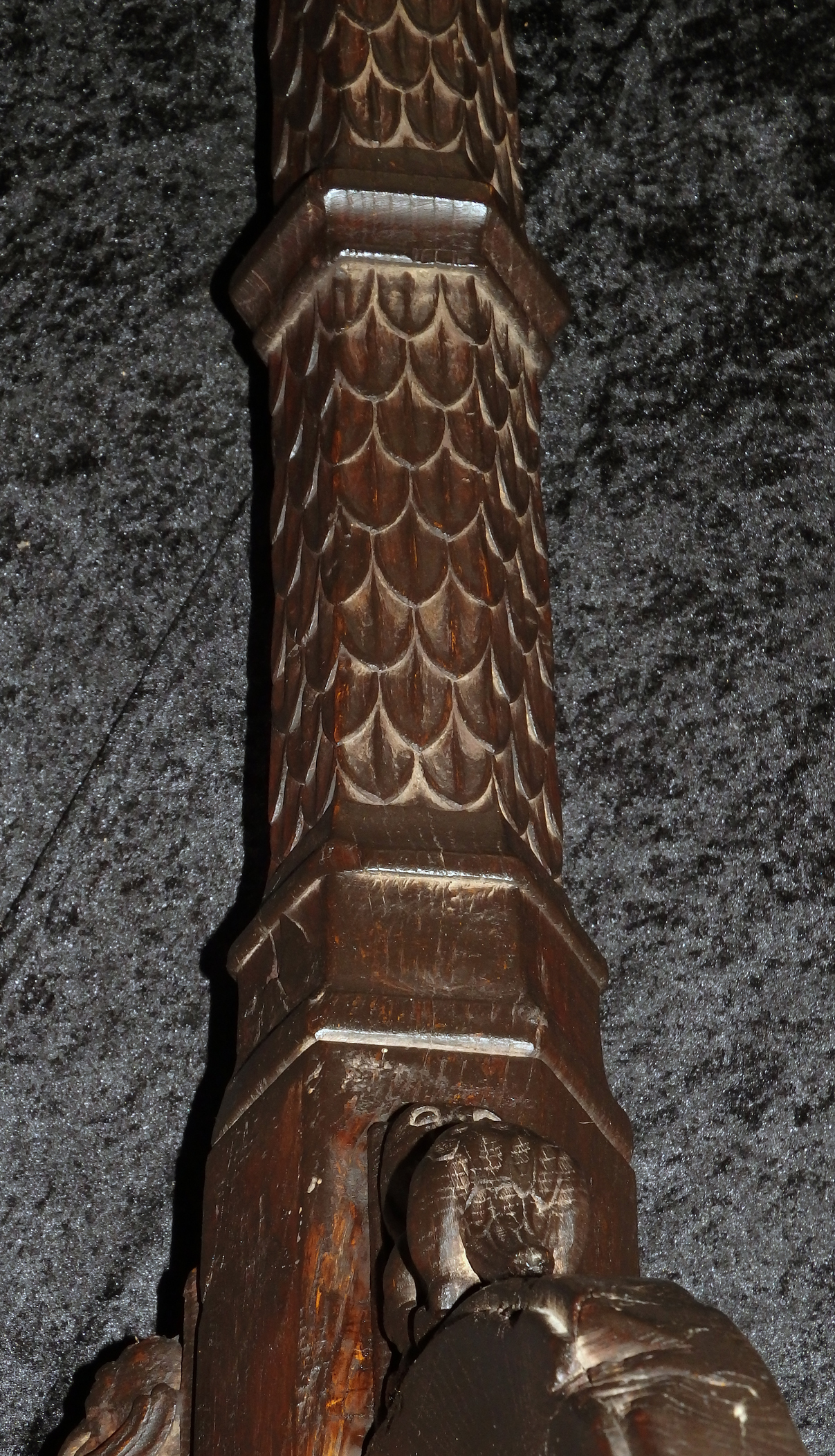 Auf einem Dreipass-Fuß mit geschnitzten dämonischen Maskeron-Aufsätzen gelagerter, gotischer Schaft. Dieser im ornamentierten, schuppenförmig geschnitzten, klassisch gotischen Dekor. Der über einen Eisenbolzen aufsteckbare, schwere, auf einer Kugel fußenden Adler trägt rückseitig die eiserne Buchauflage.
