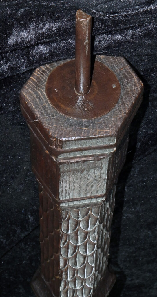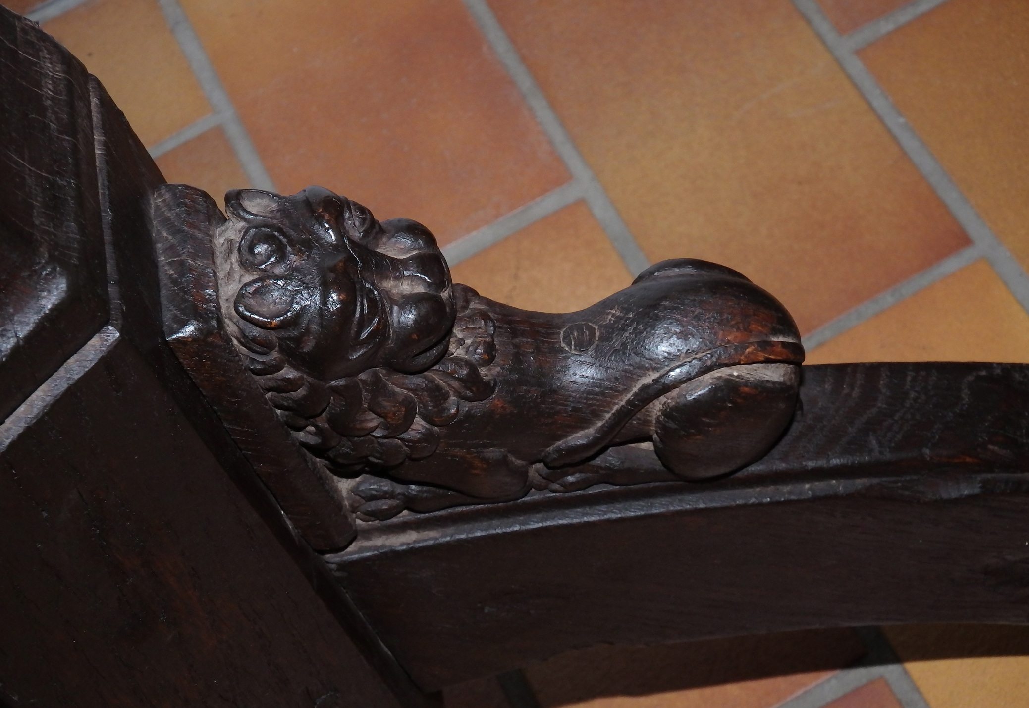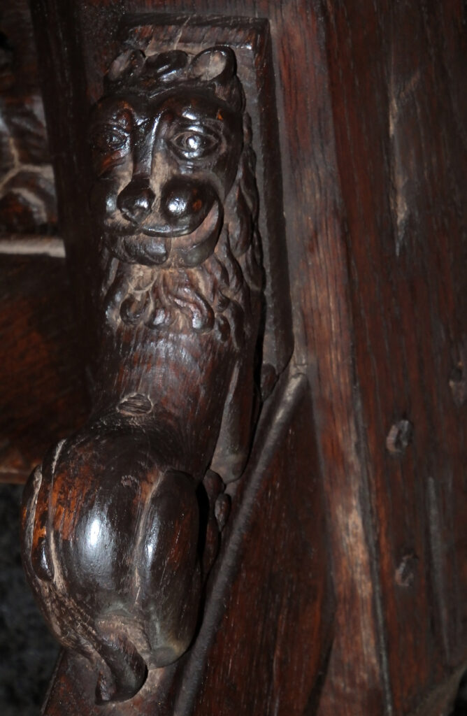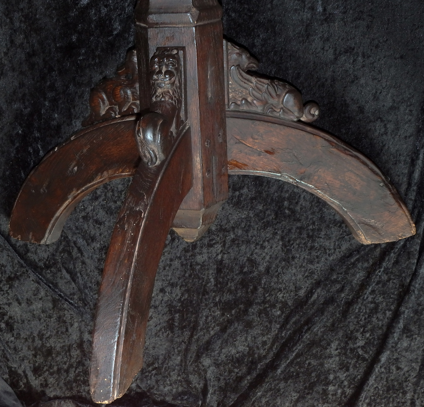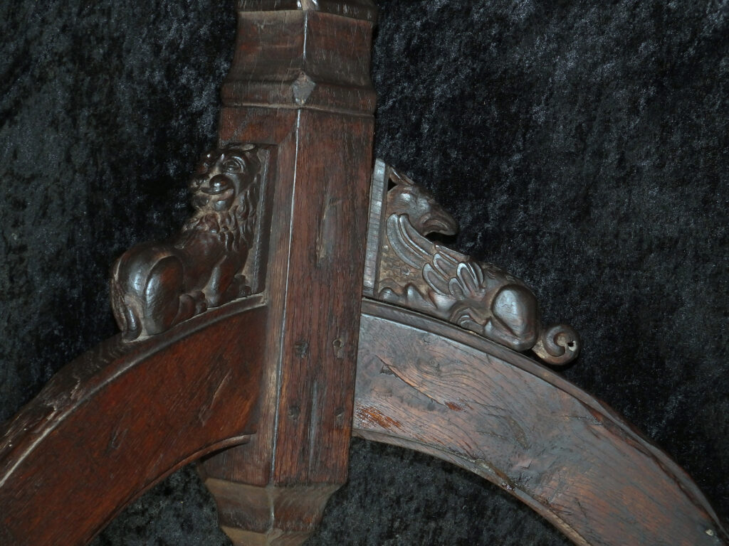 Ungewöhnlich gute Erhaltung mit nur wenig Alters- und Gebrauchsspuren. Schöne, gewachsene Alterspatina. Holz mit einigen unproblematischen Spannungsrissen. Eisenauflagen wohl alt erneuert. Die drei Beine gestiftet und etwas locker, statisch jedoch stabil. Ein Ohr eines Fabelwesens gebrochen und neu angesetzt.