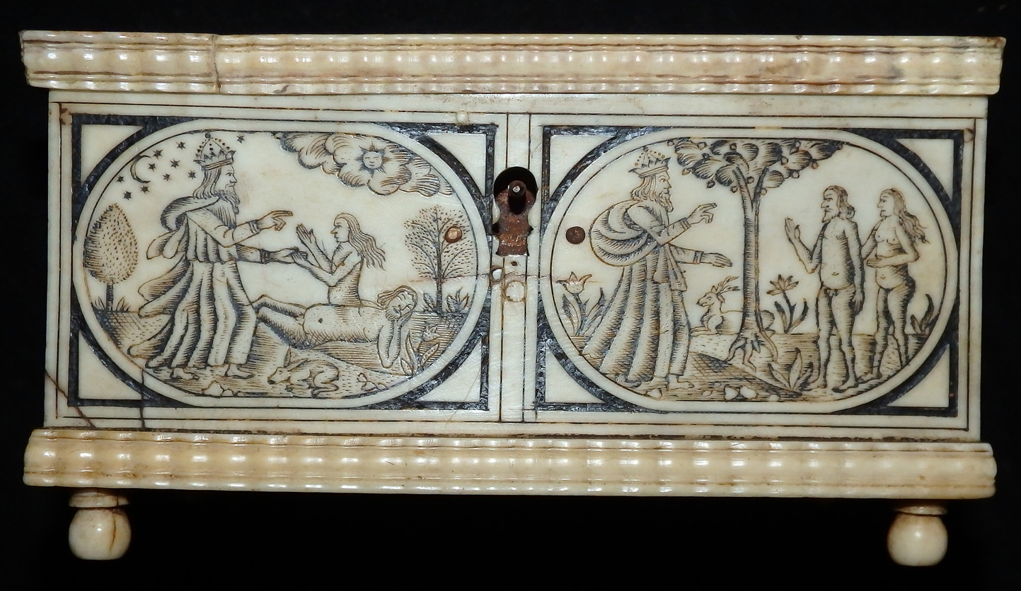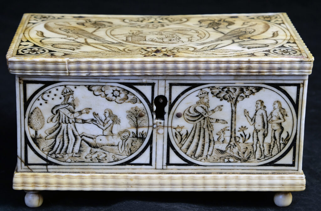 Prachtvoll graviertes Renaissancekästchen mit Szenen aus der Schöpfungs- sowie der Passionsgeschichte. Nadelholz und Bein furniert. Über vier gedrückten Kugelfüßen ein rechteckiger Korpus mit flachem Scharnierdeckel. Die Kanten umlaufend im profilierten Flammleistendekor. Allseitig flächendeckend graviert und geschwärzt mit Darstellungen der Erschaffung Evas, des Hinweises auf den Baum der Erkenntnis, des Sündenfalls, der Vertreibung Adams und Evas aus dem Paradies sowie der Kreuzigung Christi. Auf dem Deckel die zentrale Darstellung des Gebetes Christi am Ölberg, gerahmt von zwei