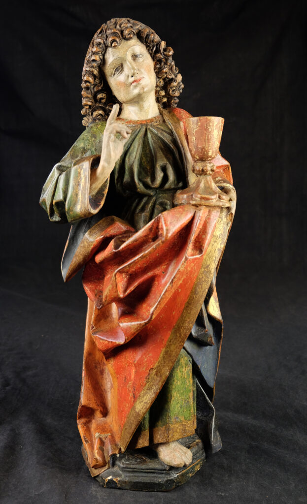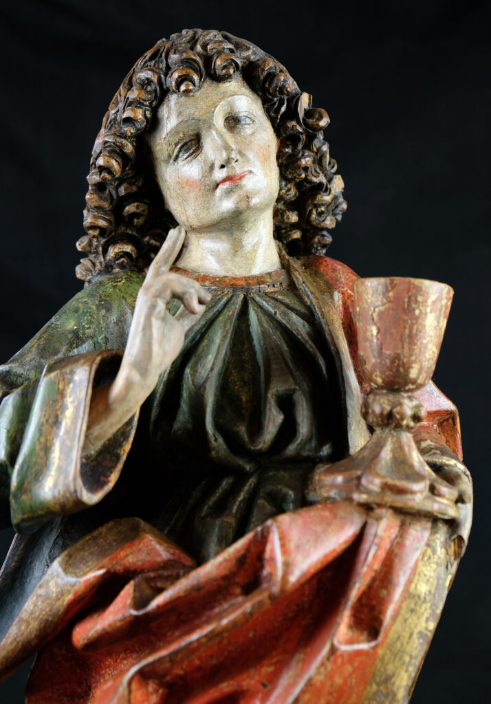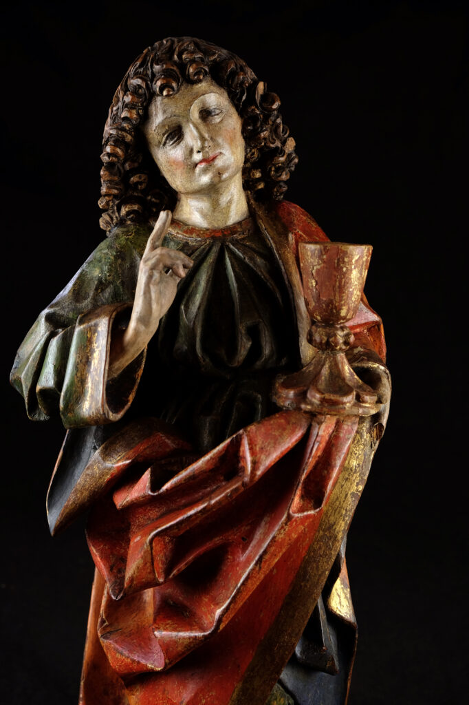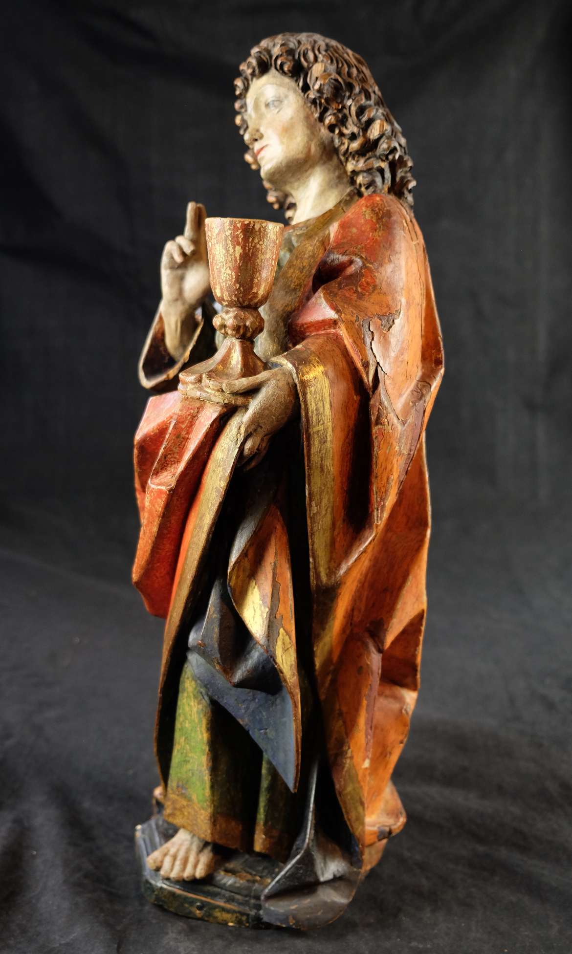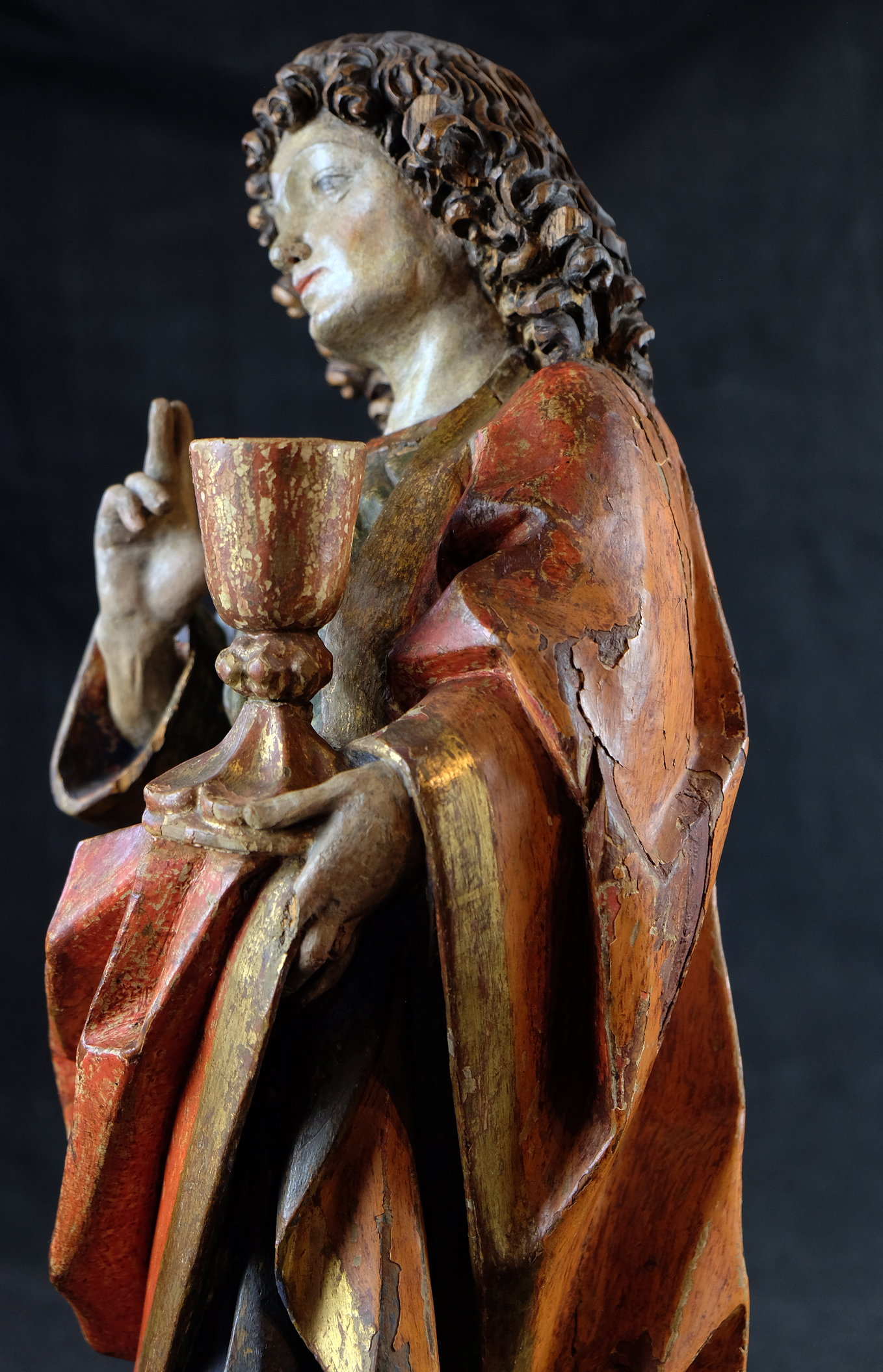 In hoher Qualität vollplastisch geschnitzte und polychrom gefasste, auf einem Sockel stehende Skulptur des Heiligen Johannes im Klostergewand und Mantel dargestellt. Elaborierter Lockenfigur und reich drapiertes Gewand in Rot, Blau, Grün und Gold. In der linken Hand hält Johannes einen detailreich ausgearbeiteten, für die Gotik typischen Kelch. Die rechte Hand mit Segnungsgruß.