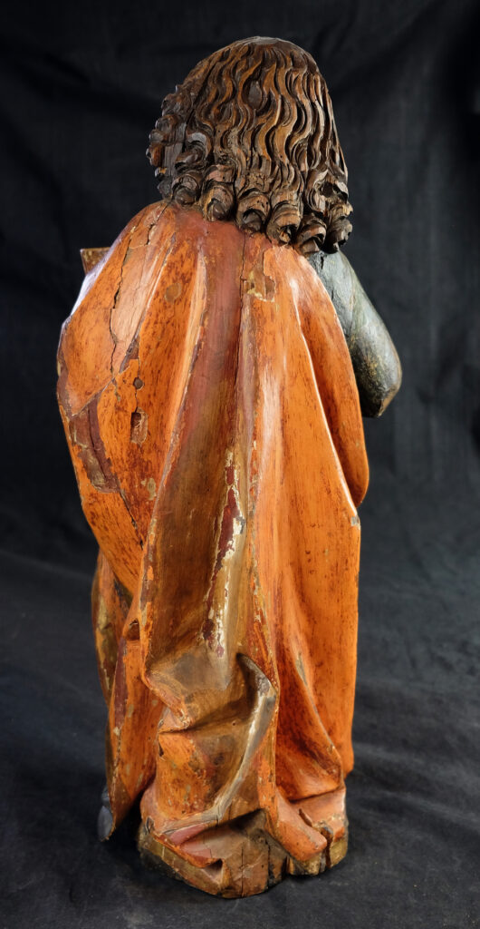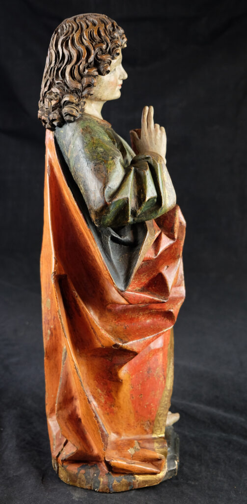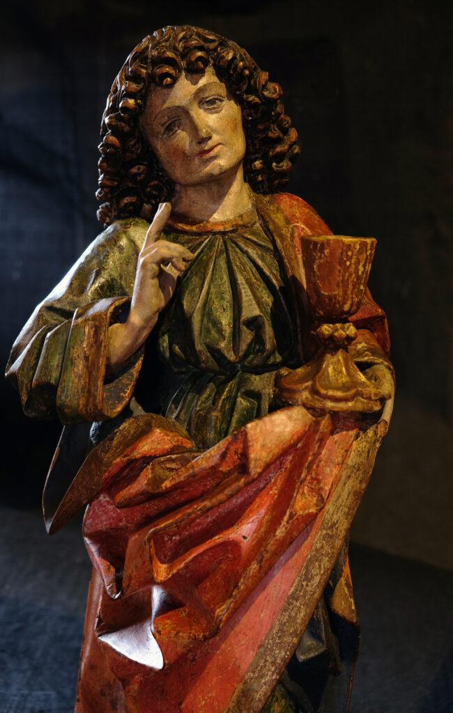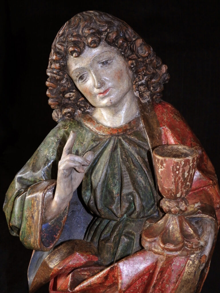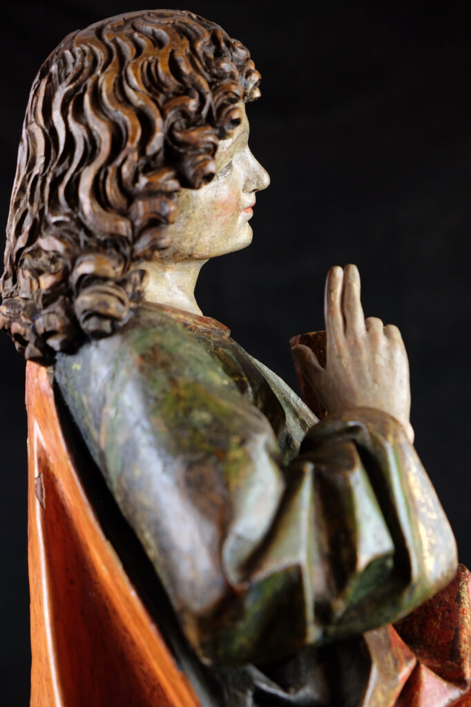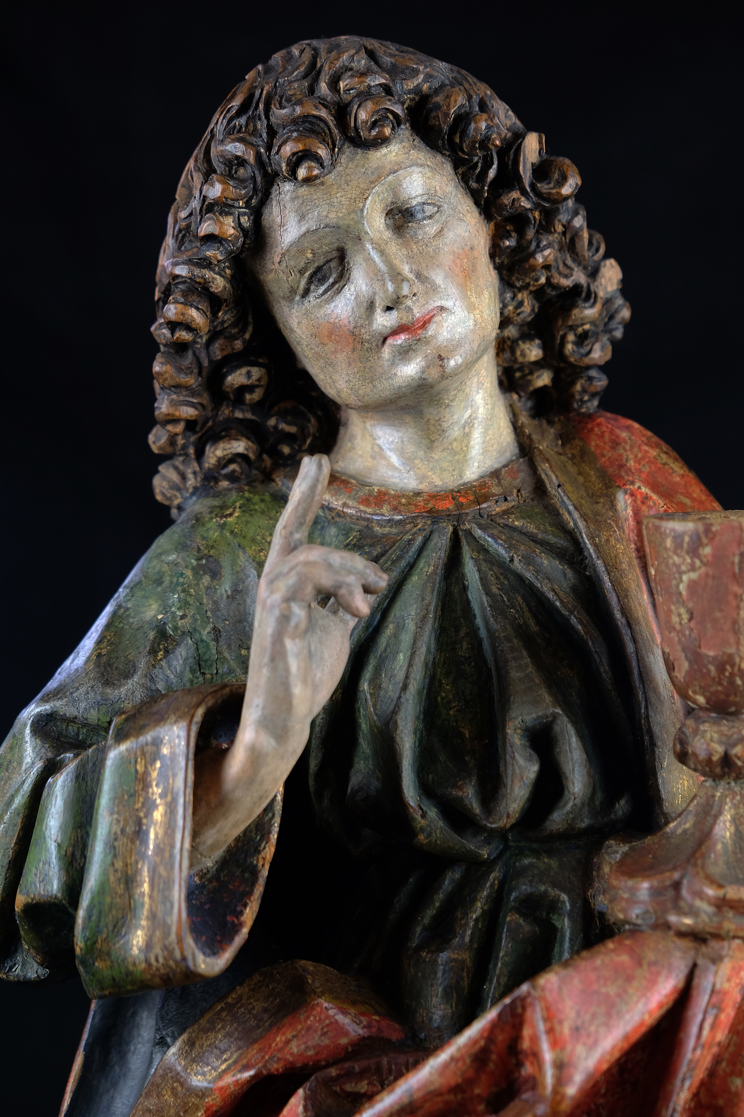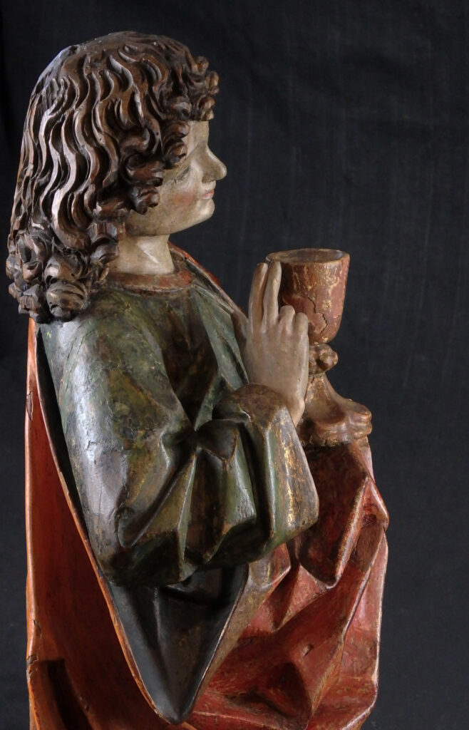 In hoher Qualität vollplastisch geschnitzte und polychrom gefasste, auf einem Sockel stehende Skulptur des Heiligen Johannes im Klostergewand und Mantel dargestellt. Elaborierter Lockenfigur und reich drapiertes Gewand in Rot, Blau, Grün und Gold. In der linken Hand hält Johannes einen detailreich ausgearbeiteten, für die Gotik typischen Kelch. Die rechte Hand mit Segnungsgruß.