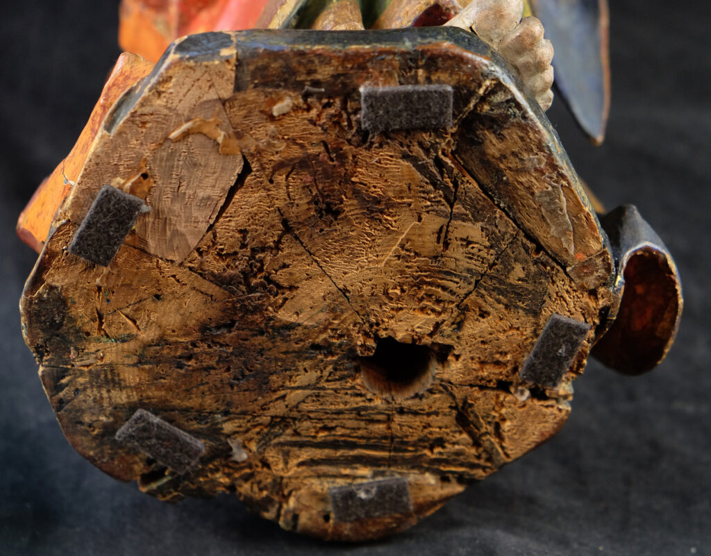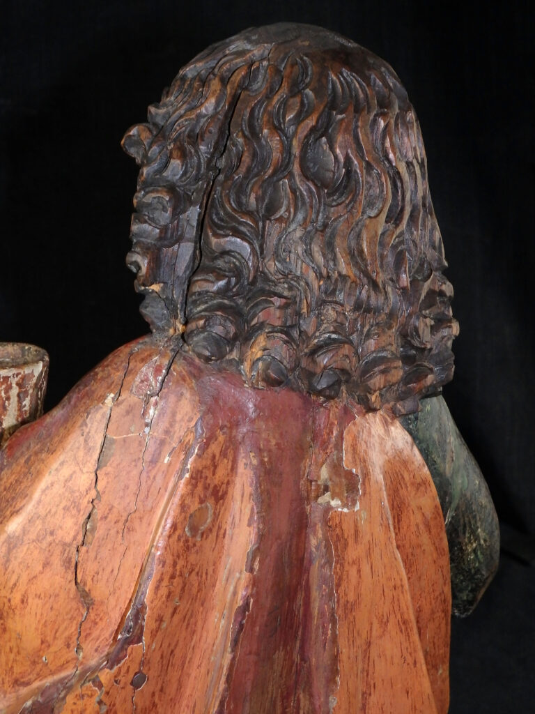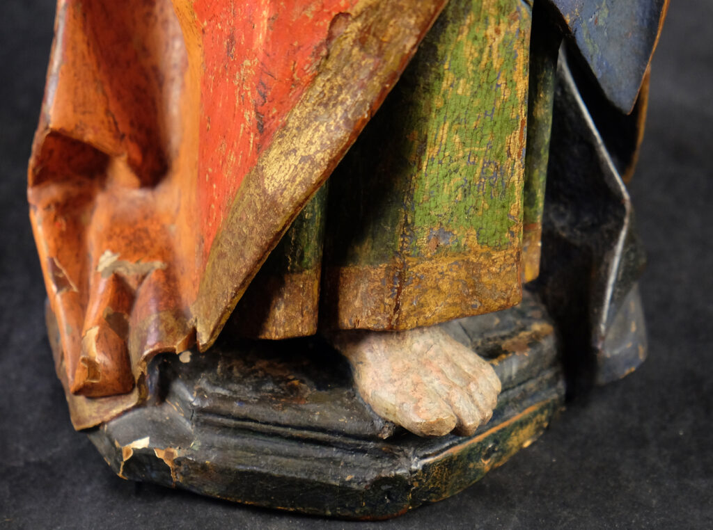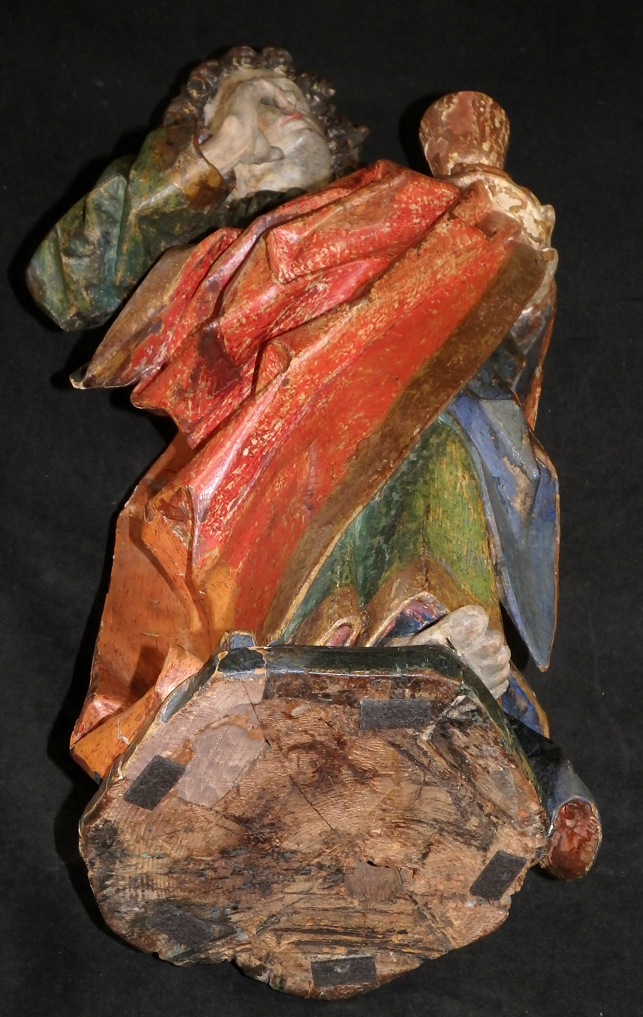 Guter Zustand mit Altersspuren. Solide Holzsubstanz. Originalfassung vorn weitgehend erhalten. Das Gold stärker berieben. Partiell bestoßen und mit kleineren Fehlstellen. Rückseitig mit größeren Fassungsverlusten und einigen Spannungsrissen.