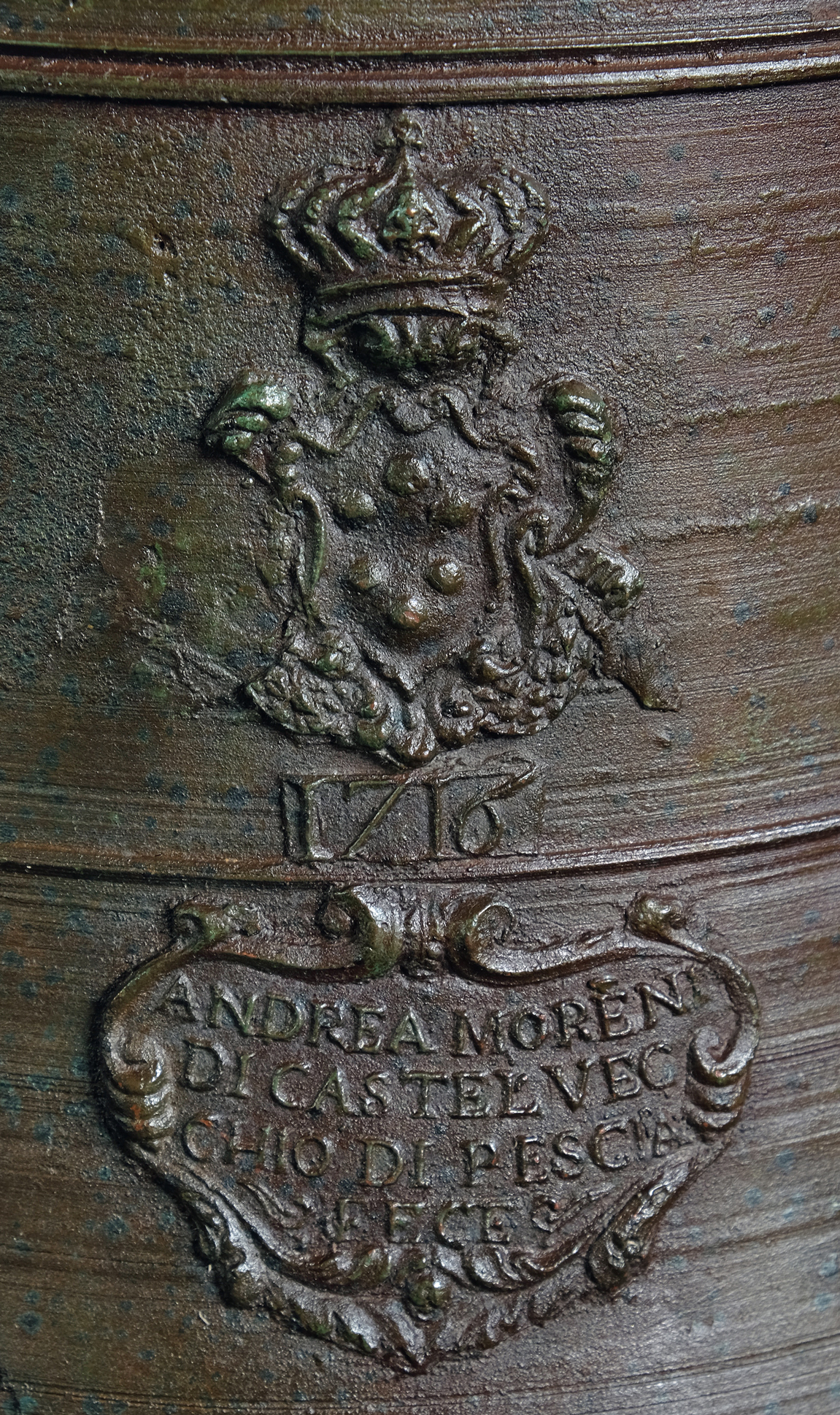 Hervorragend erhaltenes Exemplar einer frühen Glocke des renommierten Glockengießers Andrea Moreni aus Castelvecchio mit reichen Verzierungen und Beschriftungen. Geschwungene Krone mit Mittelöhr sowie zwei seitlichen Öhren. Hals, Schulter und Flanke mit umlaufenden Zierstegen. Hals mit einer umlaufenden Zierbordüre. Vordere Flanke mit der Abbildung der Heiligen Barbara mit ihren Attributen – einer Palme in ihrer rechten Hand haltend und einem Turm für die Schutzpatronin der Feuerwehrleute und Bergleute. Hintere Flanke mit dem Wappen der Medici (Toscana), der Datierung 1716 sowie einer Kartusche mit der Inschrift