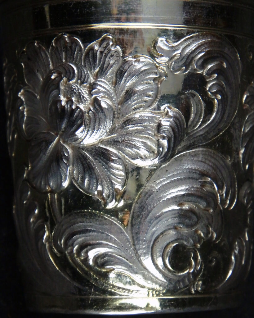Silber, getrieben, ziseliert, punziert und teilvergoldet.