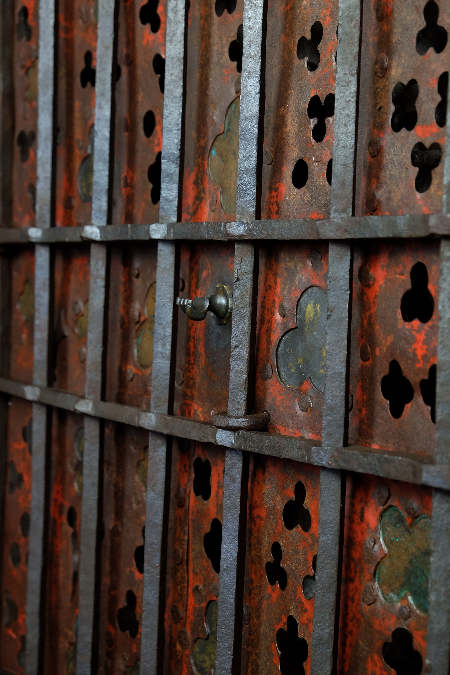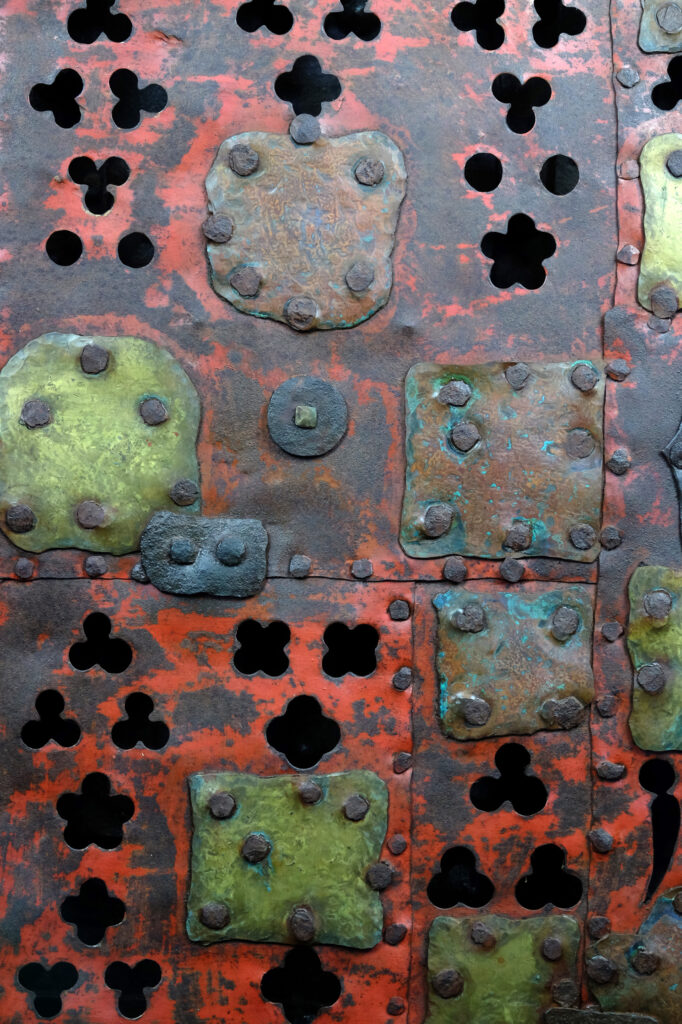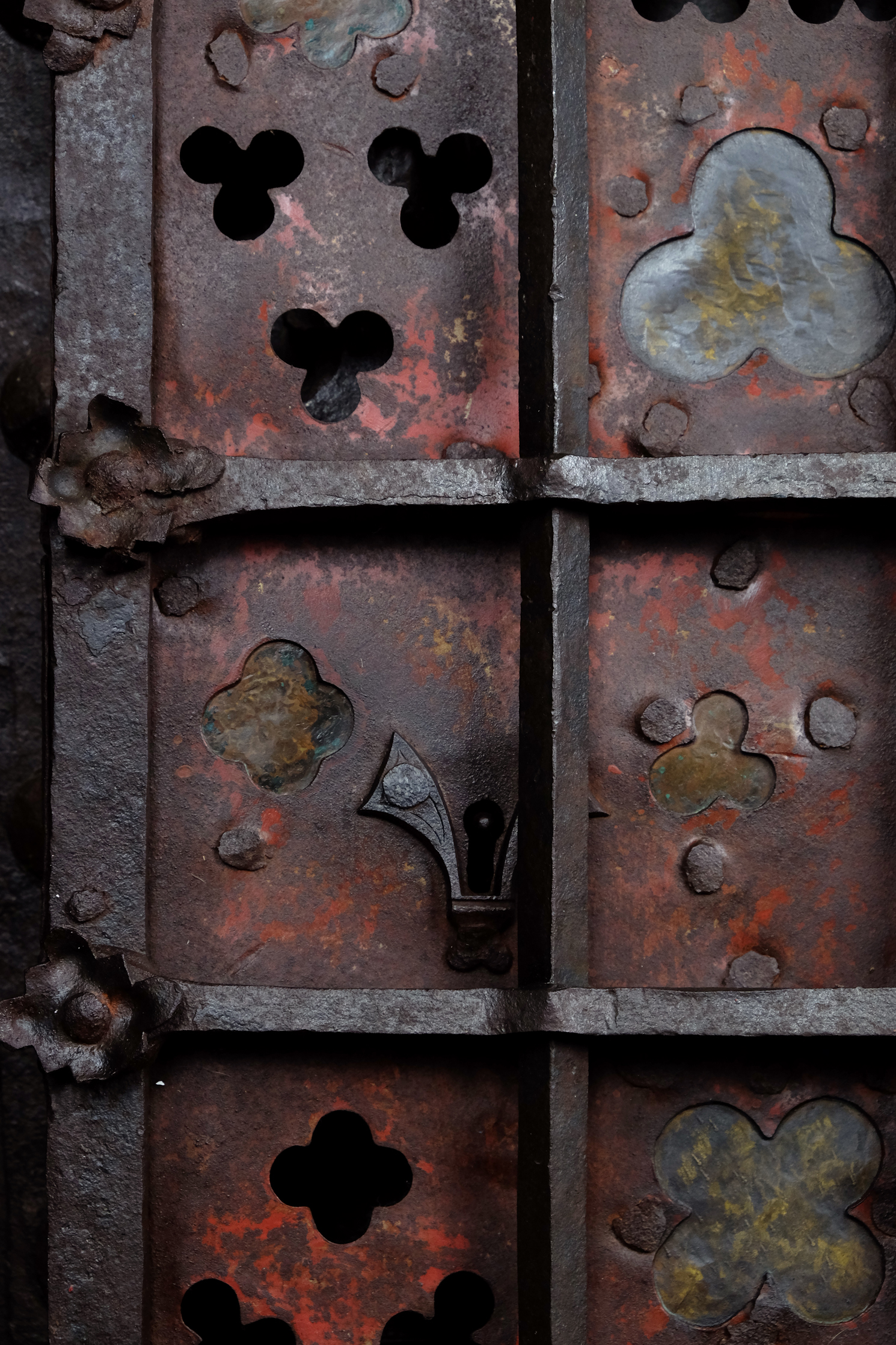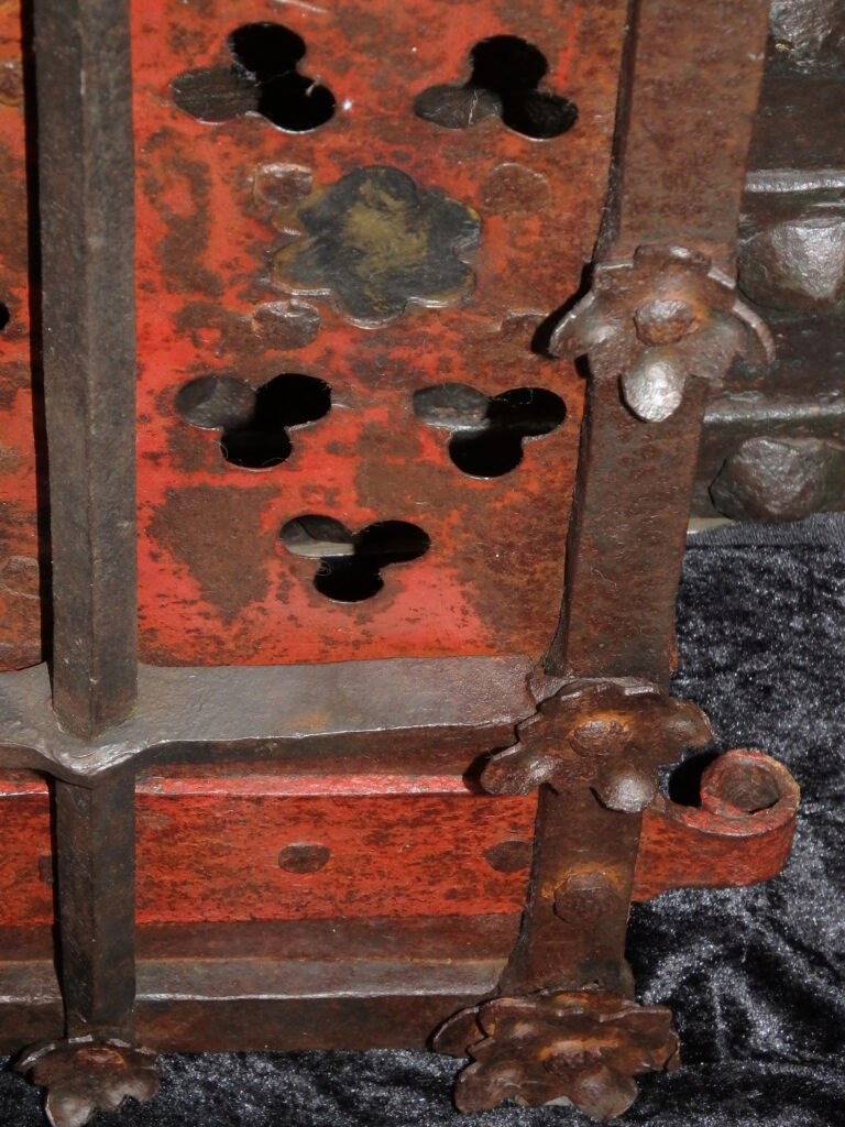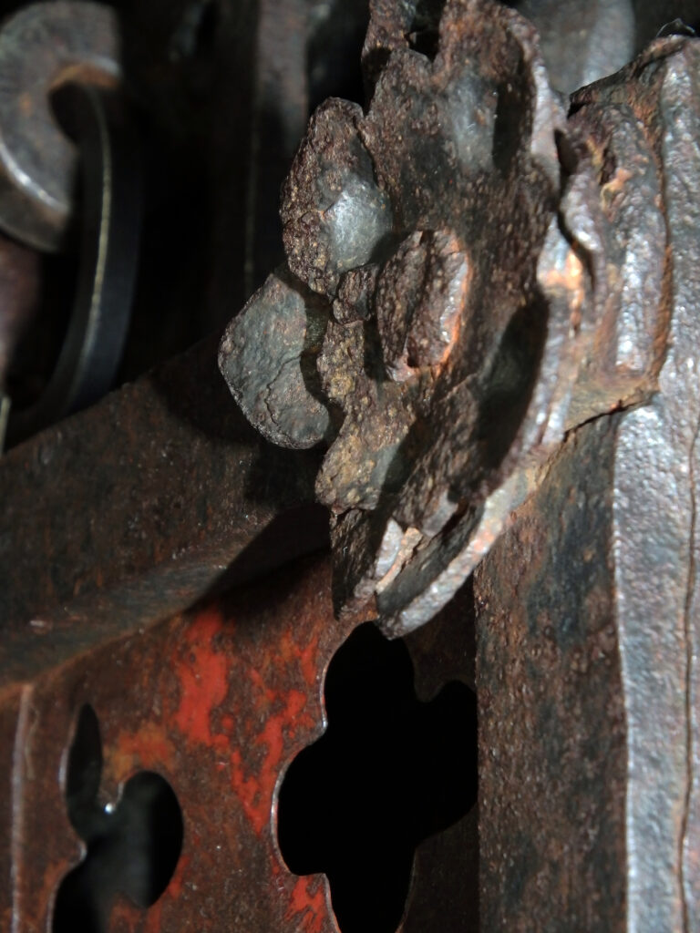 Die meisterhaft geschmiedeten und genieteten Eisenstäbe, die durchbrochenen Dreipass- und Lanzettformen und die farbig gefassten Hinterlegungen zeugen von einer Schmiedekunst, die technische Präzision mit symbolischer Bildsprache verbindet. Das Eisen wird hier nicht nur als wehrhaftes Material eingesetzt, sondern als gestalteter Träger theologischer Bedeutung: durchlässig und doch verschließend, schwer und doch von rhythmischer Leichtigkeit.