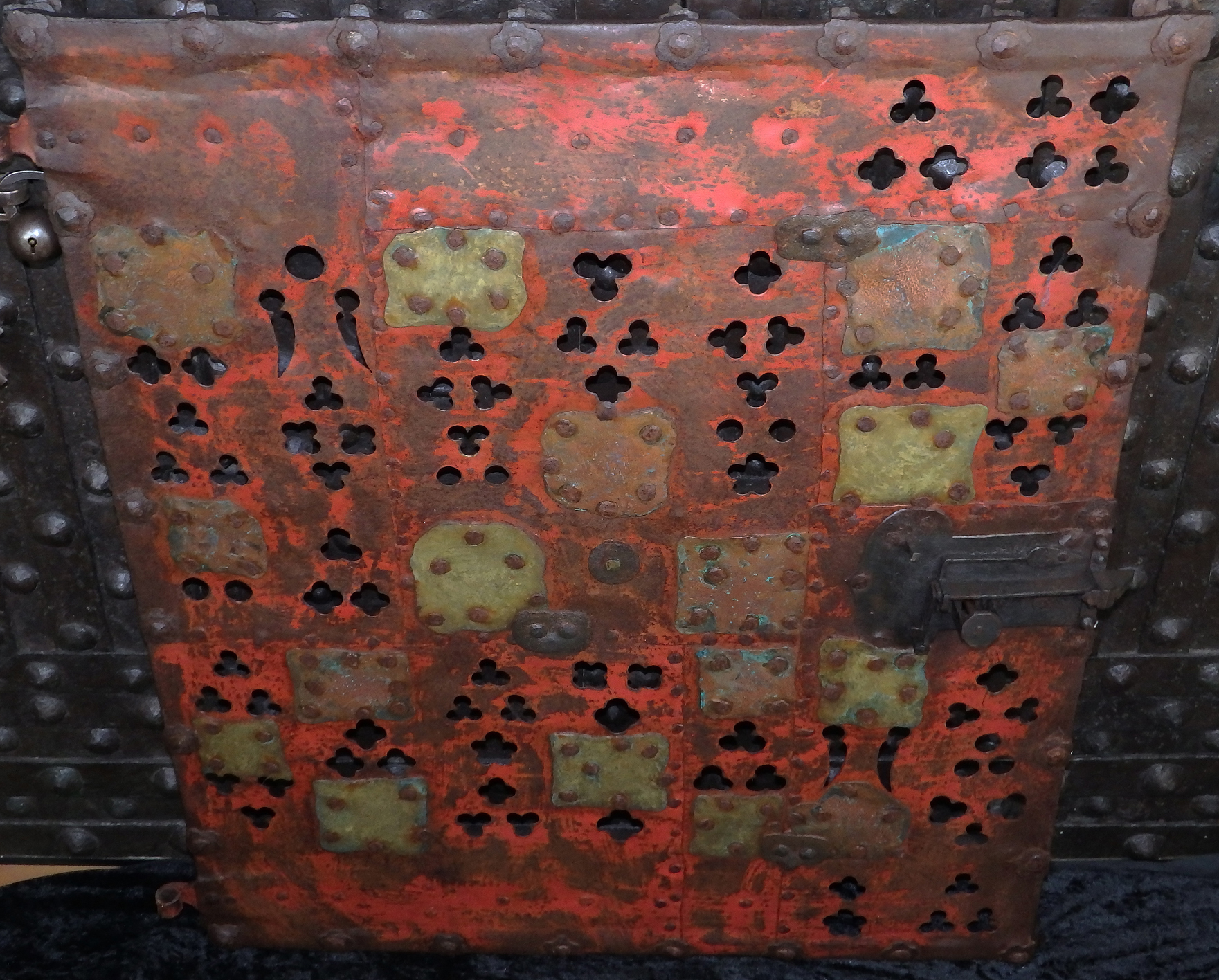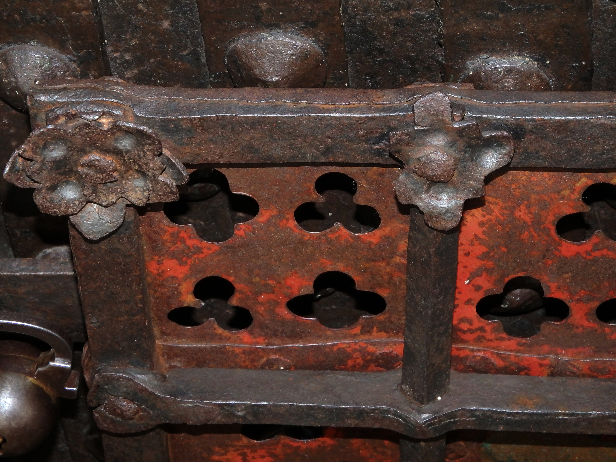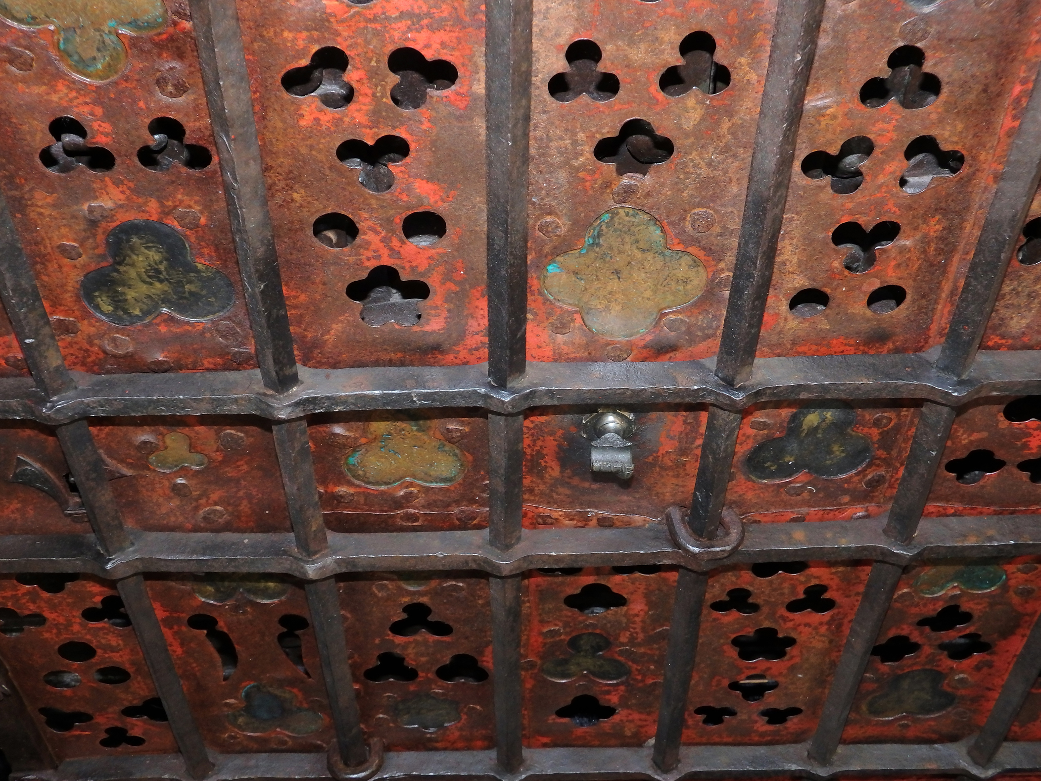 Massive rechteckige Gittertür aus gegrateten Stäben mit gesteckten Verbindungen. Am Rand umlaufend vernietete Zierblüten. Schauseitig in der Mitte angebrachte, abgebrochene Öse für einen Zugring. Das Gitter mit durchbrochen gearbeiteten, in Rot-Mennige gefassten Blech hinterlegt. Die dreipass- und lanzettförmigen Durchbrüche teilweise mit Messingblech hinterlegt. Rechts seitlich zwei massive Scharnierösen. Auf der linken Seite ein originales gotisches Schloss mit einem Riegel und V-förmiger Schlüsselführung.