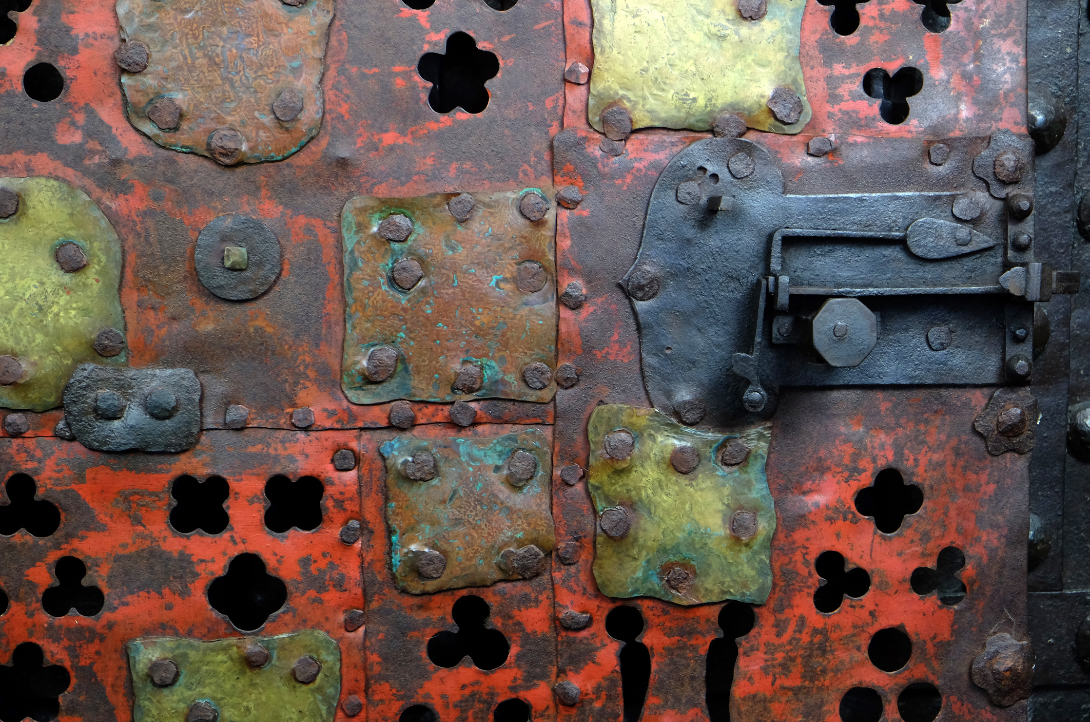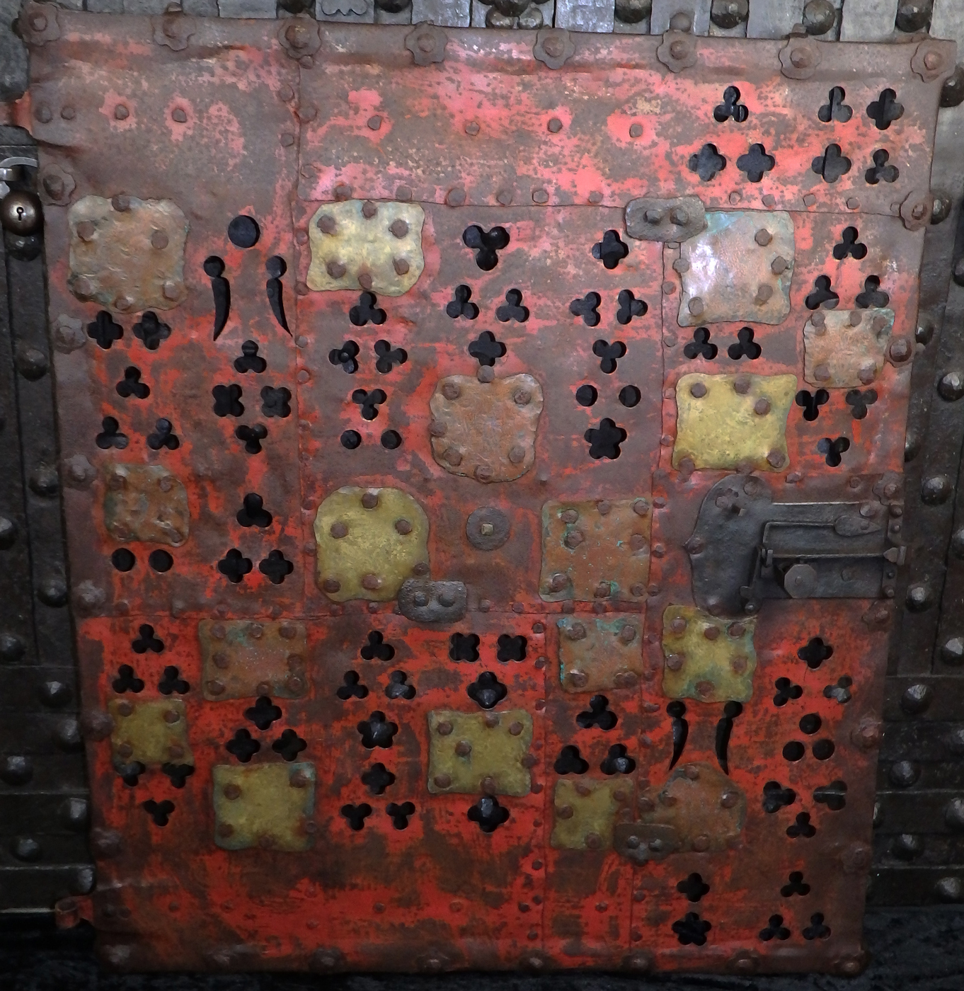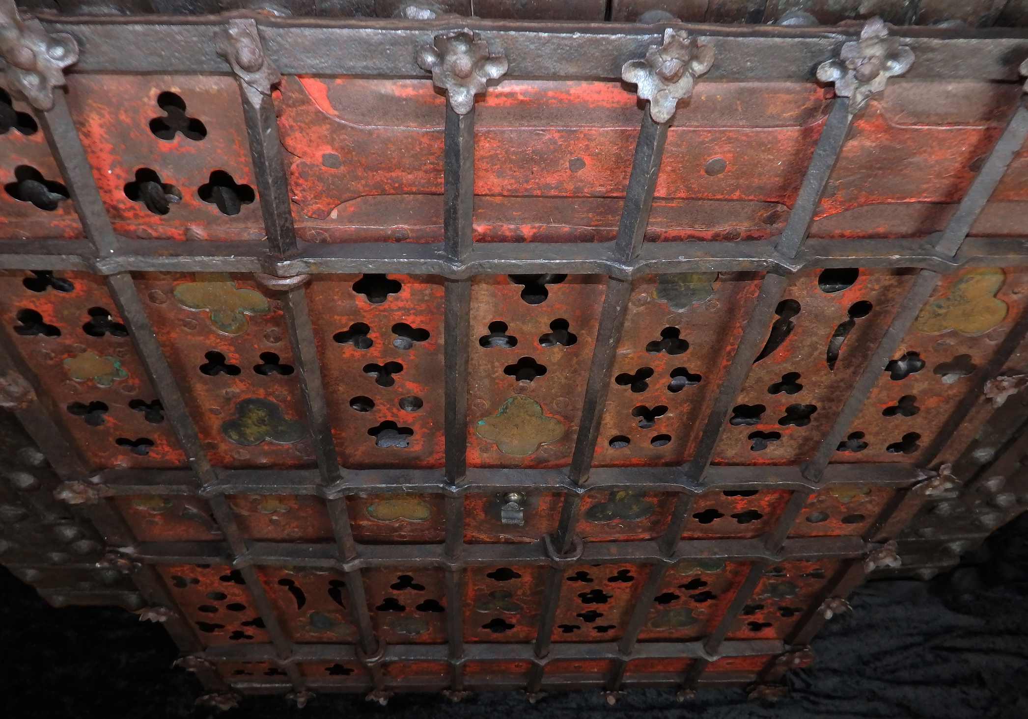 Massive rechteckige Gittertür aus gegrateten Stäben mit gesteckten Verbindungen. Am Rand umlaufend vernietete Zierblüten. Schauseitig in der Mitte angebrachte, abgebrochene Öse für einen Zugring. Das Gitter mit durchbrochen gearbeiteten, in Rot-Mennige gefassten Blech hinterlegt. Die dreipass- und lanzettförmigen Durchbrüche teilweise mit Messingblech hinterlegt. Rechts seitlich zwei massive Scharnierösen. Auf der linken Seite ein originales gotisches Schloss mit einem Riegel und V-förmiger Schlüsselführung.