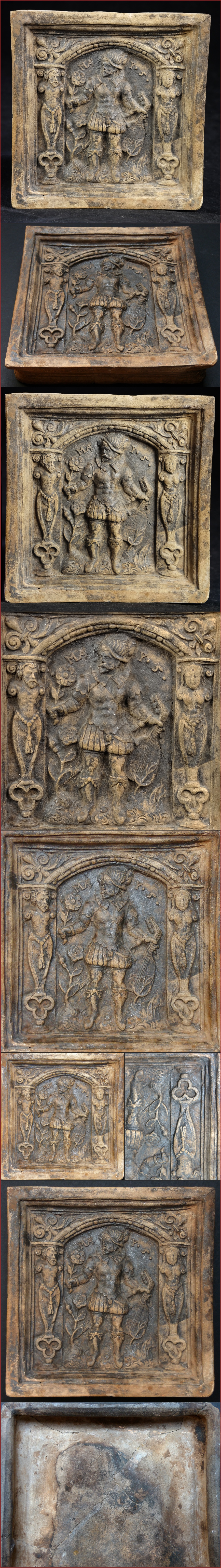 In dieser Erhaltung und Vollständigkeit sehr seltene Keramikkachel. In einem reliefierten Torbogen stehender Musikant typischer Tracht der Zeit mit Laute und Blume. Auf Kopfhöhe das Monogramm „MAY 5“. Offensichtlich aus einer Monatsfolge von zwölf Kacheln stammende Kachel 5 für den Monat Mai.