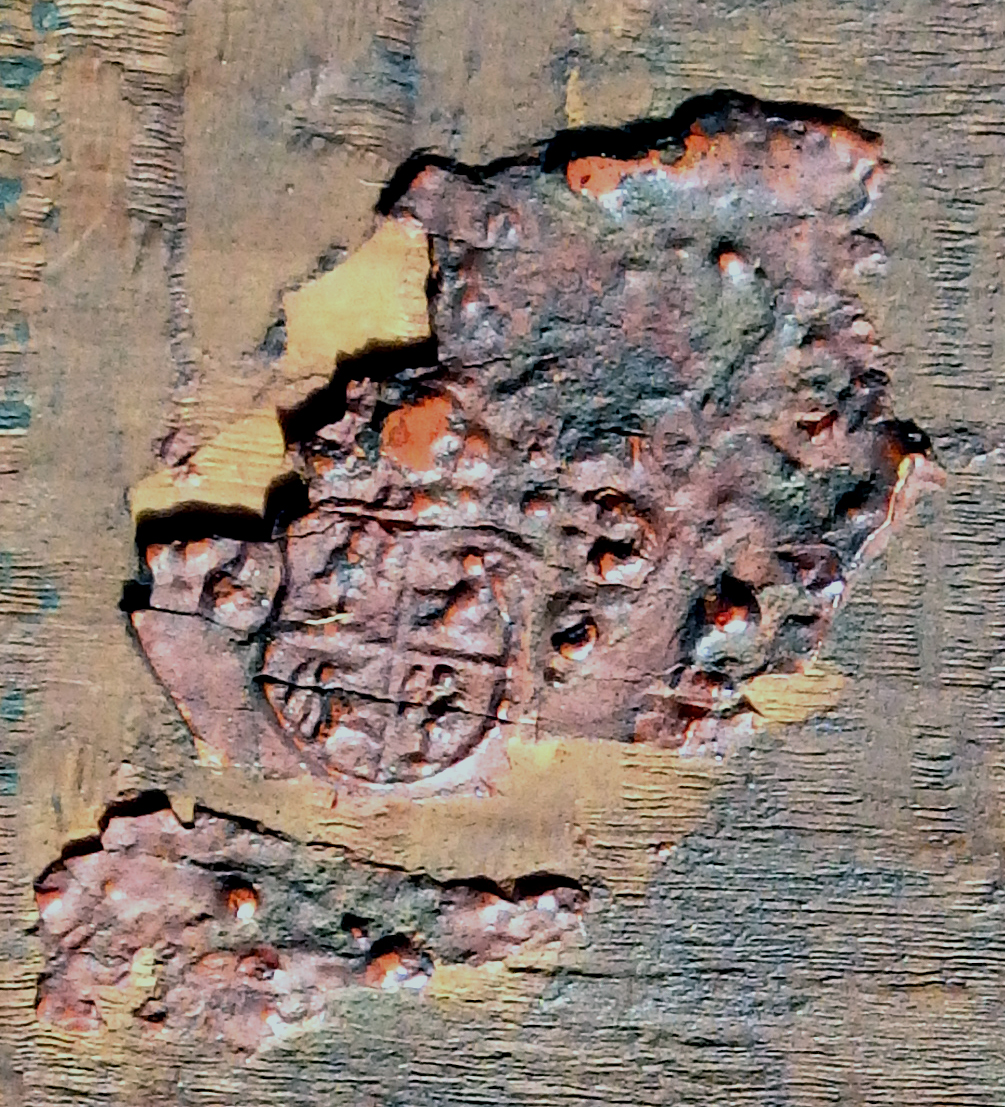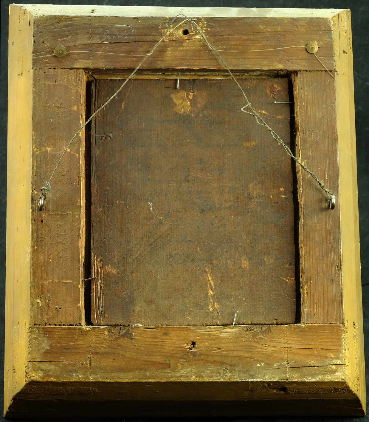 Die Holzplatte ist rückseitig mit alter Hand (wohl 19. Jhdt.) in Bleistift bezeichnet mit Zuschreibung, Lebensdaten und rechts oben mit Monogramm „AG“ (siehe J.F. Christen, Leipzig, 1747 S. 90). Der Text schien zunächst unleserlich, konnte von uns jedoch nach der Digitalisierung mit Hilfe farbspektraler Veränderungen lesbar gemacht werden. Er lautet: „gemalt von / Aldegrever, Heinrich / auch / Albert von Westfalen / genannt / geboren 1502 / zu Soest / gest. 1562 daselbst / letzter Schüler von / Albrecht Dürer.“