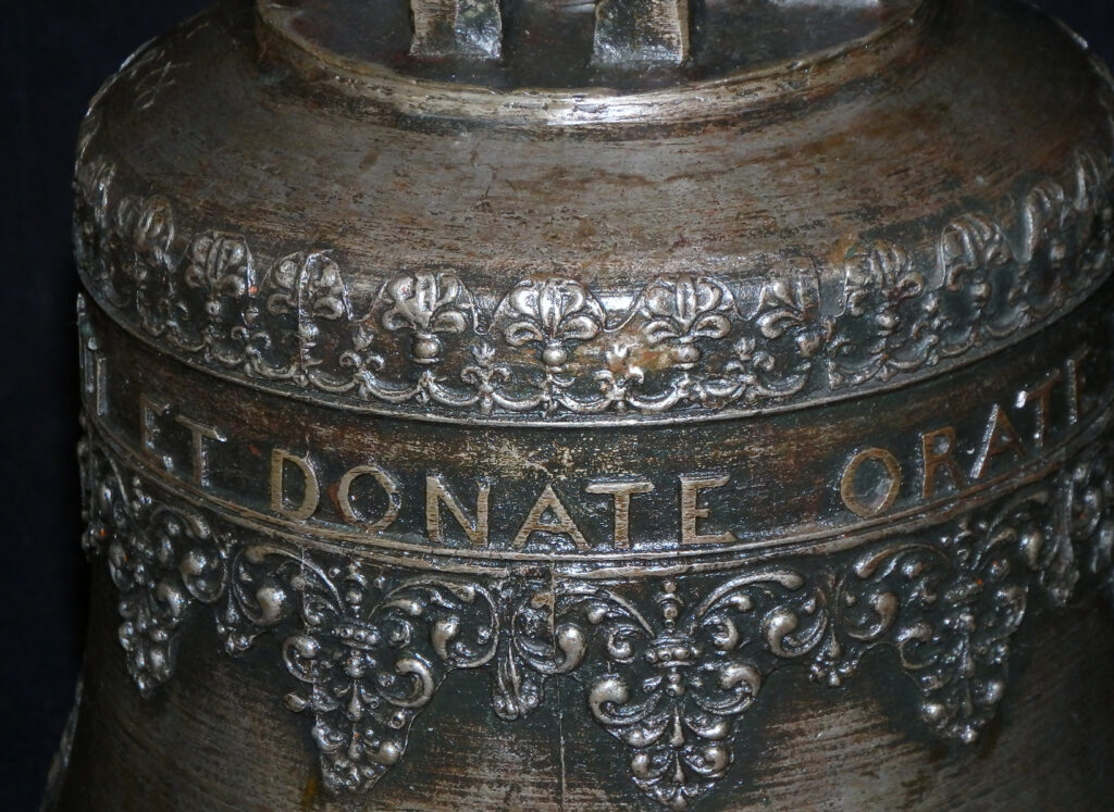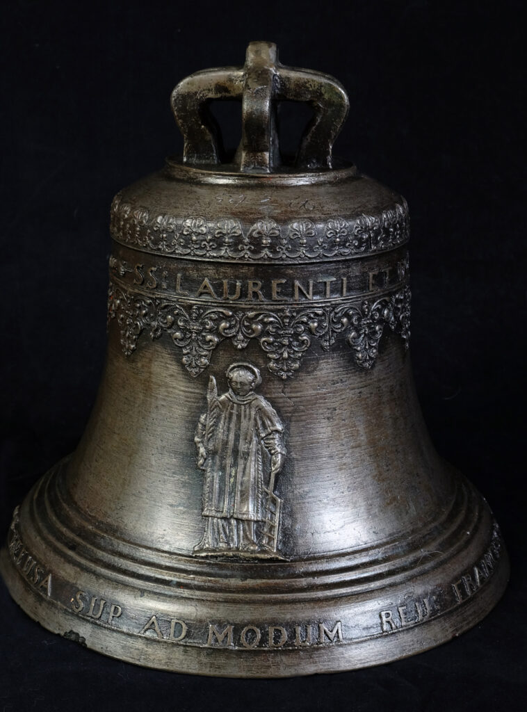Hervorragendes Exemplar einer äußerst seltenen Kapellenglocke mit reichen Verzierungen und Beschriftungen. Hals mit umlaufendem Palmettenfries. Obere Flanke mit umlaufendem Rautengerank. Krone mit acht geschwungenen Henkeln. Unterer Hals umlaufend beschriftet: „SS: LAURENTI ET DONATE ORATE PRONOBIS“. Schlag mit umlaufender Beschriftung: „REFUSA SUP AD MODUM REU: FRANCISCO IOS: SWOPODA P:T:B: CVRATO 1718“. Die Flanke vorn mit der Abbildung des Heiligen Laurentius, in den Händen Folterrost und Märyrerpalme haltend. Der Heilige Laurentius war ein römischer Diakon zur Zeit des Papstes Sixtus II. und starb als Märtyrer. Er wird in mehreren Konfessionen als Heiliger verehrt. Sein Fest in der römisch-katholischen, der orthodoxen, der anglikanischen und der evangelischen Kirche ist der 10. August. Flanke hinten mit Abbildung eines Bischofs mit Bischofstab und Buch. Oberplatte mit für uns nicht identifizierbaren Gießerzeichen und der Zahlenangabe 54 ¾. Die Glocke verfügt über einen hellen, lang anhaltenden Klang und funktioniert einwandfrei.