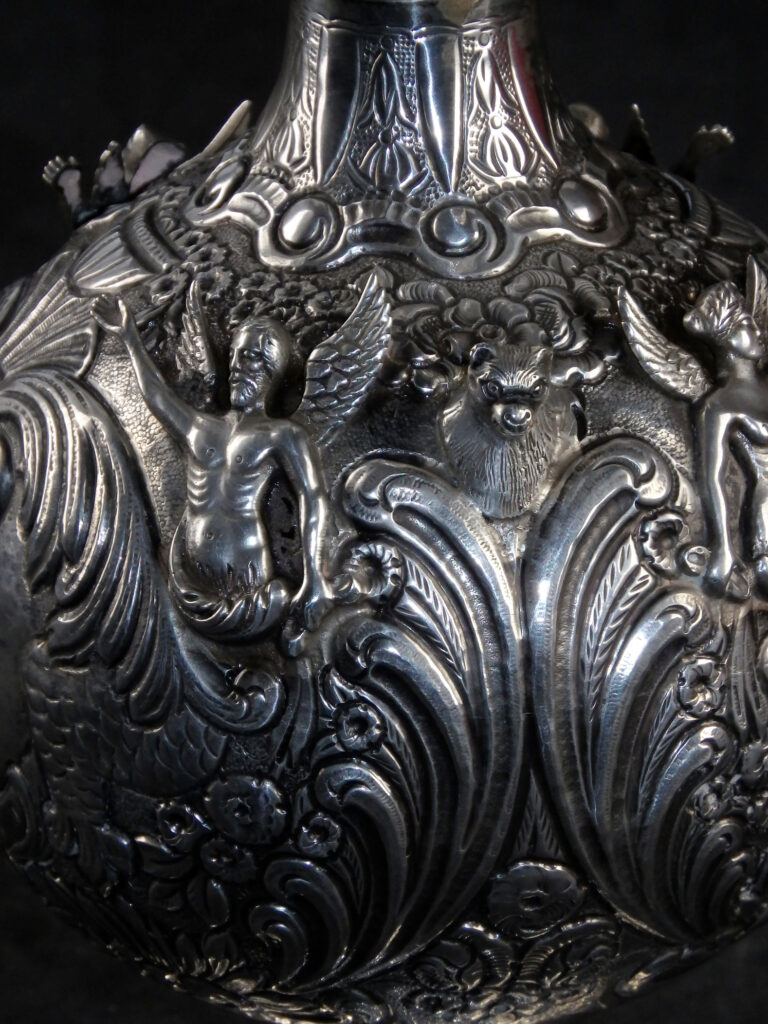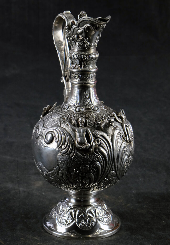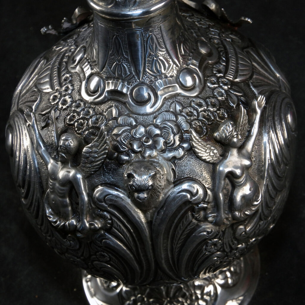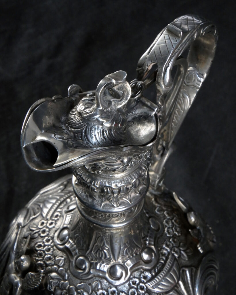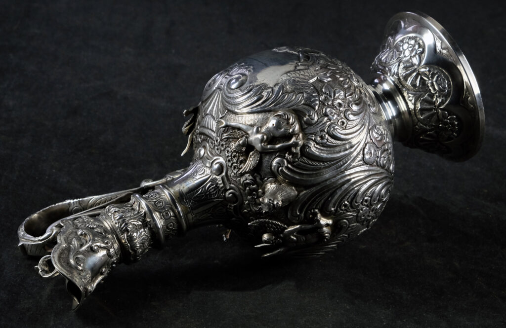 Große, außergewöhnlich prunkvolle Schankkanne. Kugelförmiger Korpus mit schlankem Hals, hohem Spangenhenkel und gedeckeltem, helmförmigen Ausguss auf glockenförmig ausgestelltem Stand. Deckel beweglich mittels Hebel im Henkel. Im gesamten reich dekoriert mit Figuren, Maskaronen, Rocaillen, Muscheln, Laubwerk, Blüten und Behangborten. Korpus und Fuß mit getriebenem Dekor in Repoussétechnik sowie montierten Figuren. Hals, Henkel und Ausguss mit gegossenem Dekor.
