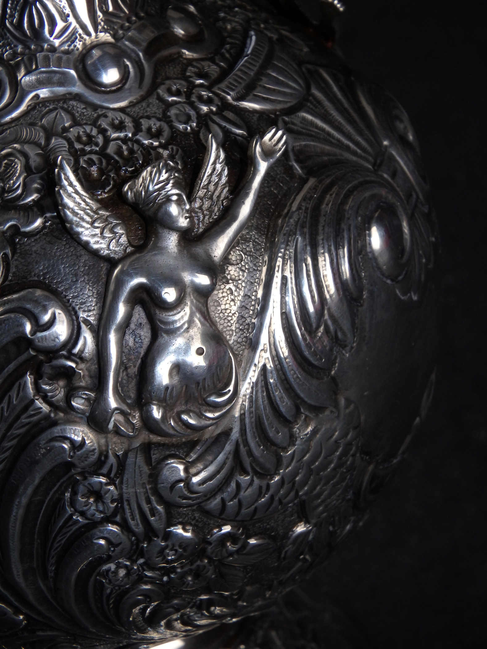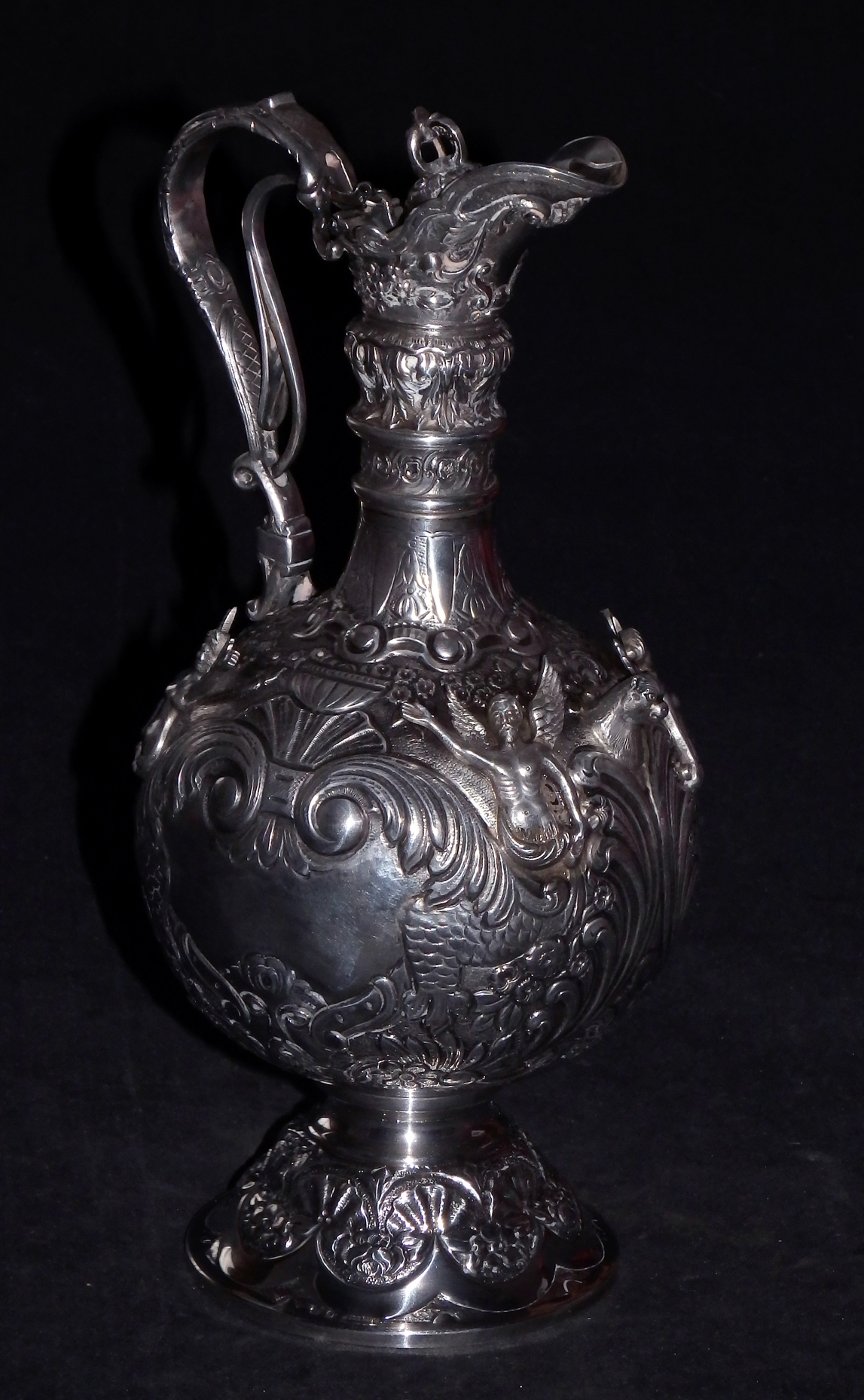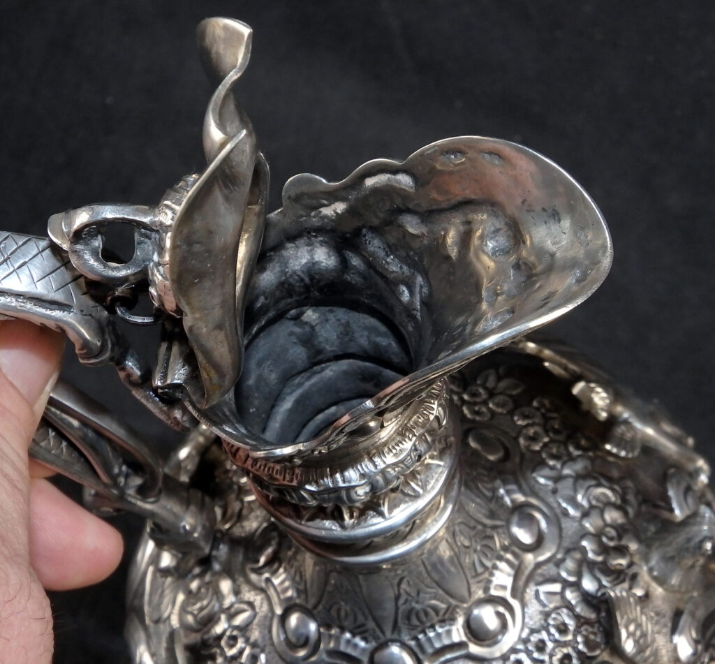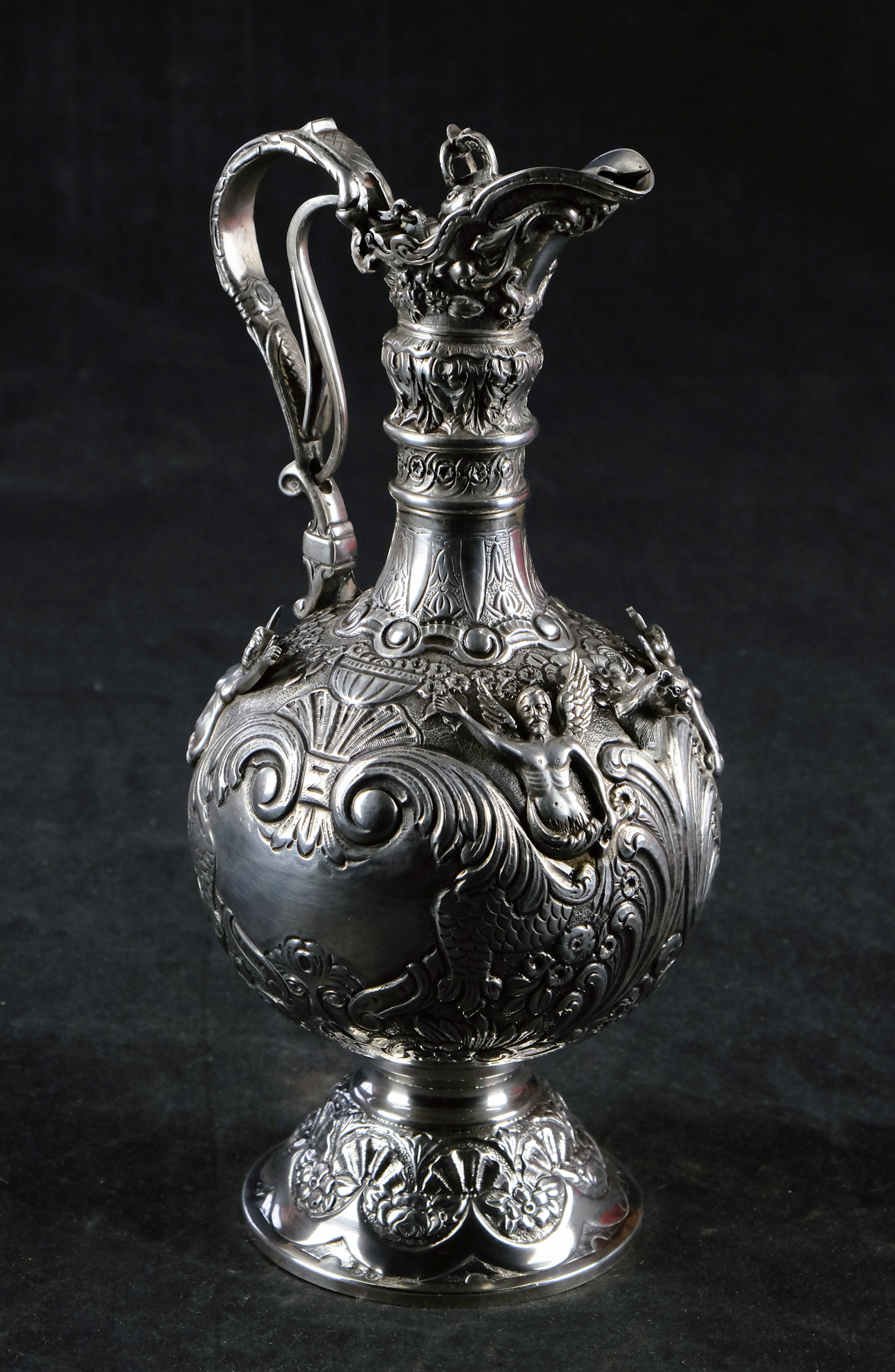 Große, außergewöhnlich prunkvolle Schankkanne. Kugelförmiger Korpus mit schlankem Hals, hohem Spangenhenkel und gedeckeltem, helmförmigen Ausguss auf glockenförmig ausgestelltem Stand. Deckel beweglich mittels Hebel im Henkel. Im gesamten reich dekoriert mit Figuren, Maskaronen, Rocaillen, Muscheln, Laubwerk, Blüten und Behangborten. Korpus und Fuß mit getriebenem Dekor in Repoussétechnik sowie montierten Figuren. Hals, Henkel und Ausguss mit gegossenem Dekor.