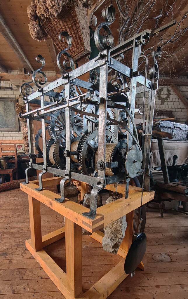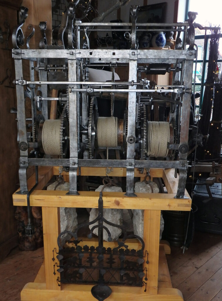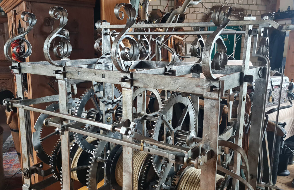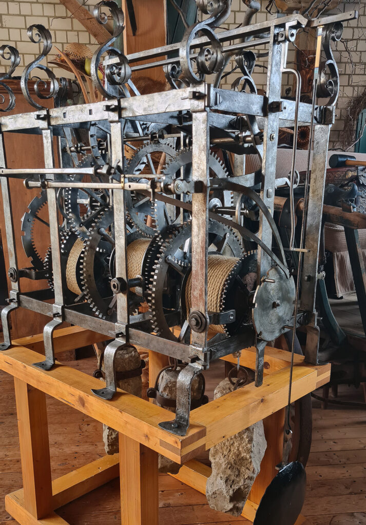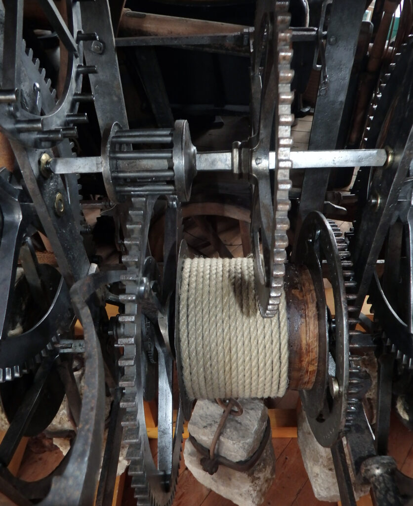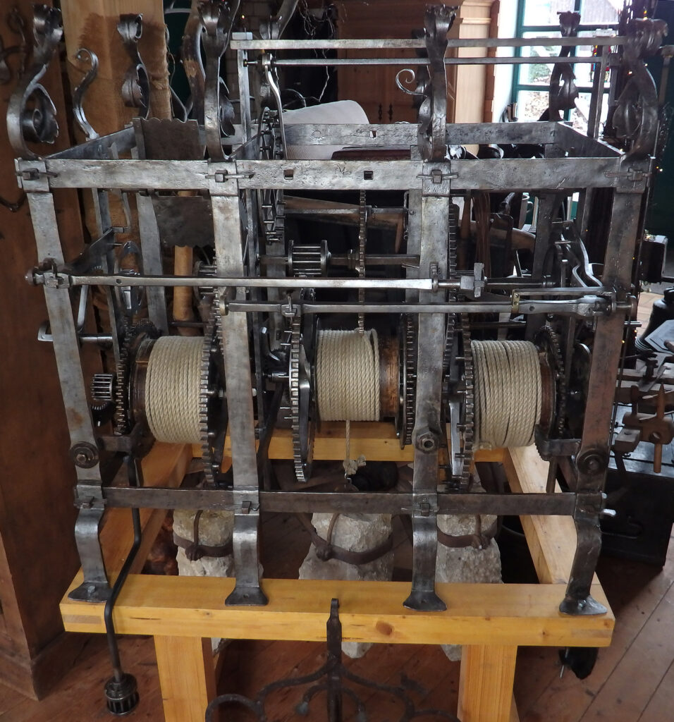 Angetrieben werden die Zahnräder von drei Aufzugswalzen mit drei in Eisenkäfigen gelagerten Steingewichten. Die Holzwalzen sind im restaurierten Originalzustand vorhanden. Das Gehwerk läuft perfekt und ist komplett und mit sämtlichen mechanischen „Anbindungen“ an das hier nicht vorhandene Equipment wie Ziffernblatt und Schlagwerk mit Glocke. Das Pendel ist zum größten Teil mit noch originalen Teilen des 18. Jahrhunderts vorhanden. Lediglich die Schwungfeder ist neueren Datums.