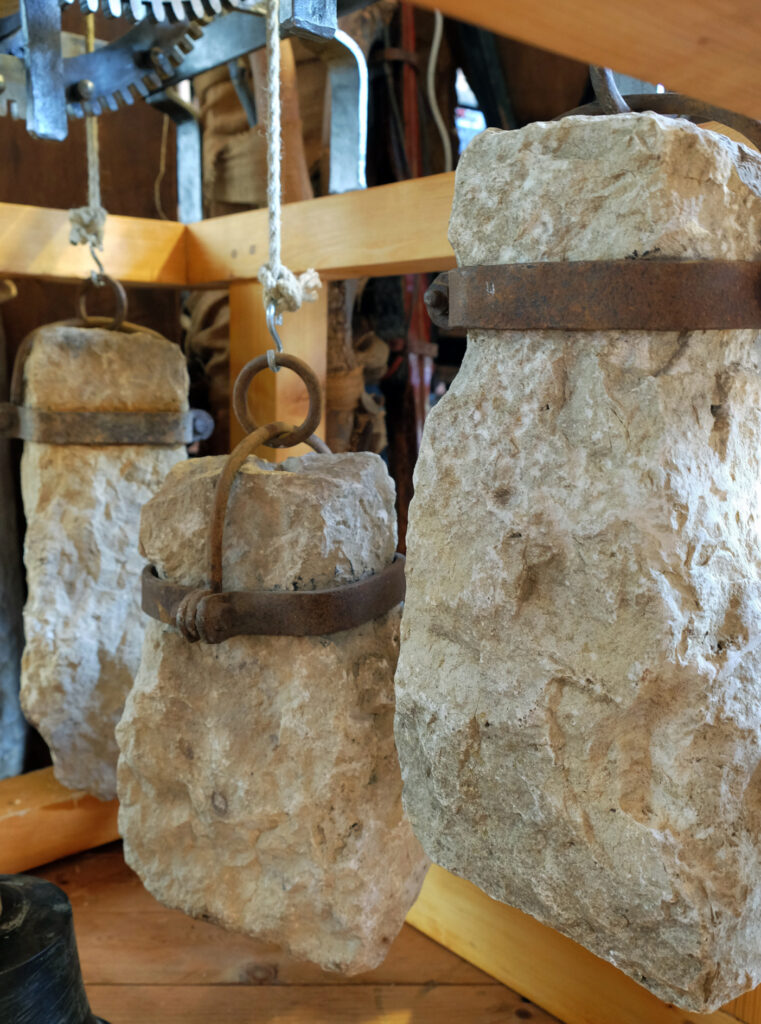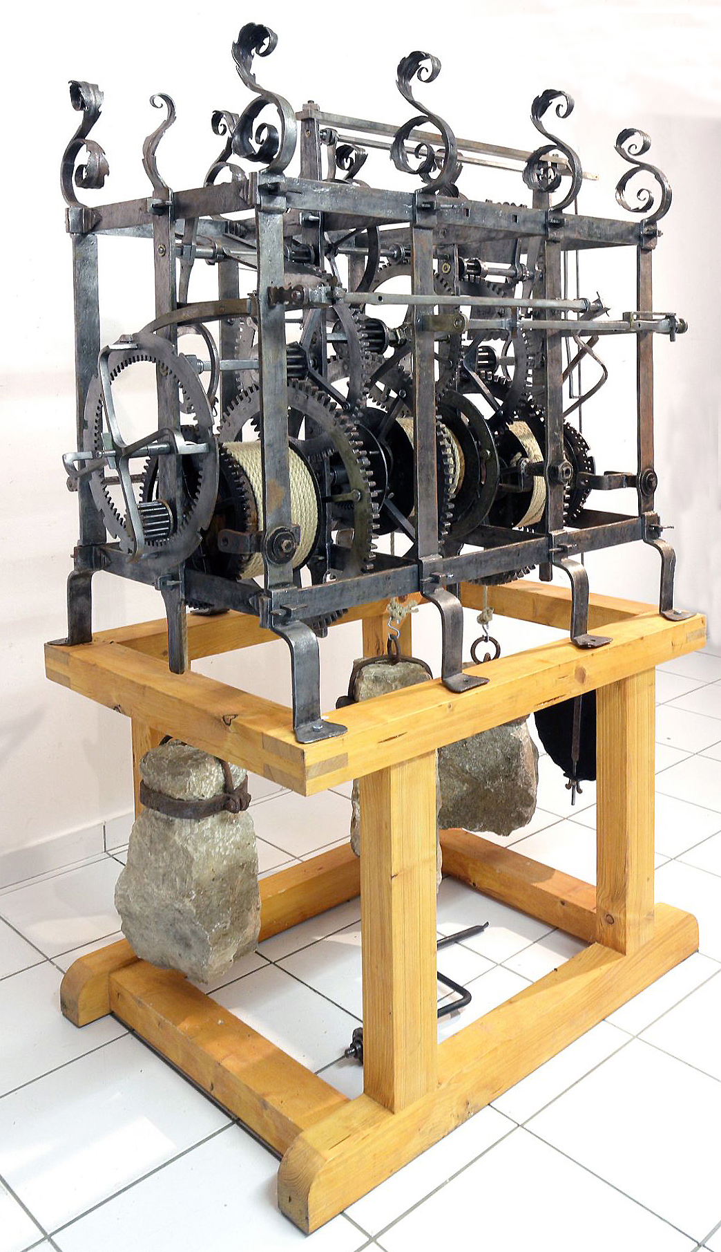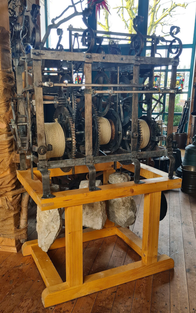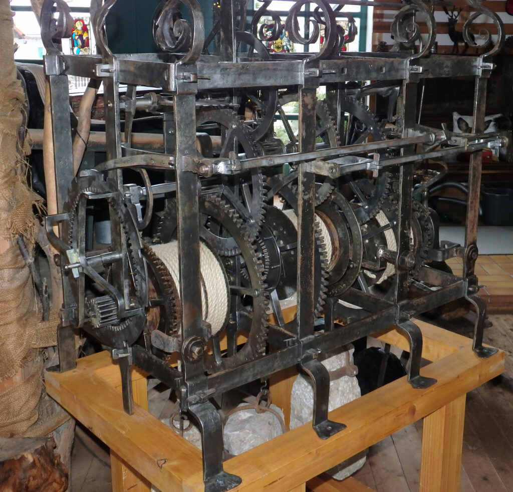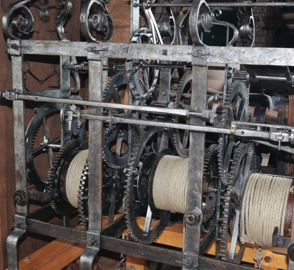Angetrieben werden die Zahnräder von drei Aufzugswalzen mit drei in Eisenkäfigen gelagerten Steingewichten. Die Holzwalzen sind im restaurierten Originalzustand vorhanden. Das Gehwerk läuft perfekt und ist komplett und mit sämtlichen mechanischen „Anbindungen“ an das hier nicht vorhandene Equipment wie Ziffernblatt und Schlagwerk mit Glocke. Das Pendel ist zum größten Teil mit noch originalen Teilen des 18. Jahrhunderts vorhanden. Lediglich die Schwungfeder ist neueren Datums.