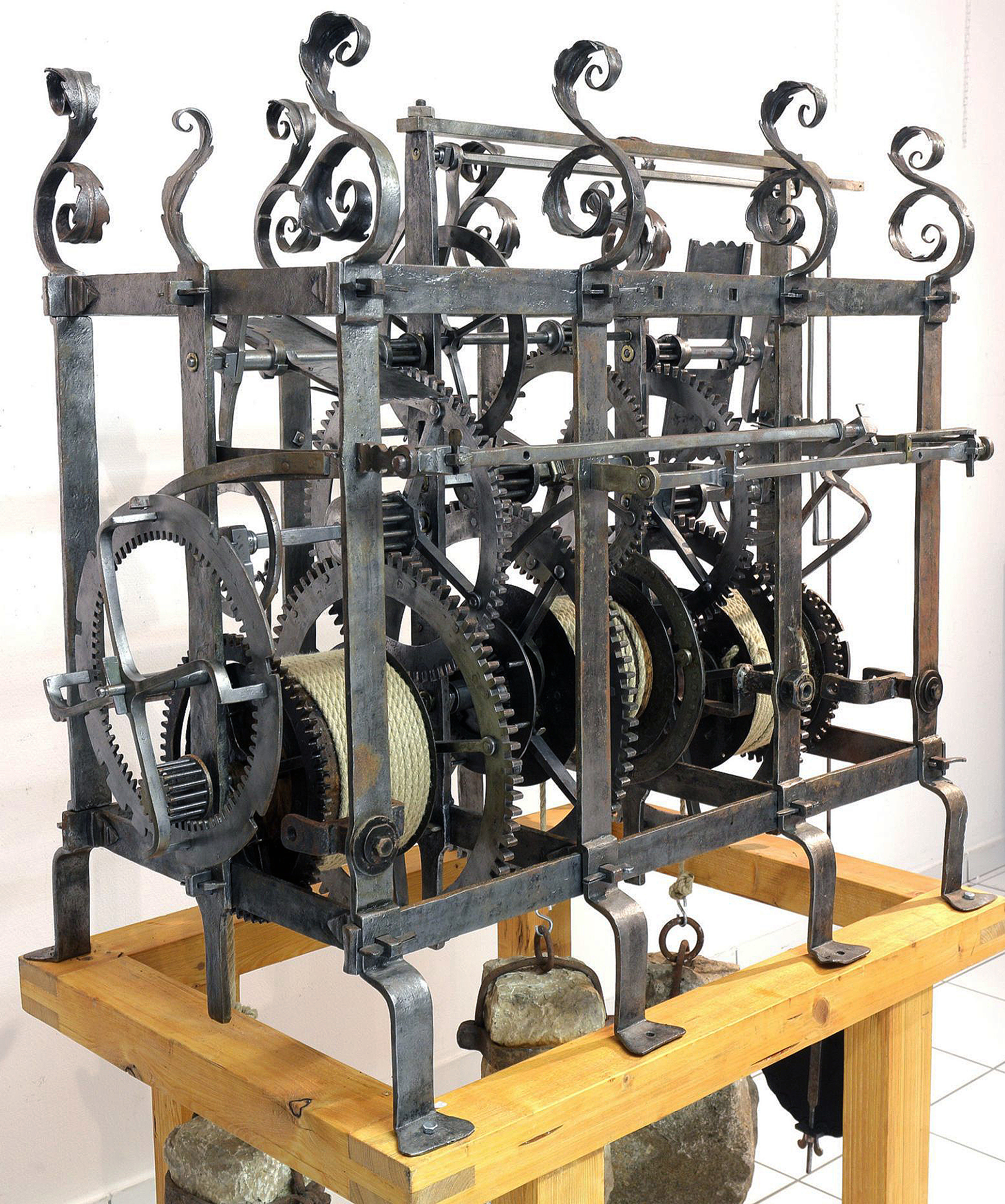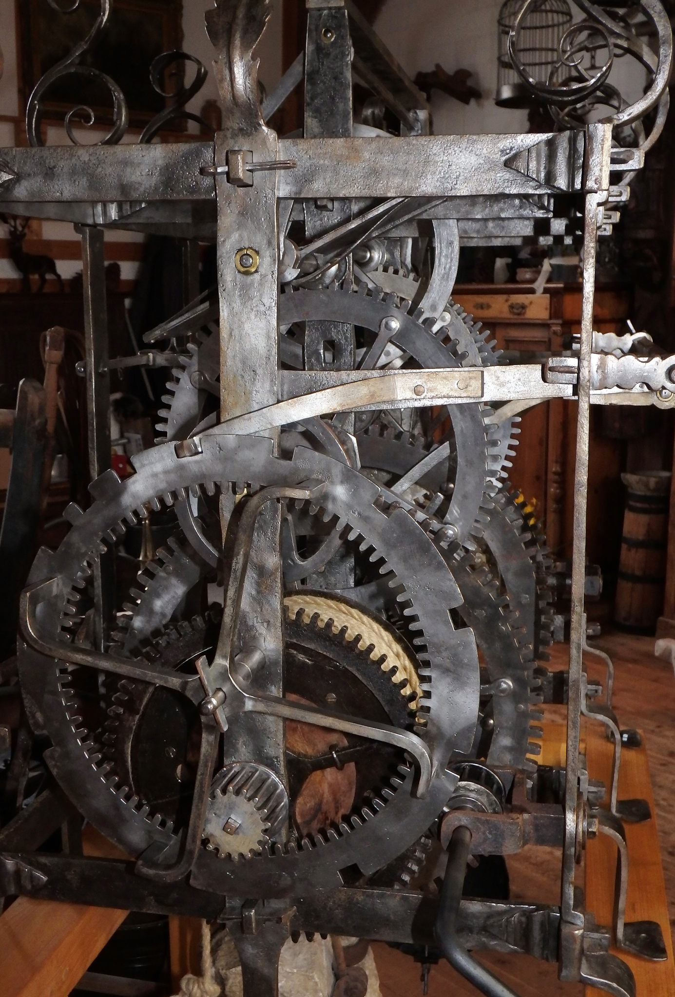 Frühes und in diesem hervorragenden Zustand und Ausstattung unikales, monumentales Turmuhrwerk welches seinesgleichen sucht. Käfig, Gehwerk, Zahnräder und Pfeiler aus geschmiedeten Eisen, gesteckt und versplintet. Das Werk ist komplett zerlegbar. Mittig das Gehwerk, welches ursprünglich wohl mit Spindelgang gestaltet und im 18. Jahrhundert auf Schergang umgerüstet wurde.