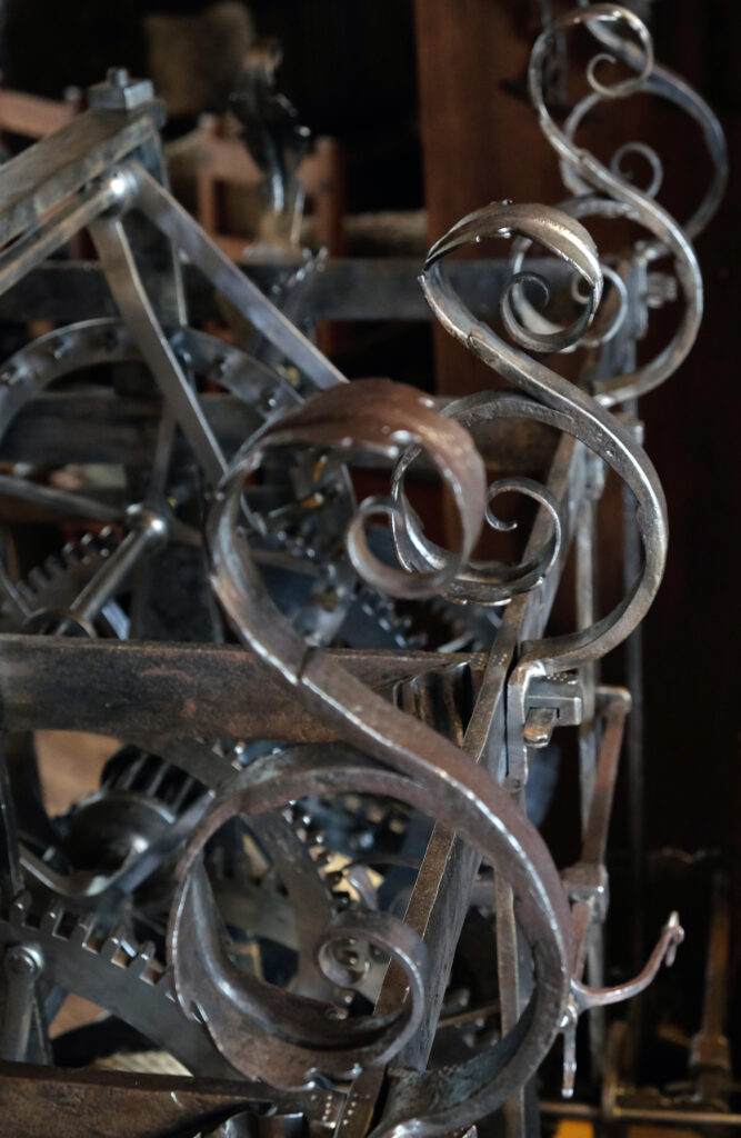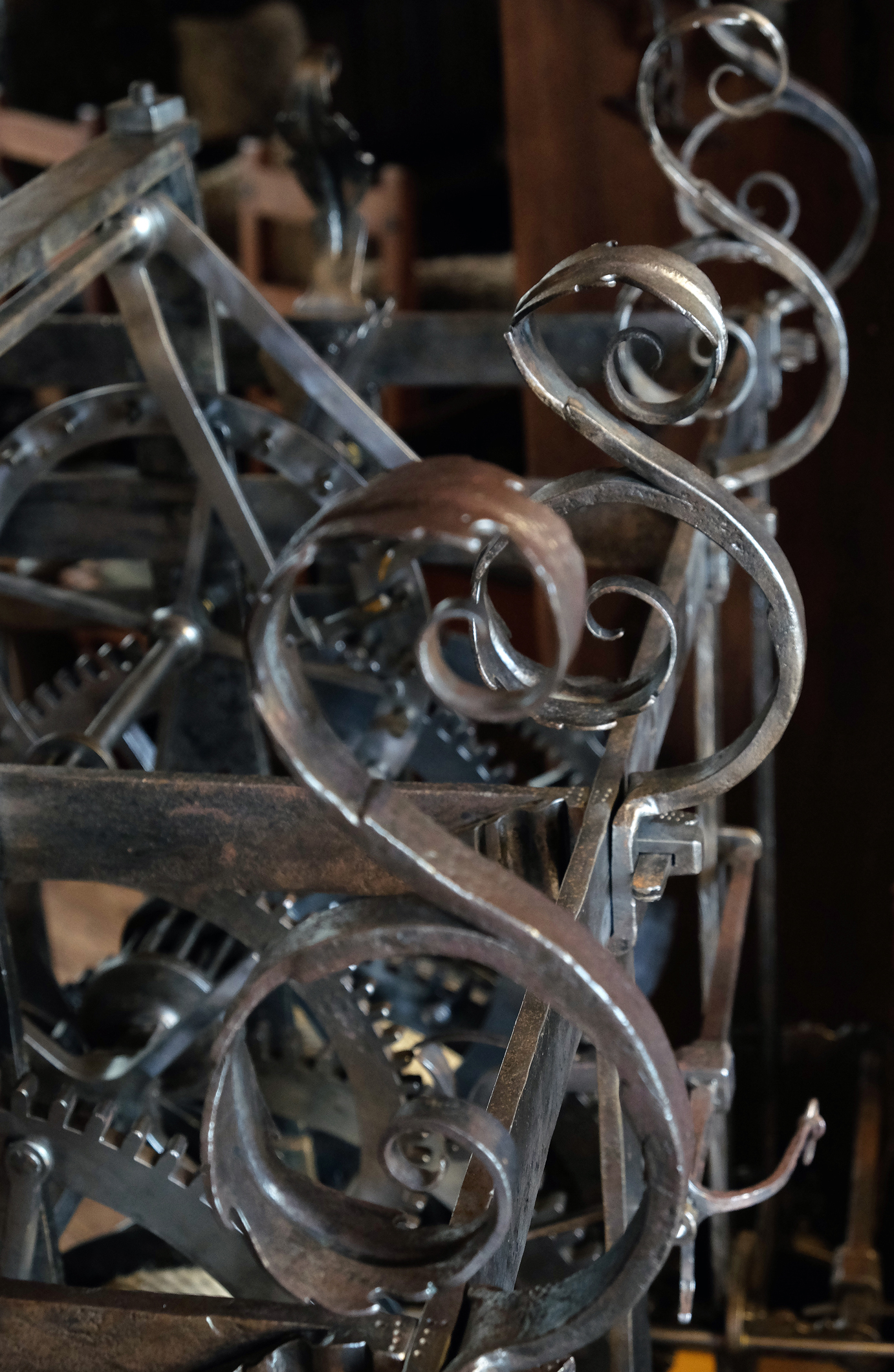 Besonders herausragend sind die ungewöhnlich prachtvoll geschmiedeten Pfeiler, welche oben mit geschwungenem Akanthusabschluss gestaltet wurden. Wir finden hier keine vergleichbaren Stücke, da derartige Uhrwerke eher schlicht und funktionalistisch gestaltet wurden, da sie meist in den schwer begehbaren Türmen nicht sichtbar waren und somit nicht repräsentieren mussten.