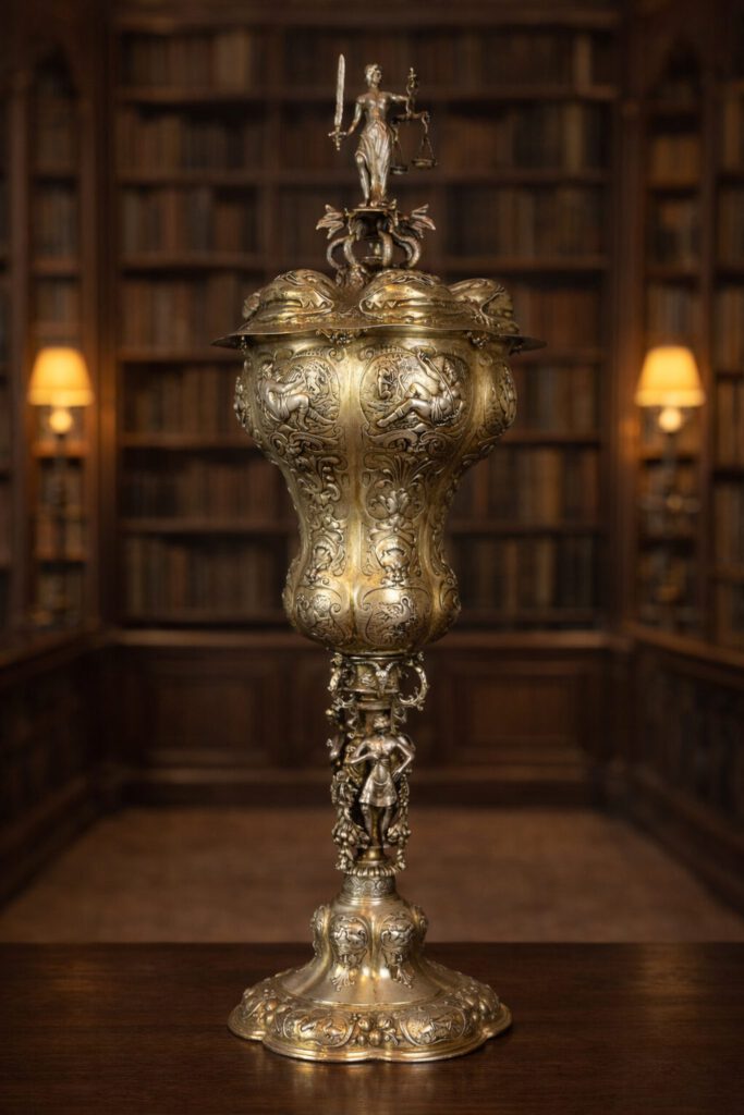 Gefertigt um 1895 bei B. Neresheimer & Söhne in Hanau nach dem Original, wohl von Johannes Rappolt um 1623 in Hanau entstanden. Das Original wird in der Dauerausstellung des Historischen Museums Hanau in Schloss Philippsruhe gezeigt. Eine meisterliche Kopie dieses 63,5 cm hohen Prachtpokals finden Sie bei uns.